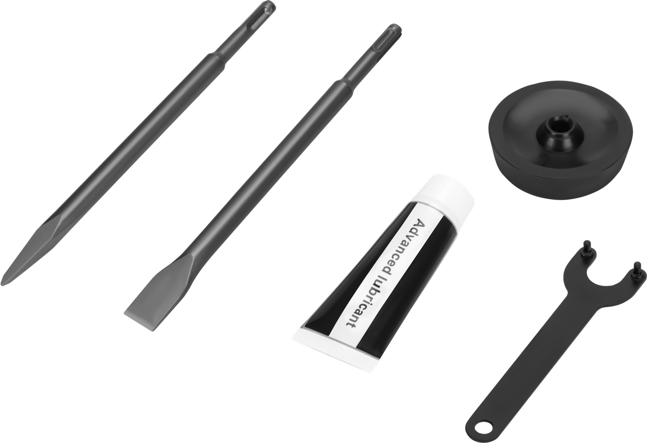 Płynna regulacja liczby uderzeń (do 4500/min) umożliwia dostosowanie intensywności pracy do konkretnego materiału i zadania — niższe obroty przy precyzyjnym wykuwaniu instalacji, wyższe przy szybkiej rozbiórce. Zmniejsza to ryzyko uszkodzenia delikatniejszych podłoży.