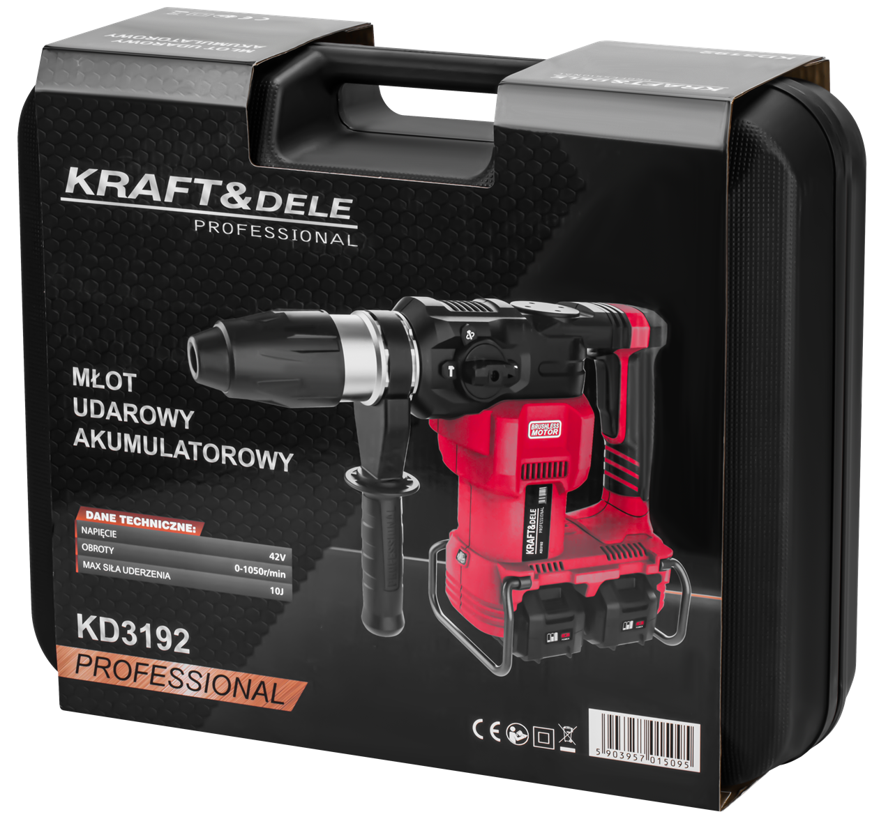 KD3192 to bezszczotkowy młot udarowy zasilany dwoma akumulatorami 21V połączonymi szeregowo, co daje efektywne napięcie robocze 42V. Urządzenie przeznaczone jest do wiercenia i kucia w betonie, cegle oraz kamieniu, a trzy tryby pracy pozwalają na jego zastosowanie również przy materiałach niewymagających udaru.