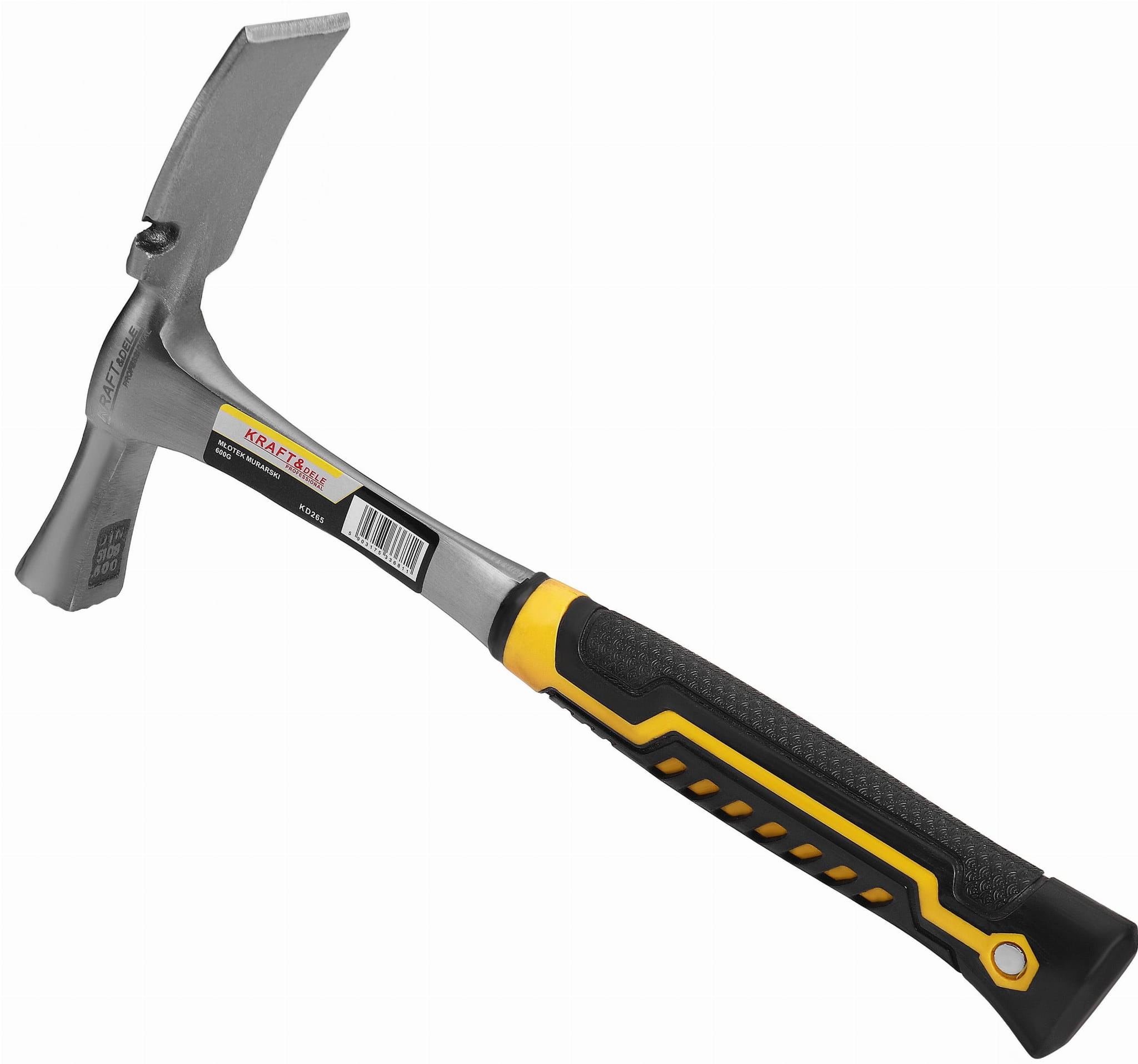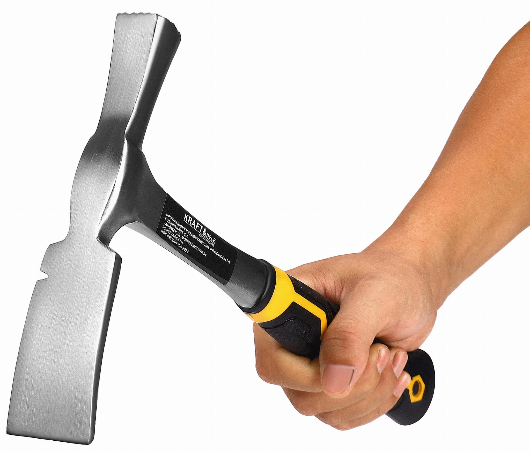 Młotek murarski KD265 to narzędzie wykonane z jednoczęściowego odlewu stalowego, przeznaczone do prac murarskich, kamieniarskich i ciesielskich. Waga 600 g oraz geometria obucha z wcięciem w kształcie litery V sprawiają, że narzędzie sprawdza się zarówno przy kuciu i rozłupywaniu, jak i przy wyciąganiu gwoździ.