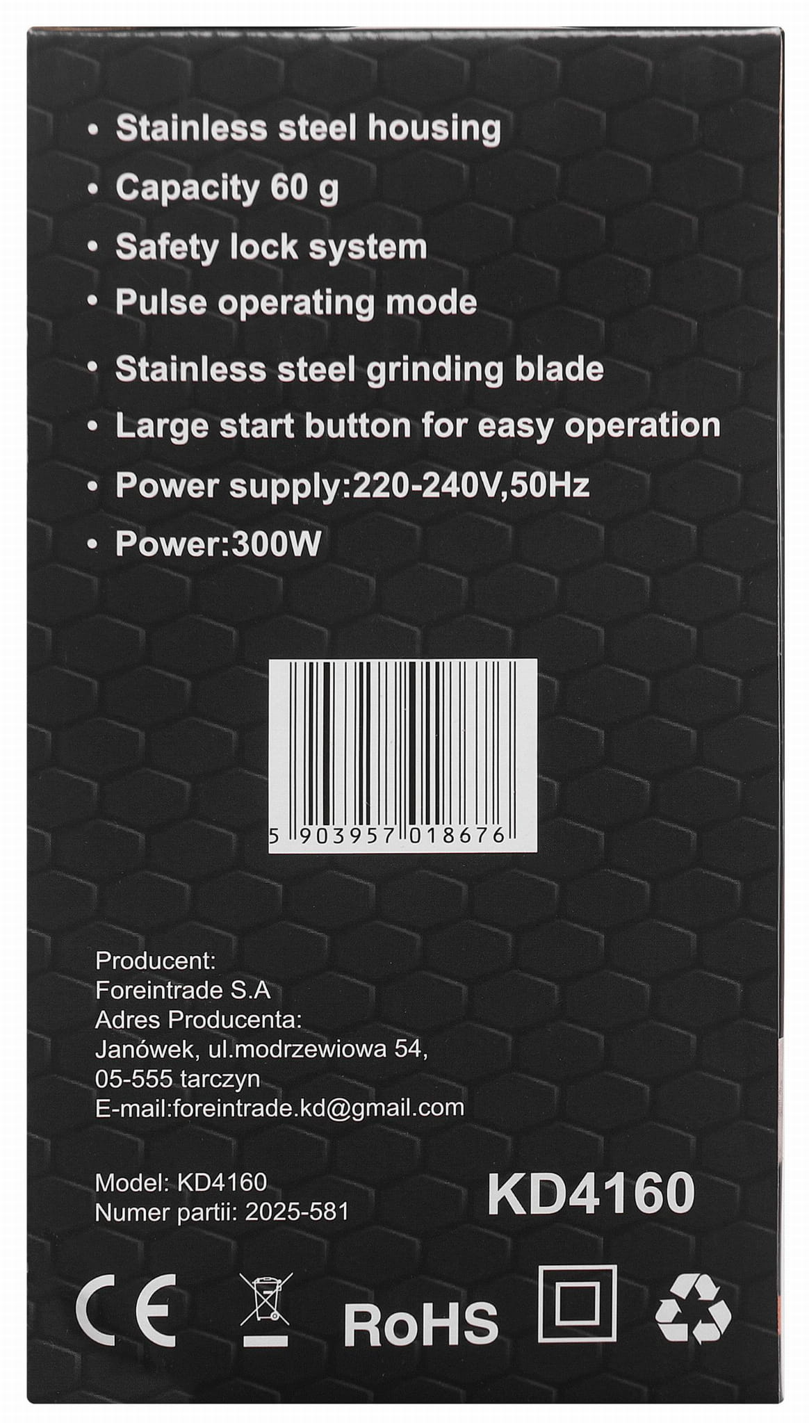 KD4160 to elektryczny młynek ostrzowy zasilany mocą 300 W, przeznaczony do mielenia ziaren kawy na potrzeby domowego parzenia. Obudowa i ostrze wykonane ze stali nierdzewnej, tryb pracy pulsacyjnej oraz blokada pokrywy to główne cechy wyróżniające to urządzenie spośród podstawowych modeli klasy budżetowej.