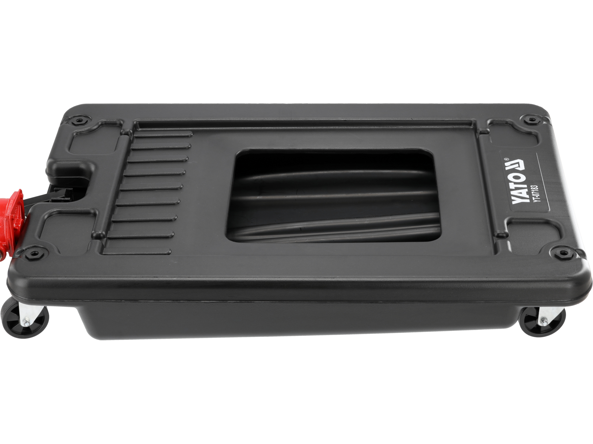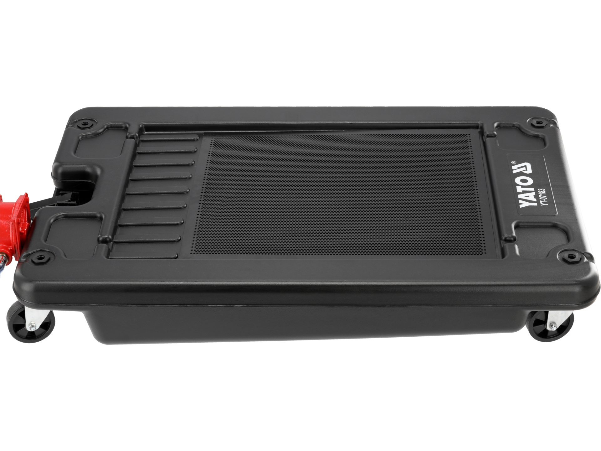 Wysokość od podłoża wynosząca 185 mm pozwala na wjazd pod pojazdy sportowe i samochody z obniżonym zawieszeniem bez konieczności podnoszenia na podnośniku. Parametr szczególnie istotny w warsztatach obsługujących różne typy pojazdów, gdzie dostęp do przestrzeni pod samochodem bywa ograniczony.