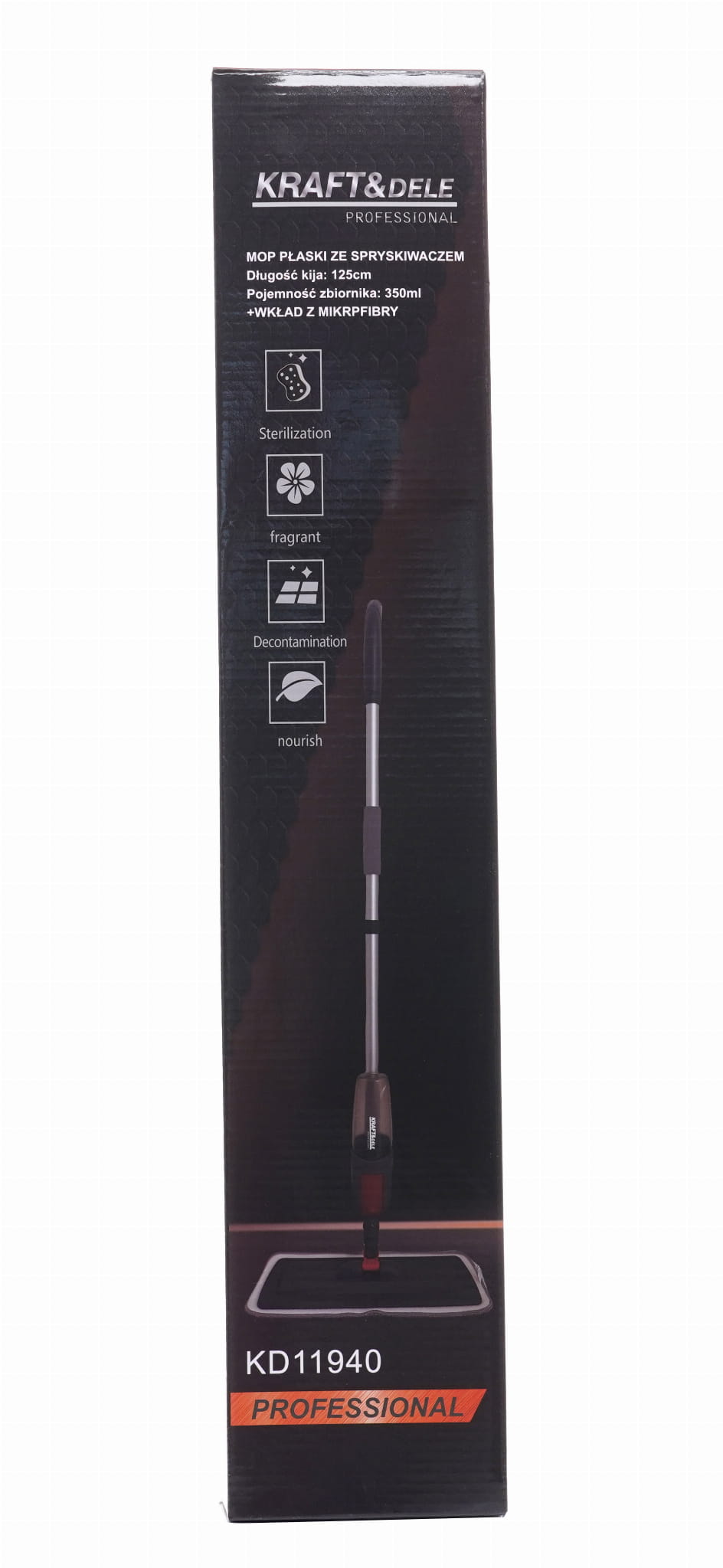 Mop ze zintegrowanym spryskiwaczem do mycia podłóg twardych — bez konieczności używania wiadra i moczenia nakładki. Płyn dozowany jest bezpośrednio z rękojeści przez wbudowaną pompkę, a nakładka z mikrofibry mocowana na rzep umożliwia szybką wymianę i pranie w pralce.