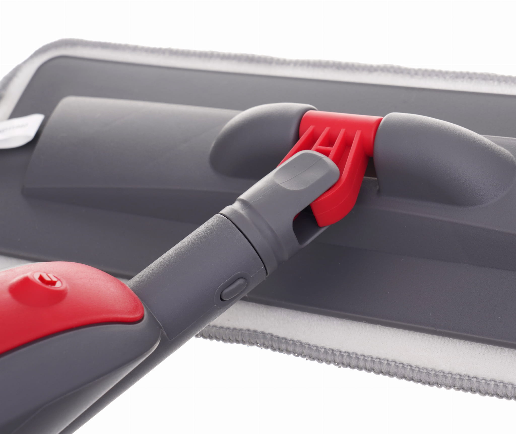 Przycisk wyzwalający natrysk umieszczony jest bezpośrednio na rączce, co eliminuje konieczność schylania się do zbiornika lub wiadra. Pompka wytwarza szeroką mgiełkę pokrywającą powierzchnię przed głowicą mopa, co pozwala równomiernie nawilżyć podłogę przed przeciągnięciem nakładki.