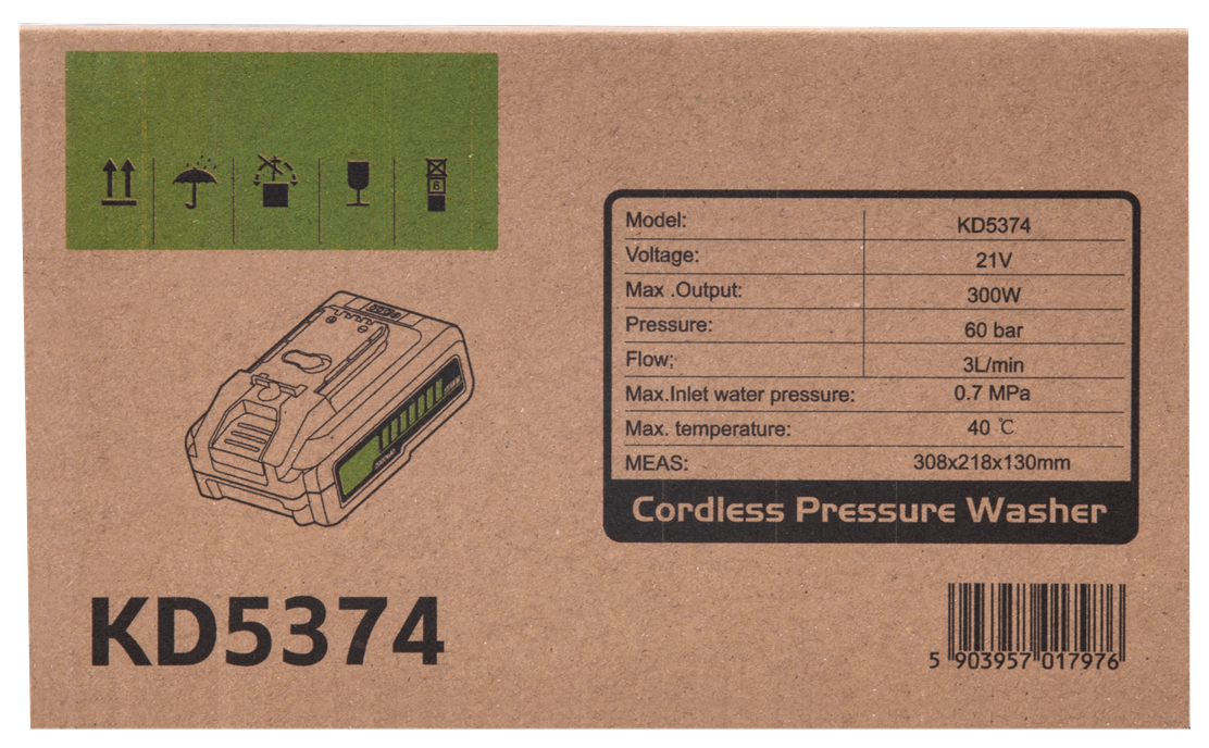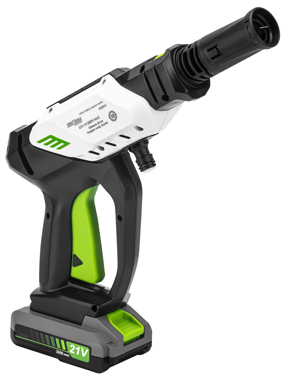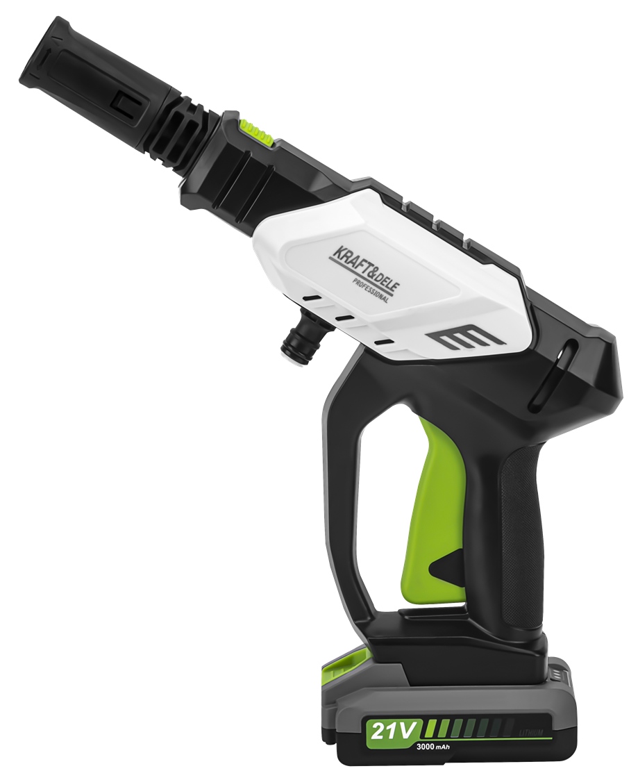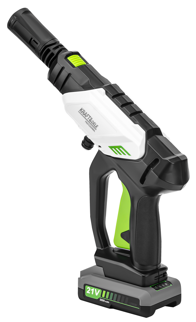 KD5374 to bezprzewodowa myjka ciśnieniowa zasilana akumulatorem litowo-jonowym 21V 3Ah. Umożliwia mycie ciśnieniowe w miejscach bez dostępu do gniazdka elektrycznego — na parkingu, kempingu, działce czy w terenie. Silnik o mocy 300W generuje ciśnienie do 60 bar, co wystarcza do usuwania zabrudzeń z karoserii, ram rowerowych, nawierzchni brukowych oraz sprzętu ogrodowego.