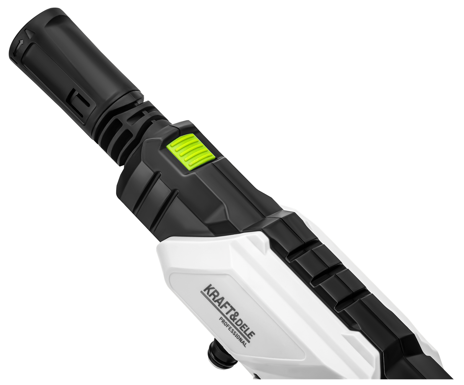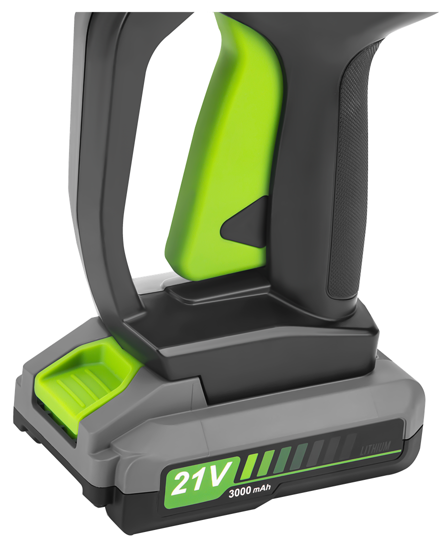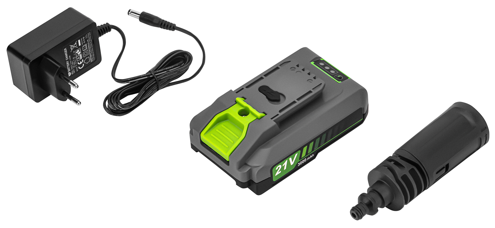 Ogniwa litowo-jonowe o pojemności 3000mAh zapewniają autonomię pracy bez konieczności podłączania do sieci. Napięcie 21V przekłada się na wystarczającą moc pompy do generowania ciśnienia roboczego 60 bar. Ładowarka wyposażona jest w diody LED sygnalizujące stan naładowania: czerwona — ładowanie w toku, zielona — akumulator gotowy do pracy.