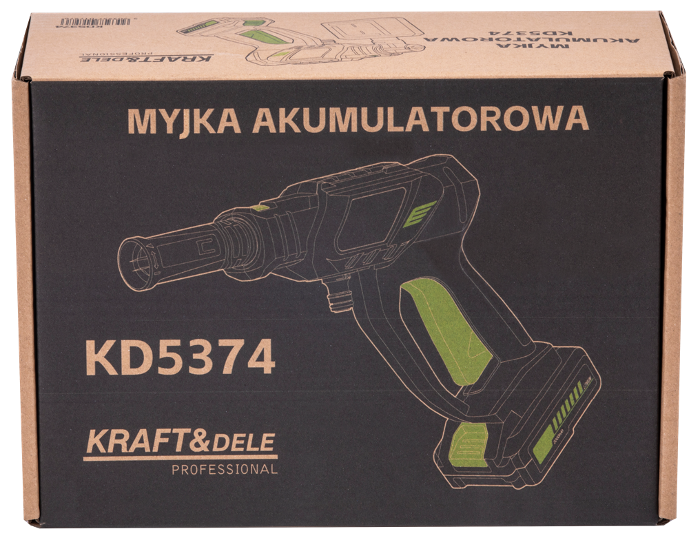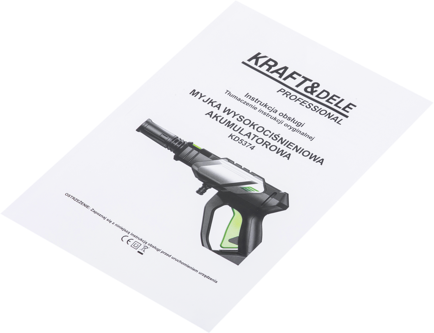 Myjka akumulatorowa KD5374, akumulator 21V 3000mAh, ładowarka z sygnalizacją LED, wąż doprowadzający wodę, instrukcja obsługi w języku polskim.