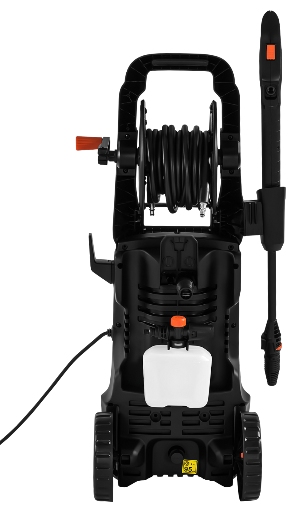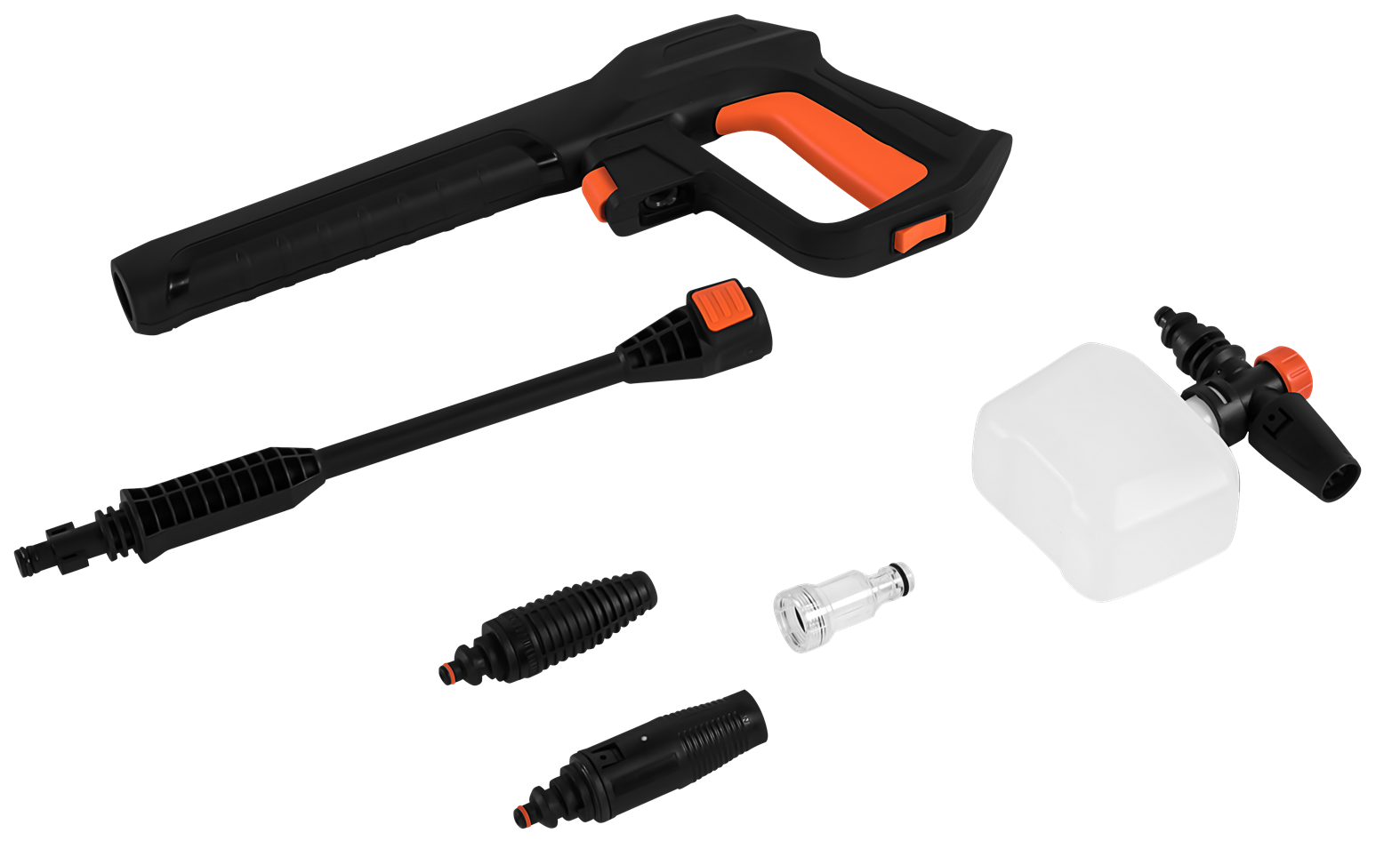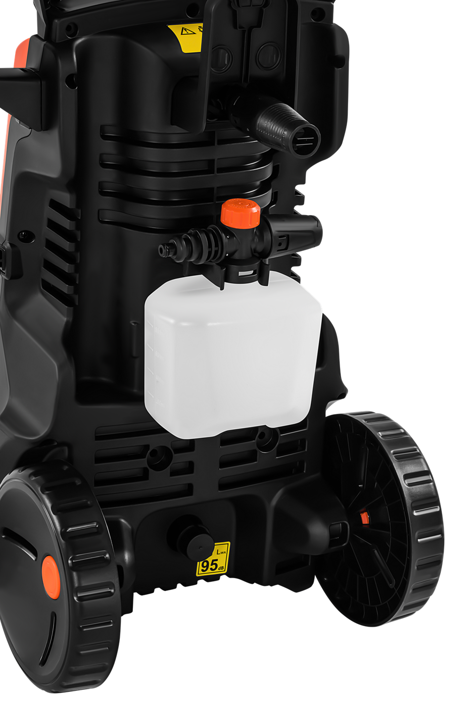 Waga 10,5 kg w połączeniu z dużymi kołami i wyprofilowaną rączką o dużej długości umożliwia sprawne przemieszczanie urządzenia po nierównym terenie — między garażem, podjazdem a tarasem — bez konieczności przenoszenia go ręcznie. Blokada spustu pistoletu pozwala na chwilowe przerwanie pracy bez konieczności ciągłego trzymania wciśniętego spustu.