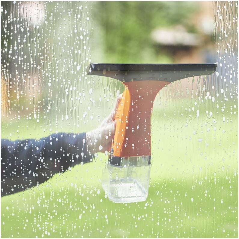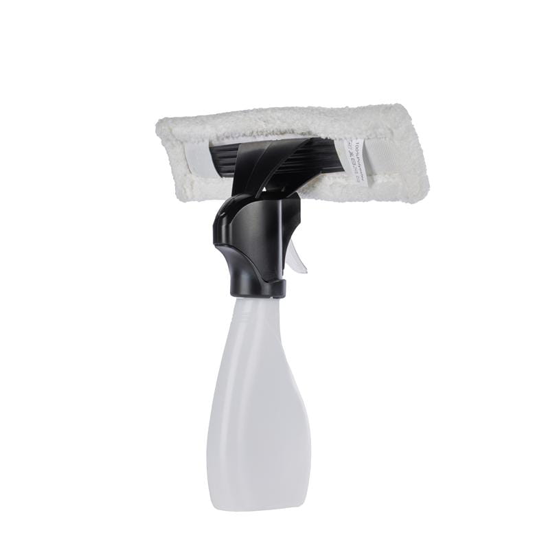 W zestawie znajduje się nakładka czyszcząca, zbiornik na wodę oraz butelka z rozpylaczem. Rozpylacz służy do wstępnego nawilżenia powierzchni przed przejazdem myjką — taki dwuetapowy proces czyszczenia (nawilżenie + zebranie płynu) minimalizuje ryzyko powstawania smug.