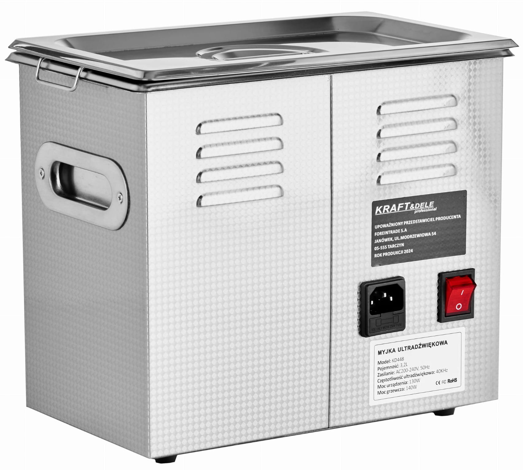 Urządzenie do czyszczenia metodą kawitacji ultradźwiękowej o pojemności 3,2 litra, przeznaczone do zastosowań domowych i profesjonalnych. Technologia ultradźwięków o częstotliwości 40 kHz pozwala usuwać zanieczyszczenia z trudno dostępnych miejsc bez mechanicznego ścierania powierzchni.