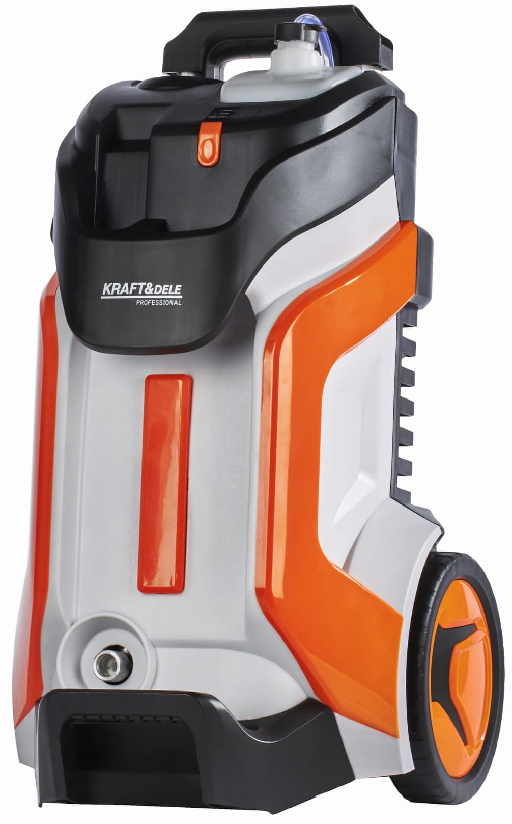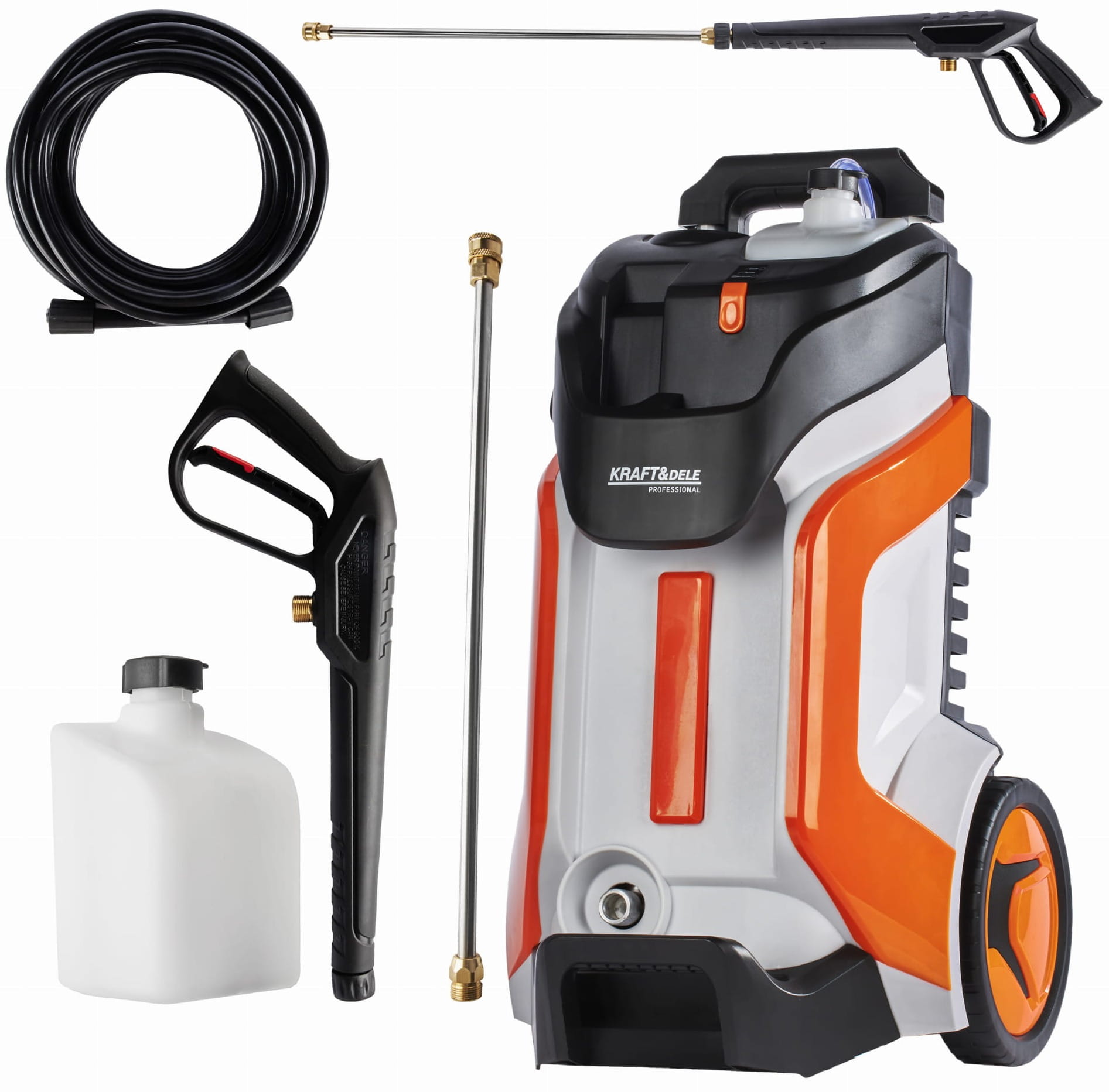 KD497 to elektryczna myjka wysokociśnieniowa z silnikiem szczotkowym o mocy 2100W i metalową pompą z napędem bezpośrednim. Urządzenie przeznaczone do intensywnego czyszczenia powierzchni zewnętrznych i pojazdów, wyposażone w system automatycznego zatrzymania pompy oraz możliwość pracy z ciepłą wodą do 50°C.