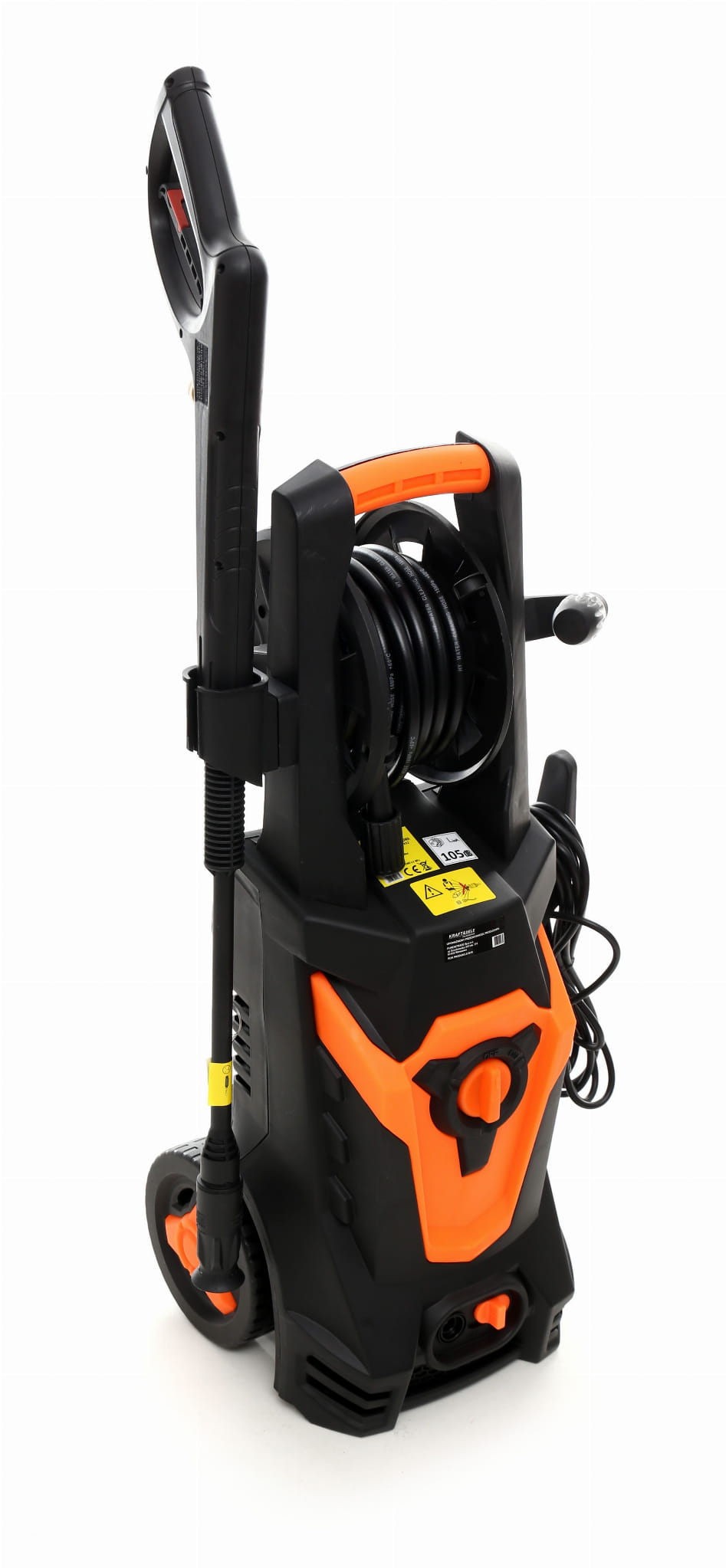 Myjka ciśnieniowa KD432, bęben do zwijania węża, wąż na bębnie (5 m), wąż przyłączeniowy do myjki, filtr wody, trzy końcówki do węży, lanca z pistoletem, pianownica, szczotka, końcówka regulowana, dwa kółka jezdne, instrukcja obsługi w języku polskim.