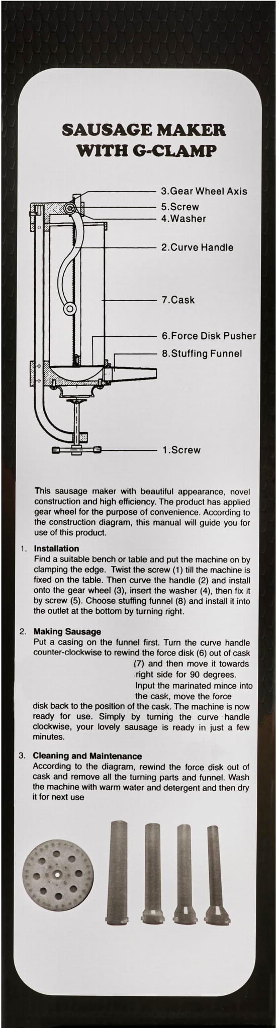 Po każdym użyciu urządzenie należy rozłożyć i umyć niezwłocznie — zastygły tłuszcz i resztki masy mięsnej trudniej usunąć po dłuższym czasie. Przechowywać w suchym miejscu, najlepiej po uprzednim złożeniu w całość.