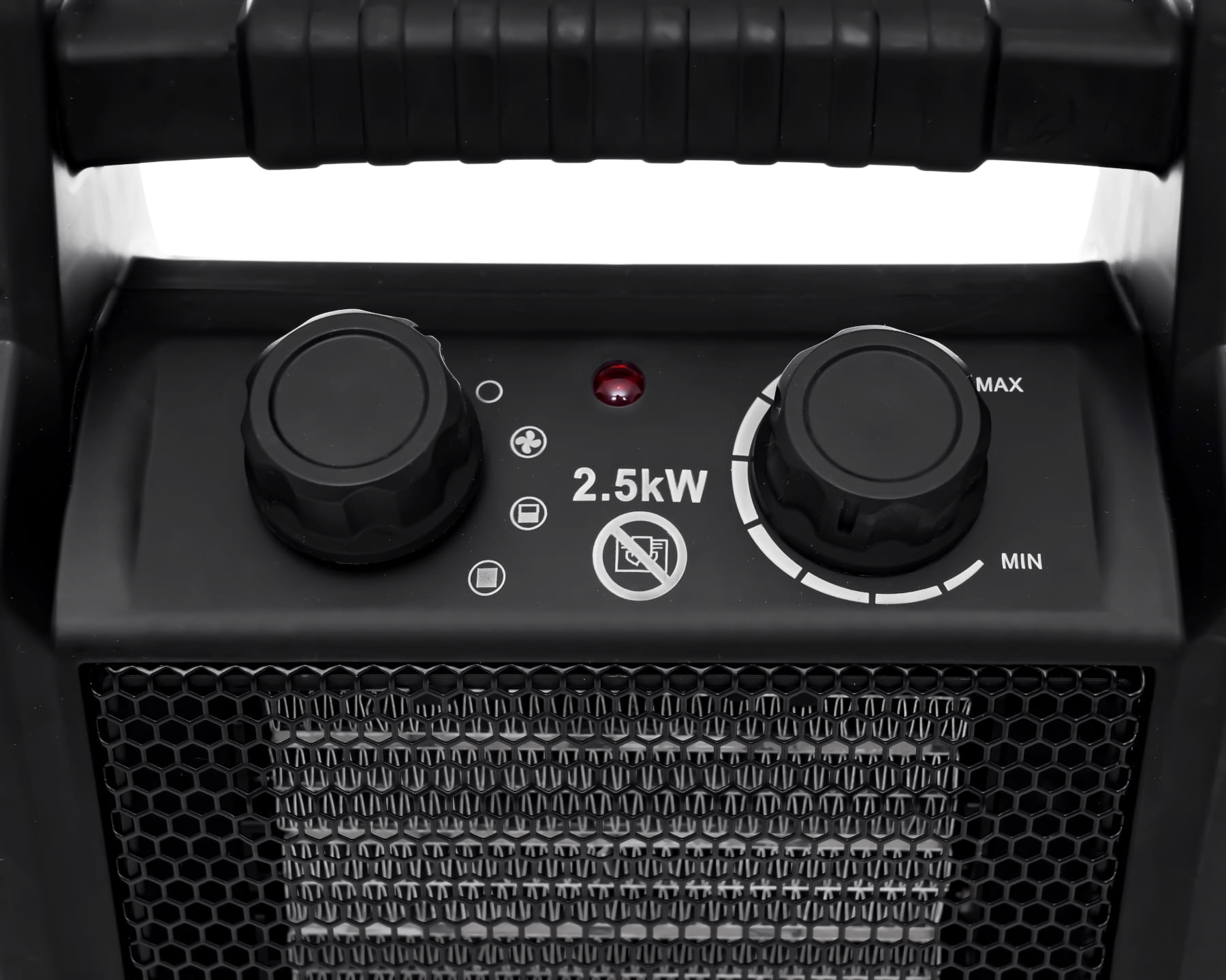 Dostępne stopnie: 25 W (wentylacja bez grzania), 1000 W oraz 2500 W. Niższe nastawy pozwalają ograniczyć zużycie energii w pomieszczeniach już wstępnie nagrzanych lub przy łagodniejszych warunkach atmosferycznych.