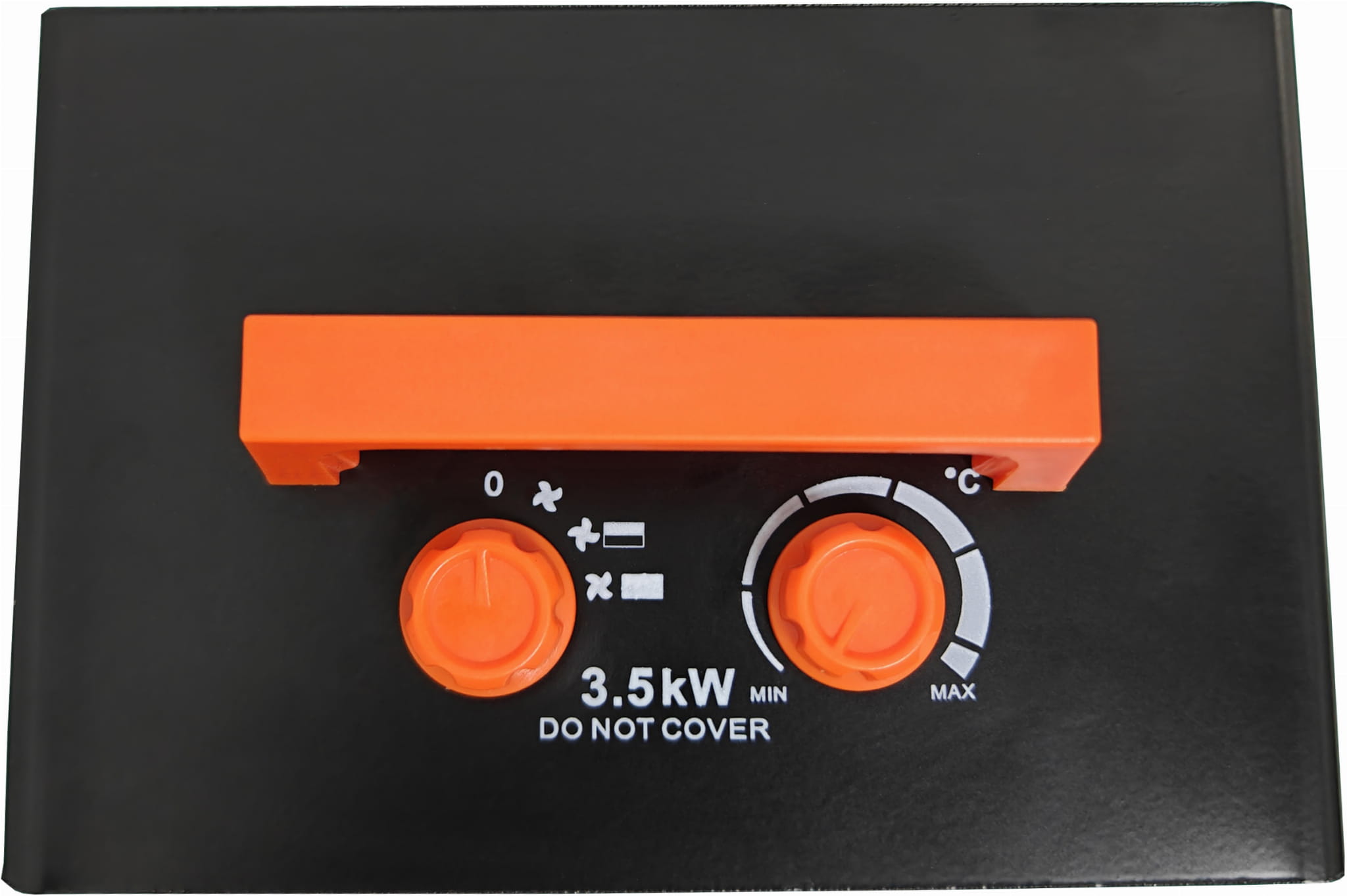 Lewe pokrętło wybiera tryb pracy i poziom mocy grzewczej (wentylator / 1750 W / 3500 W). Prawe pokrętło reguluje nastawę termostatu — ustawia temperaturę, przy której grzałka ma się wyłączyć. Obsługa nie wymaga znajomości elektroniki i jest intuicyjna nawet w warunkach warsztatowych.