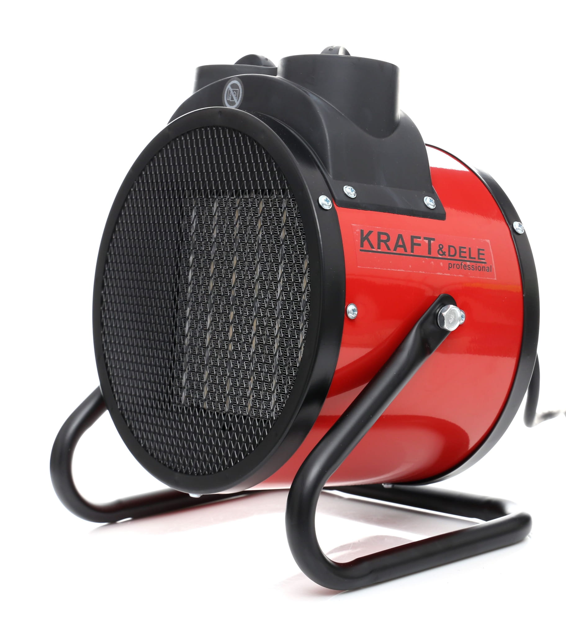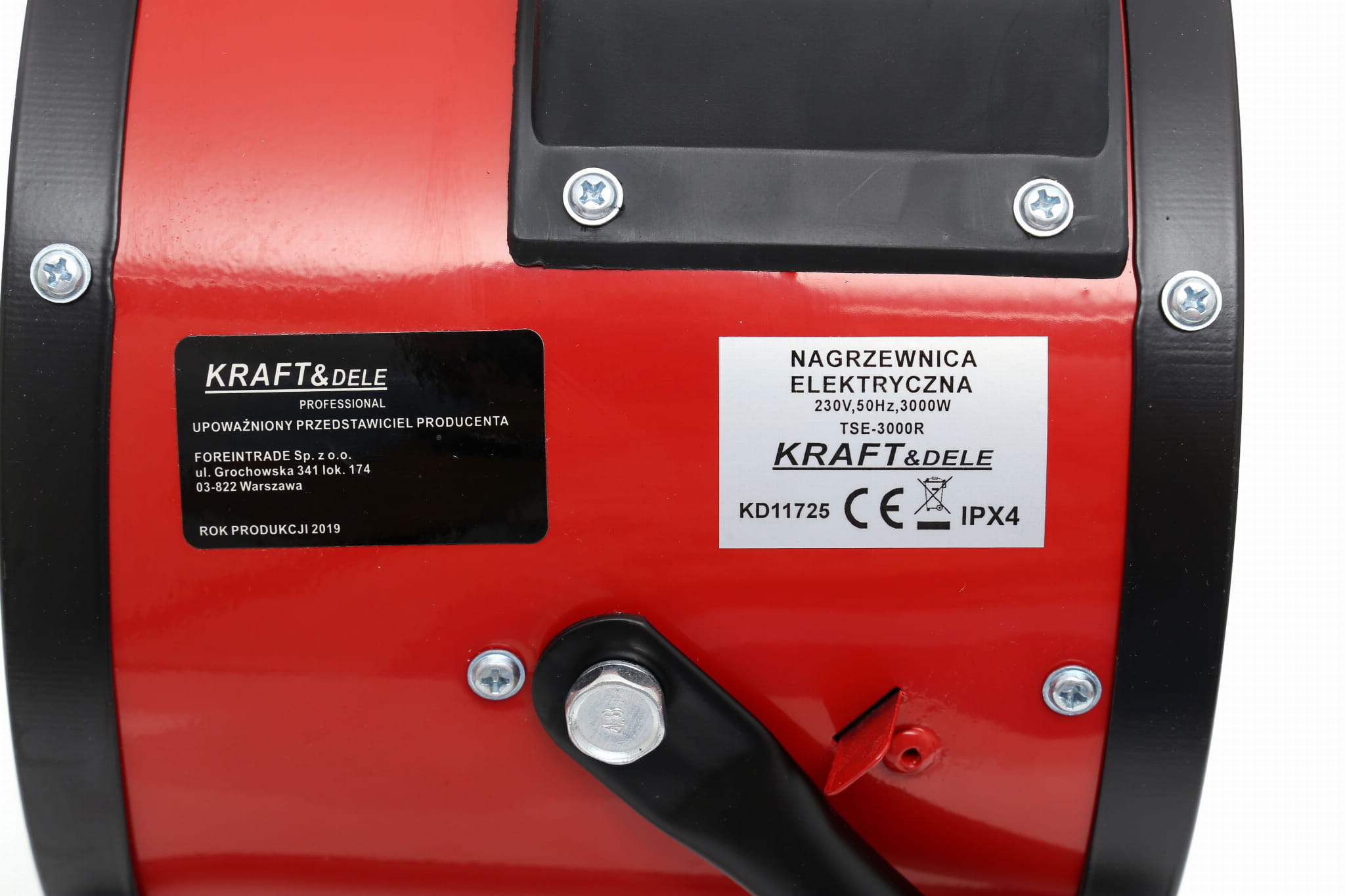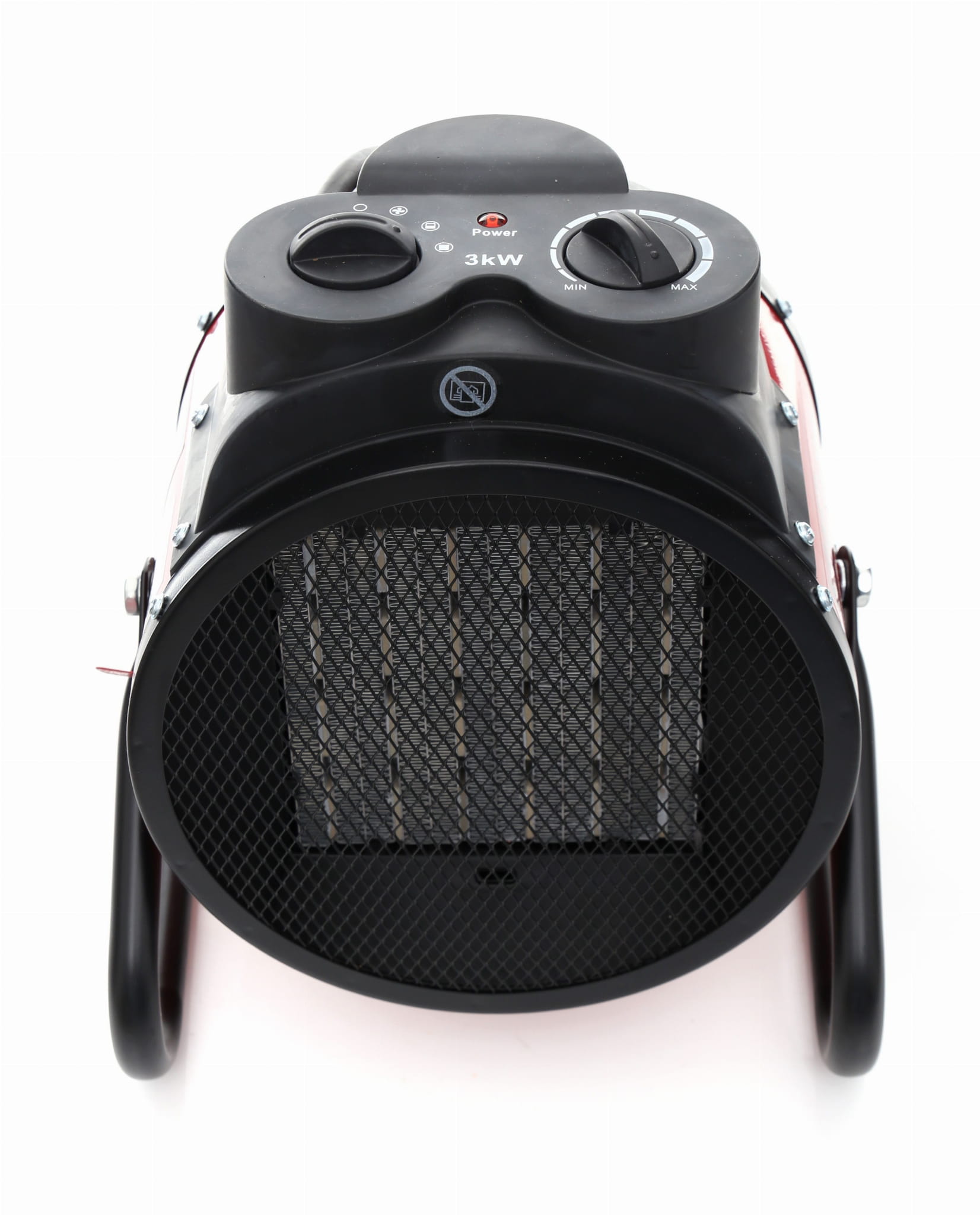 Przenośna nagrzewnica elektryczna z grzałką PTC o mocy 3000 W, przeznaczona do ogrzewania i osuszania małych oraz średnich pomieszczeń użytkowych. Pracuje wyłącznie na prądzie elektrycznym — nie emituje spalin ani pary wodnej.