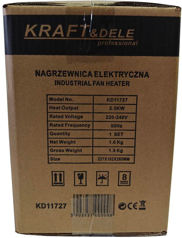 KD11727 to elektryczna nagrzewnica z wentylatorem (farelka) o mocy 2500 W, zasilana ze standardowego gniazda 230V. Urządzenie pracuje bez spalania paliwa, co oznacza brak emisji spalin i pary wodnej — cechę szczególnie istotną przy użytkowaniu w słabo wentylowanych przestrzeniach zamkniętych.