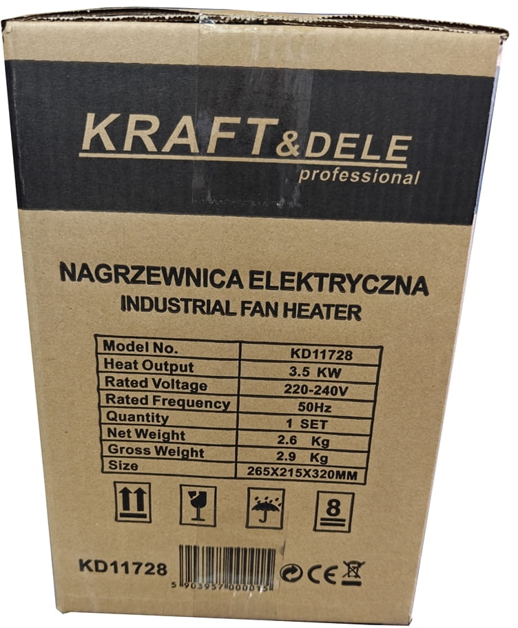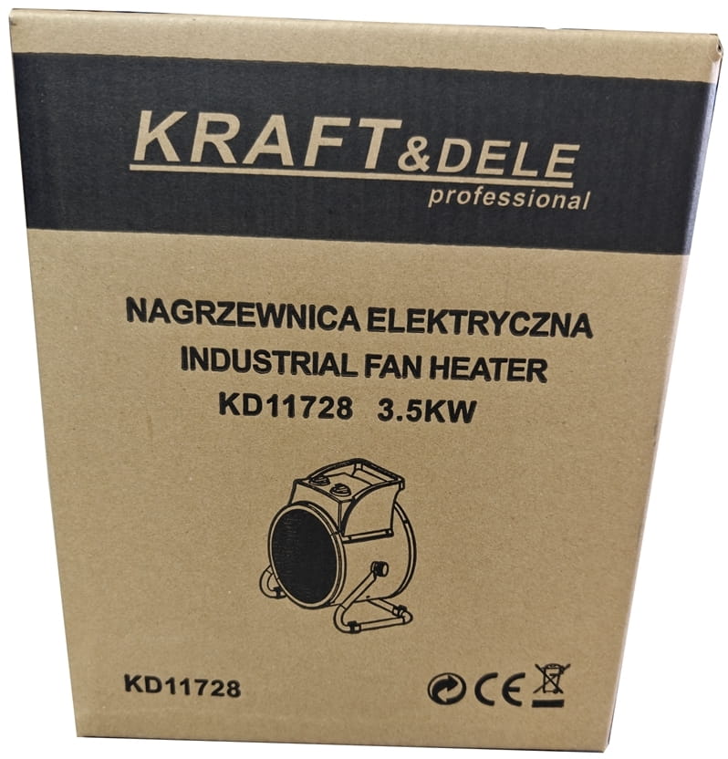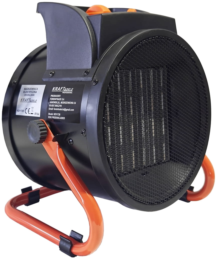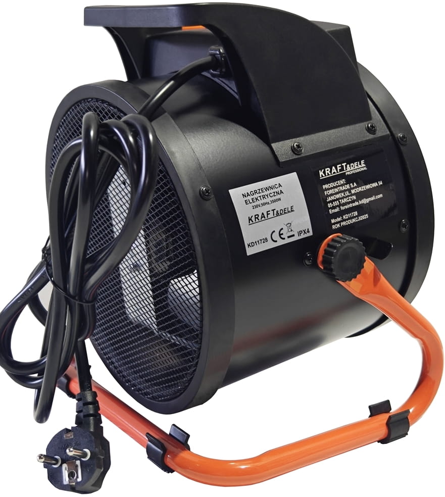 KD11728 to elektryczna nagrzewnica dmuchawa (farelka) o mocy 3500 W, przeznaczona do szybkiego ogrzewania pomieszczeń zamkniętych. Urządzenie nie wytwarza spalin ani pary wodnej, co umożliwia bezpieczną pracę w miejscach z ograniczoną wentylacją. Zasilanie ze standardowego gniazdka 230V eliminuje konieczność stosowania instalacji trójfazowej.