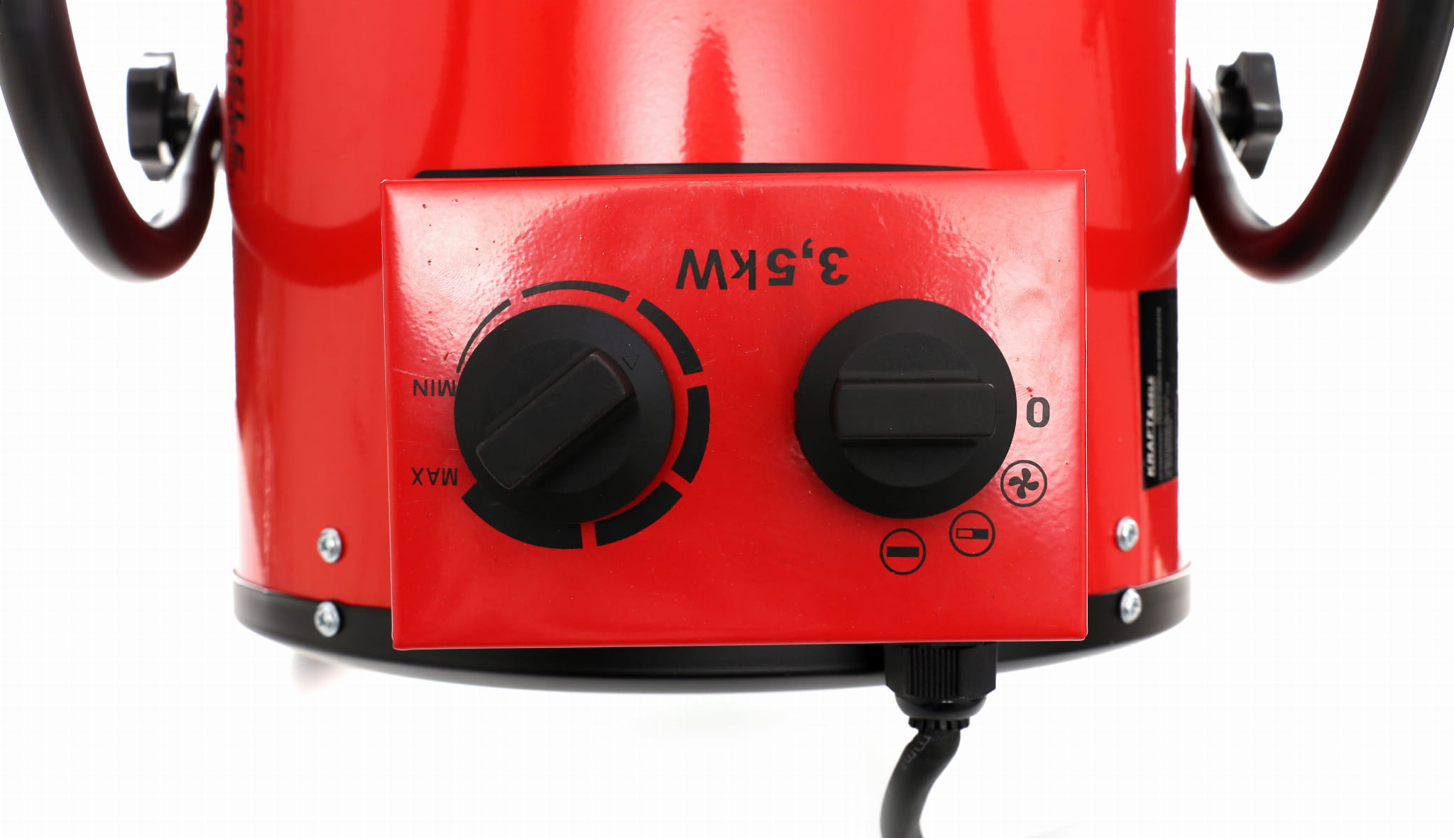 Urządzenie umożliwia pracę na trzech ustawieniach: tryb wyłączony (0 W), połowa mocy (1750 W) oraz pełna moc (3500 W). Tryb połowy mocy pozwala na utrzymanie temperatury przy niższym zużyciu energii elektrycznej — przydatne przy długotrwałej pracy w mniejszych pomieszczeniach.