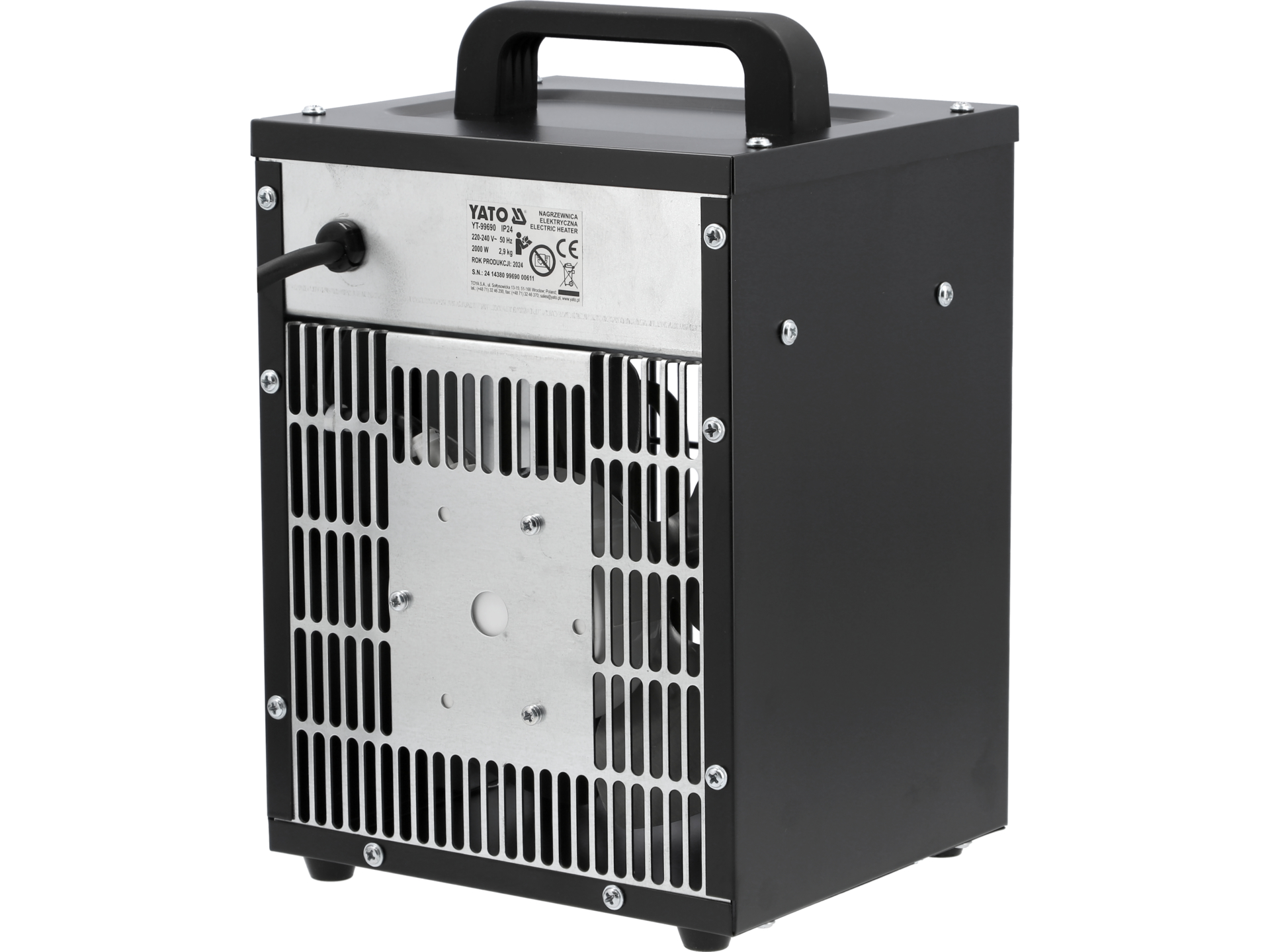 Przenośna nagrzewnica elektryczna o mocy 2000W z funkcją wentylatora i regulowanym termostatem. Urządzenie przeznaczone do ogrzewania pomieszczeń warsztatowych, magazynowych oraz suszenia po pracach budowlanych.