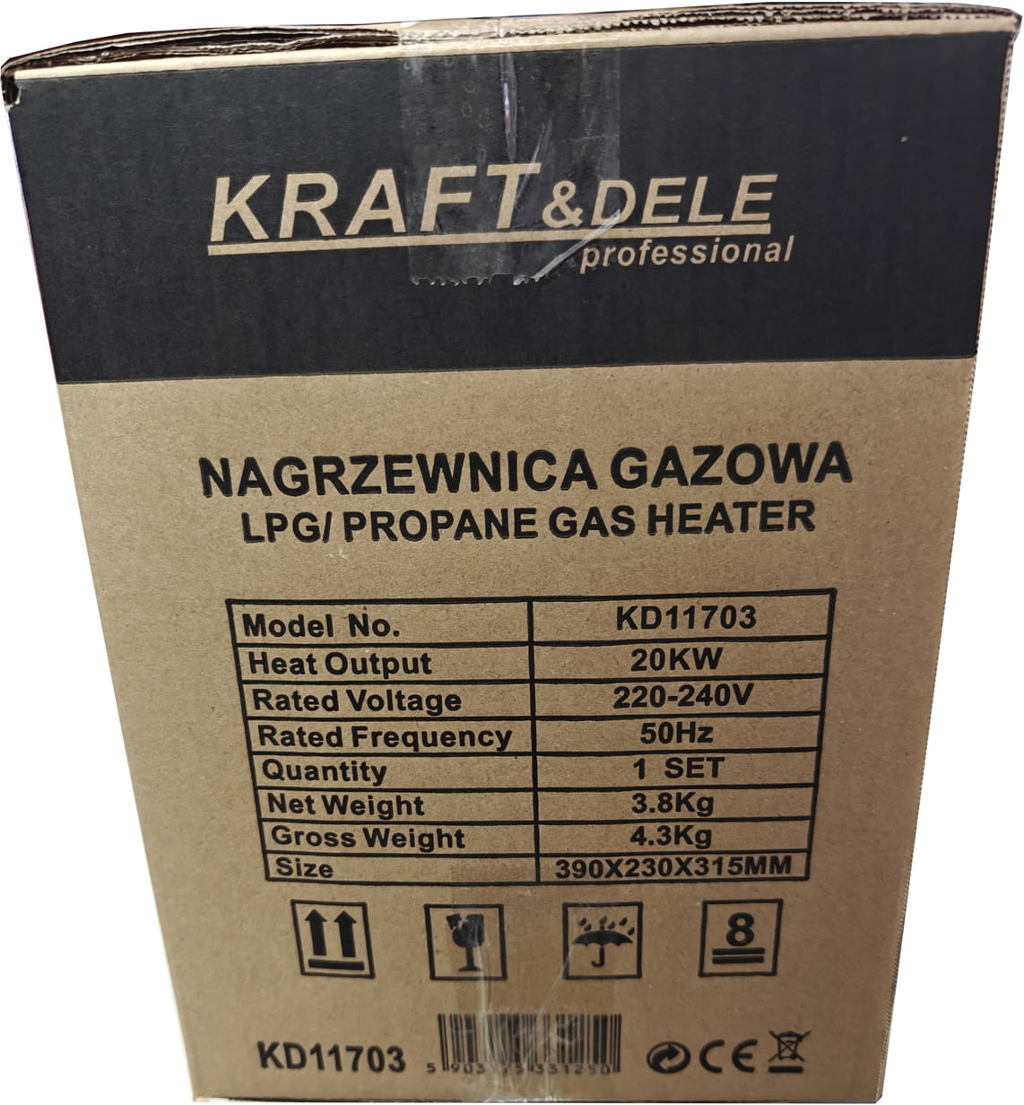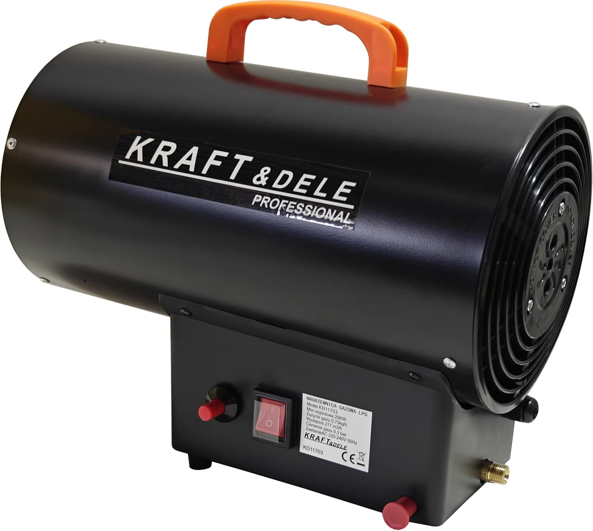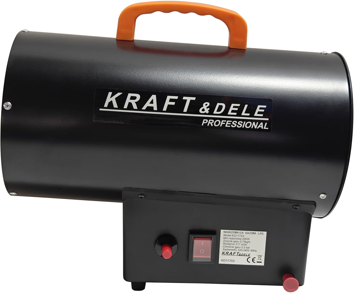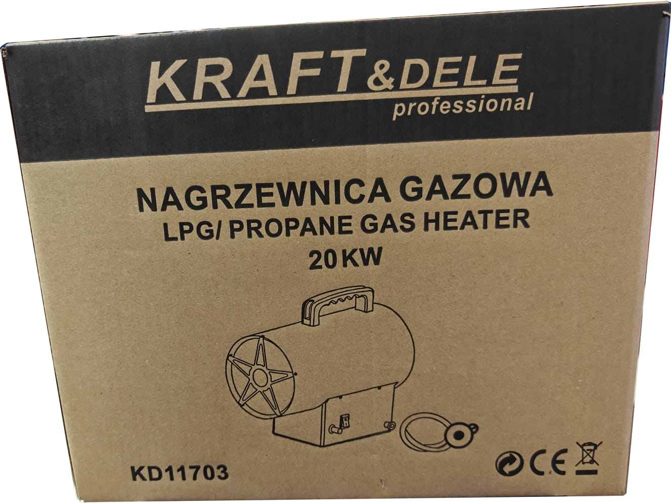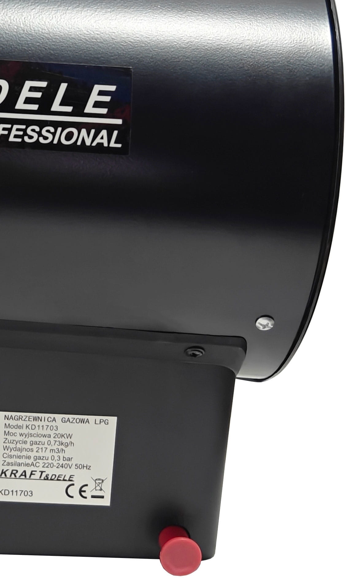 Przenośna nagrzewnica zasilana gazem propan-butan (LPG) o mocy 20 kW, przeznaczona do szybkiego ogrzewania dużych, słabo izolowanych lub tymczasowo użytkowanych pomieszczeń. Nie wymaga stałego podłączenia do instalacji — pracuje bezpośrednio z butli gazowej po dołączeniu reduktora i węża w zestawie.