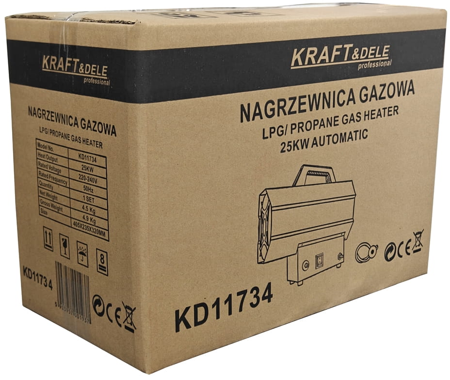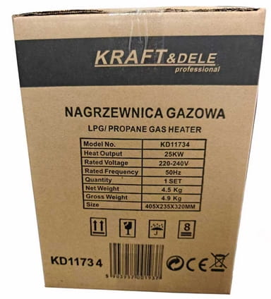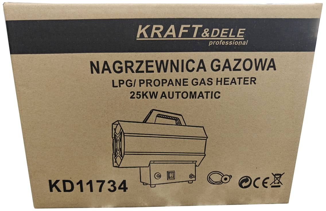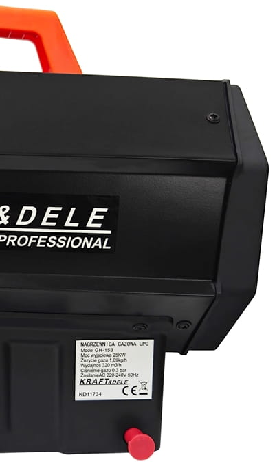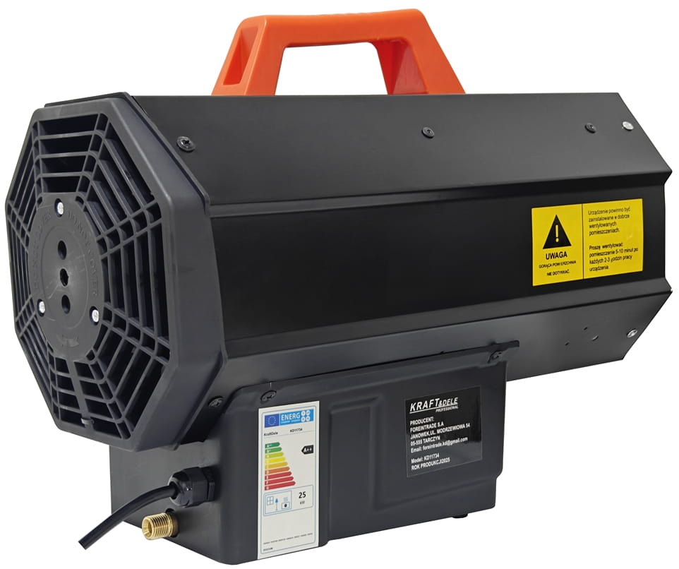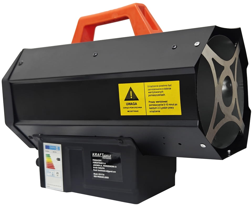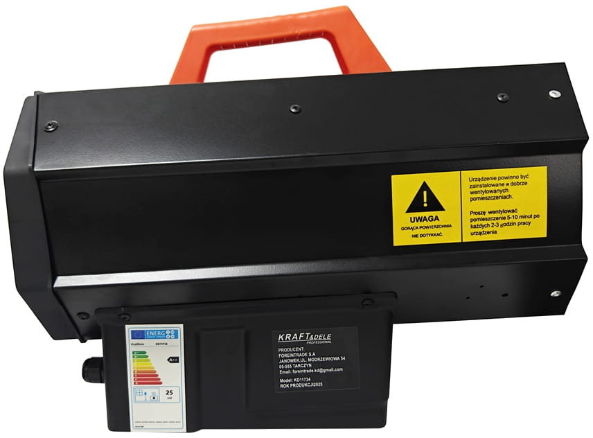Nagrzewnica KD11734 to urządzenie bezpośrednie — produkty spalania gazu (w tym para wodna i dwutlenek węgla) są odprowadzane bezpośrednio do ogrzewanego pomieszczenia. Użytkowanie wymaga zapewnienia stałej, wystarczającej wentylacji. Urządzenie nie nadaje się do pracy w szczelnie zamkniętych, małych pomieszczeniach mieszkalnych.