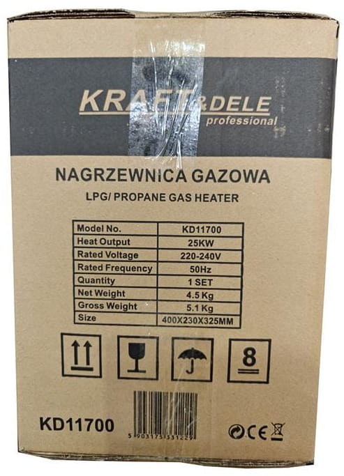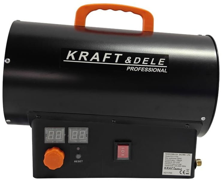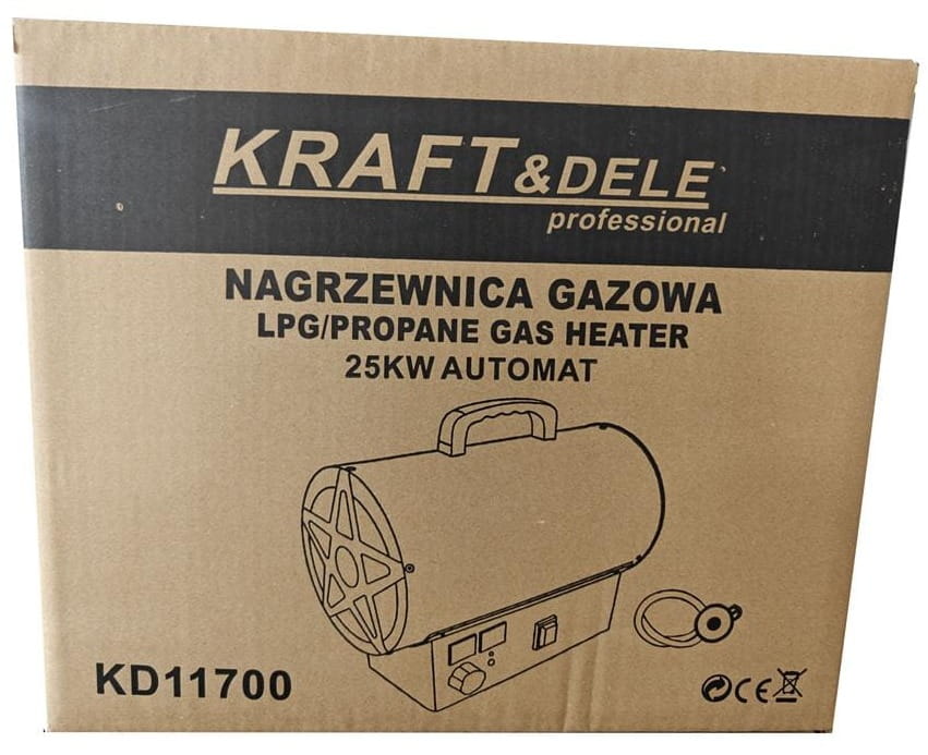 KD11700 to bezprzewodowa nagrzewnica gazowa zasilana propanem-butanem (LPG) o mocy 25 kW, wyposażona w cyfrowy termostat z wyświetlaczem LCD. Urządzenie pracuje w otwartym obiegu powietrza — bez konieczności podłączenia do komina — i nadaje się do szybkiego ogrzewania dużych, przewiewnych przestrzeni. W zestawie znajdują się reduktor ciśnienia oraz wąż gazowy, umożliwiające natychmiastowe podłączenie do butli.