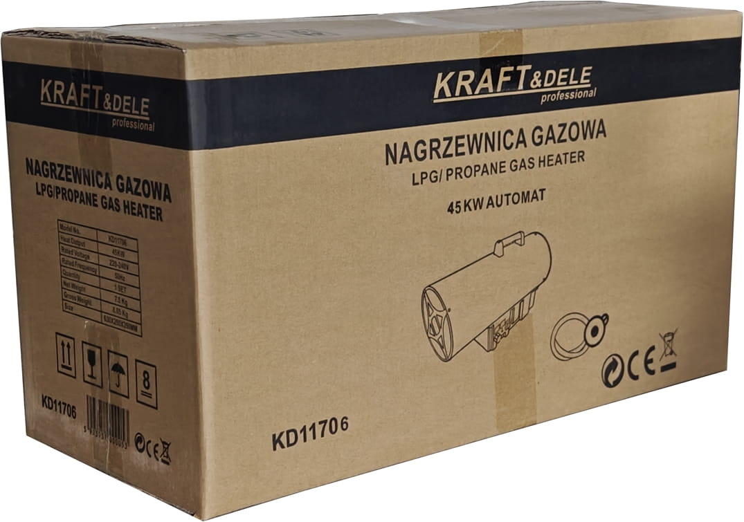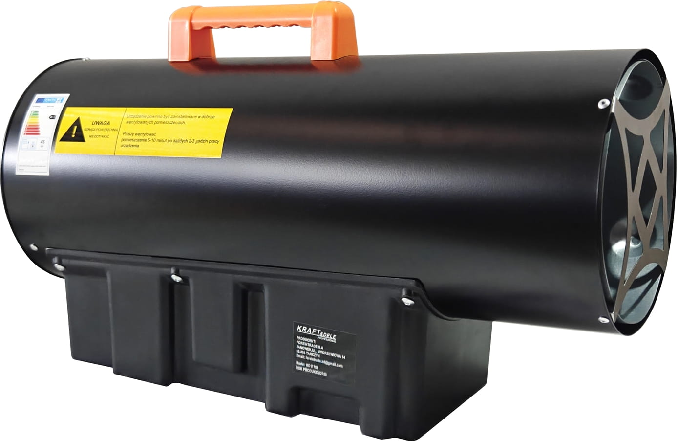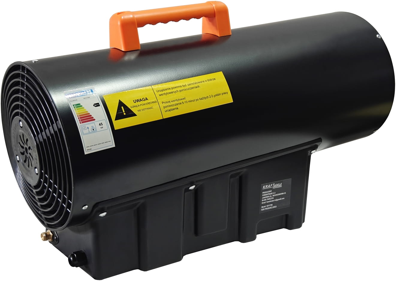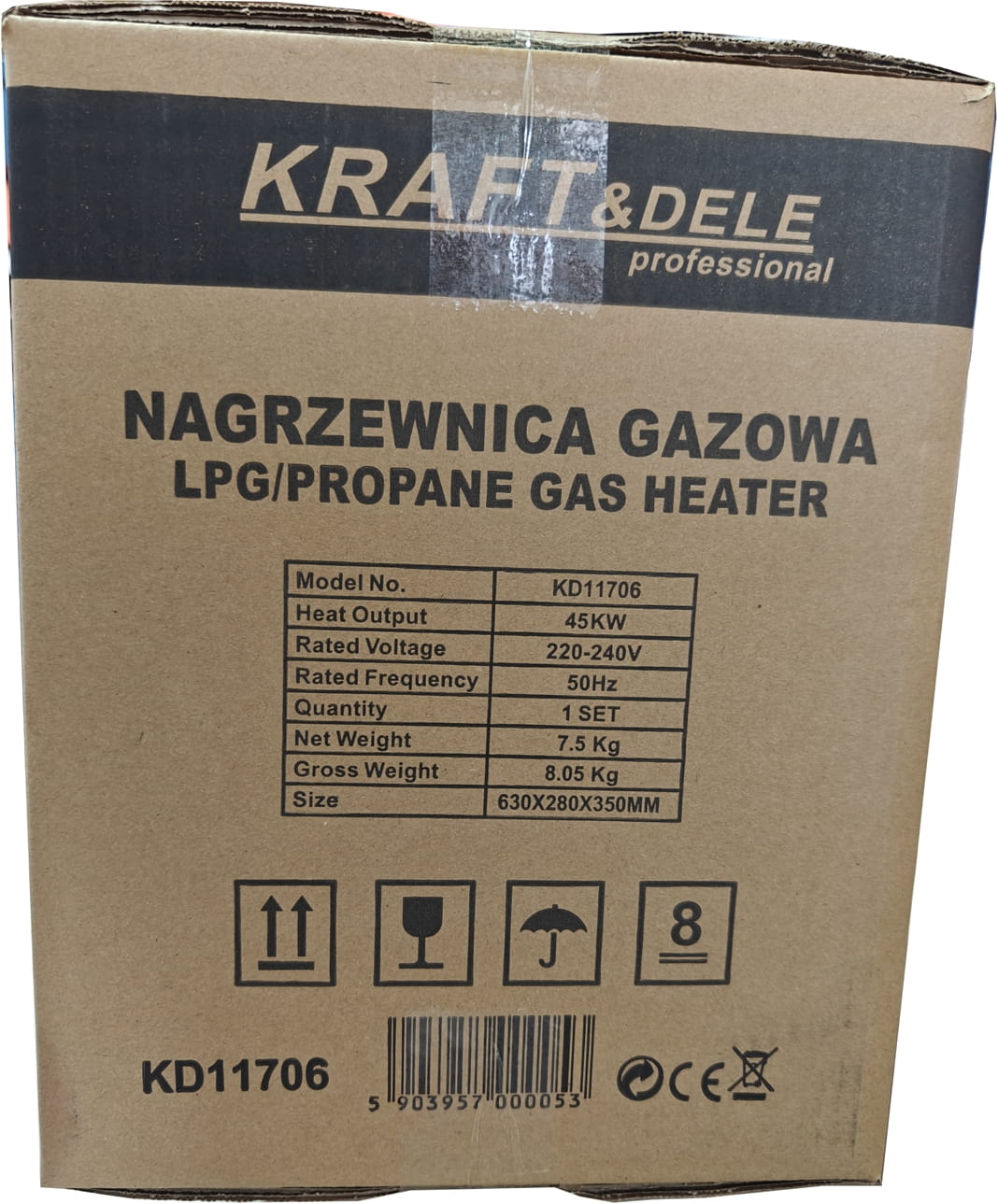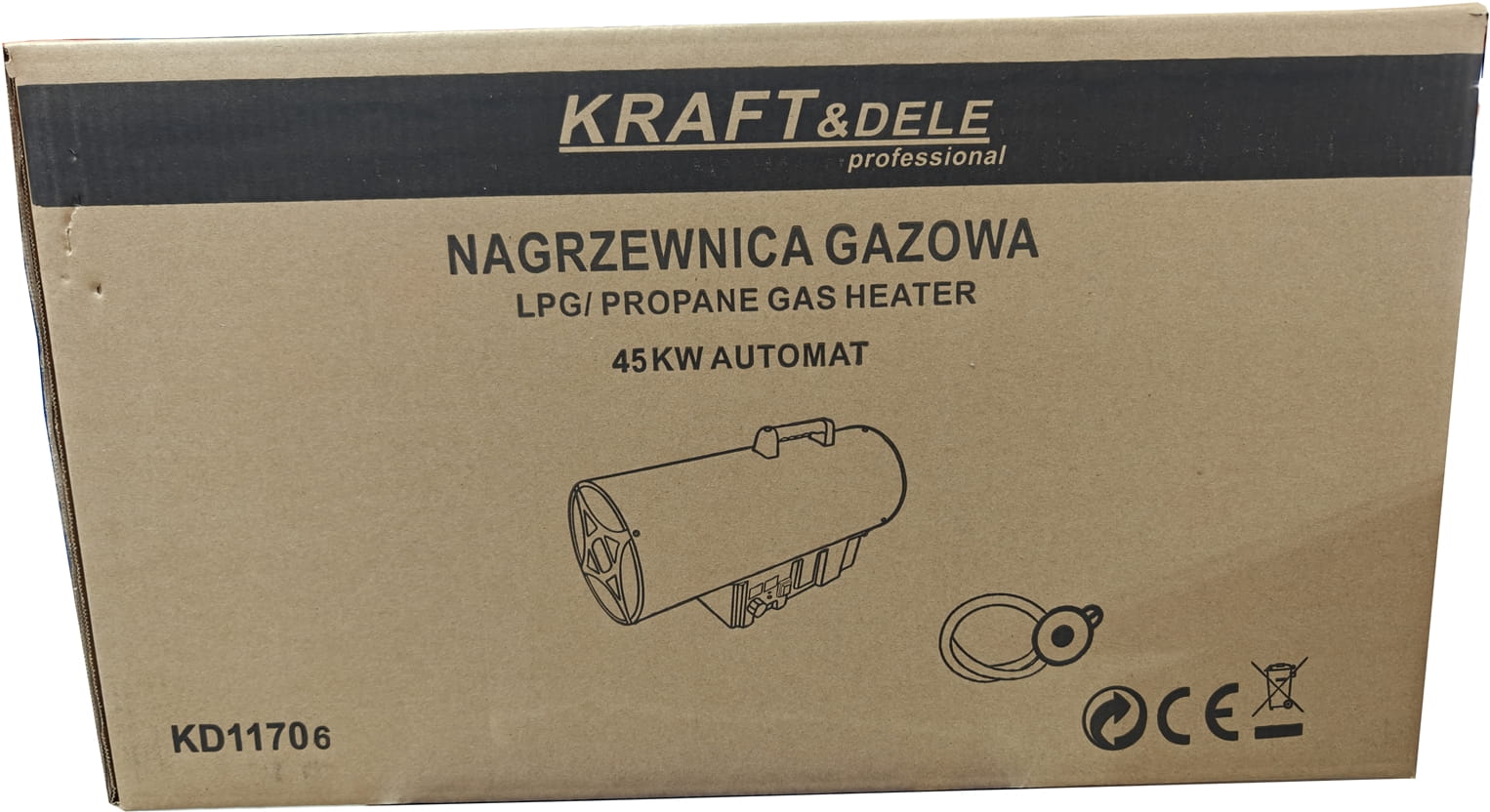 Nagrzewnica gazowa 45 kW KD11706, wąż gazowy, reduktor ciśnienia, instrukcja obsługi w języku polskim, oryginalne opakowanie.