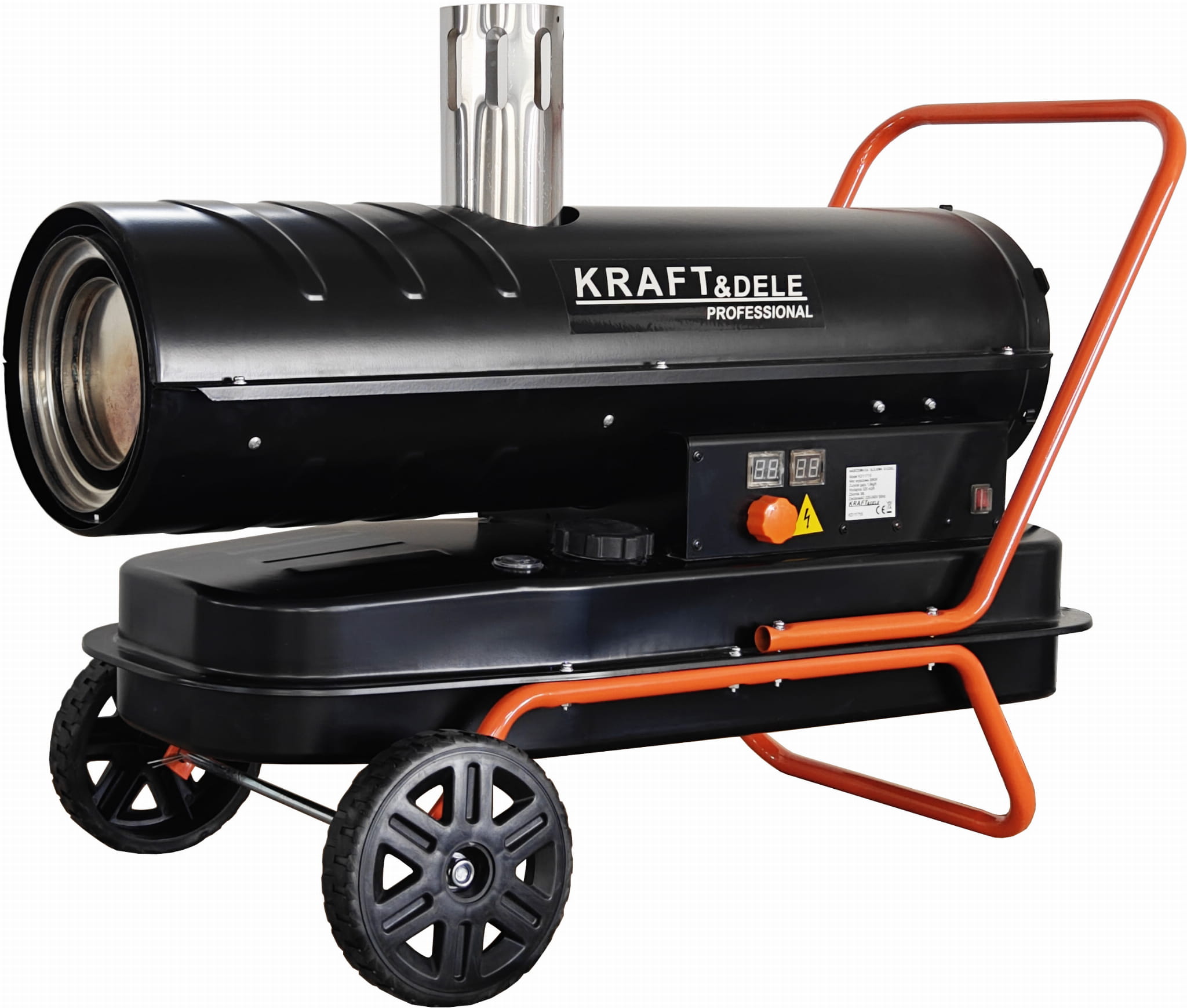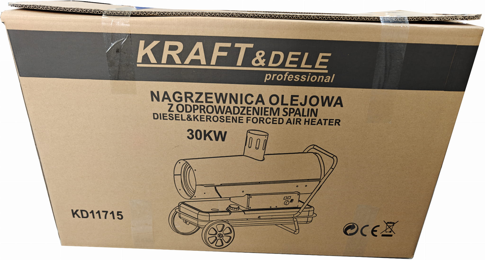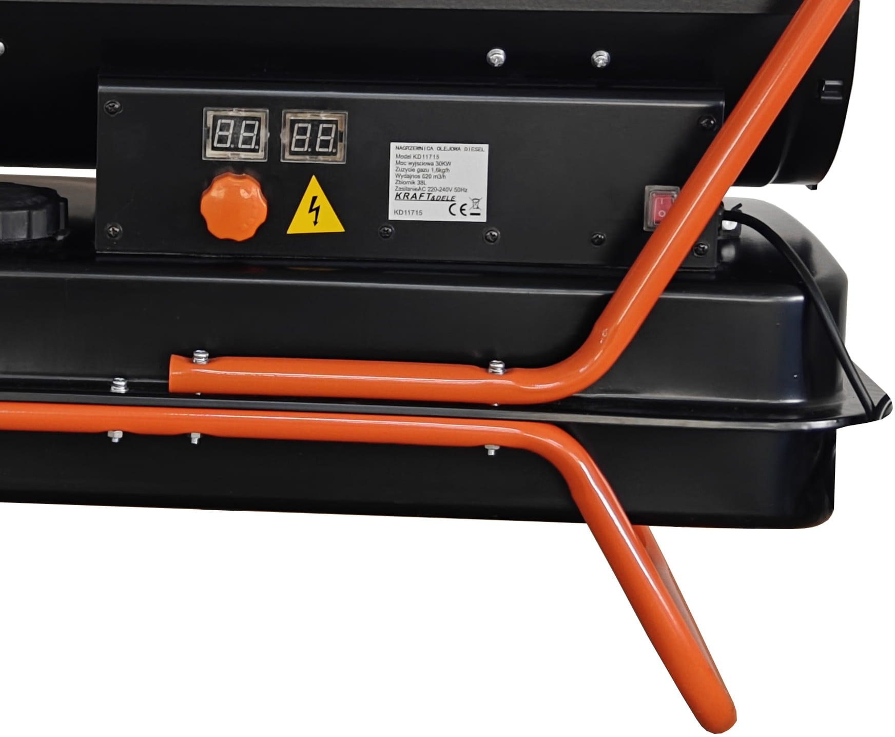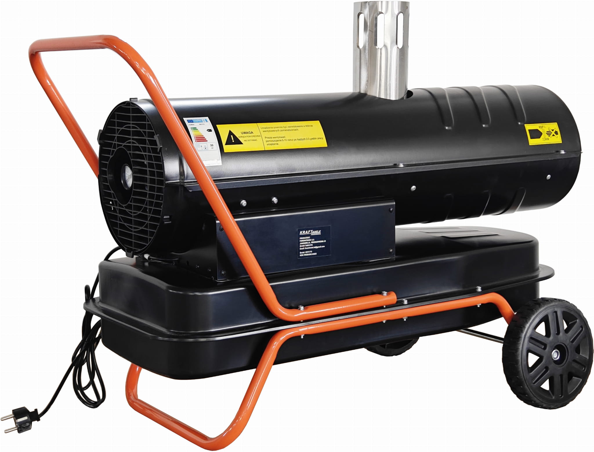 KD11715 to nagrzewnica olejowa zasilana olejem napędowym (ON), wyposażona w wymiennik ciepła i system odprowadzania spalin. Dzięki temu rozwiązaniu urządzenie może pracować w zamkniętych pomieszczeniach — spaliny są kierowane na zewnątrz przez przewód kominowy, a do wnętrza trafia wyłącznie czyste, podgrzane powietrze. Moc 30 kW i wydatek powietrza 595 m³/h pozwalają na ogrzewanie dużych hal, warsztatów i magazynów.