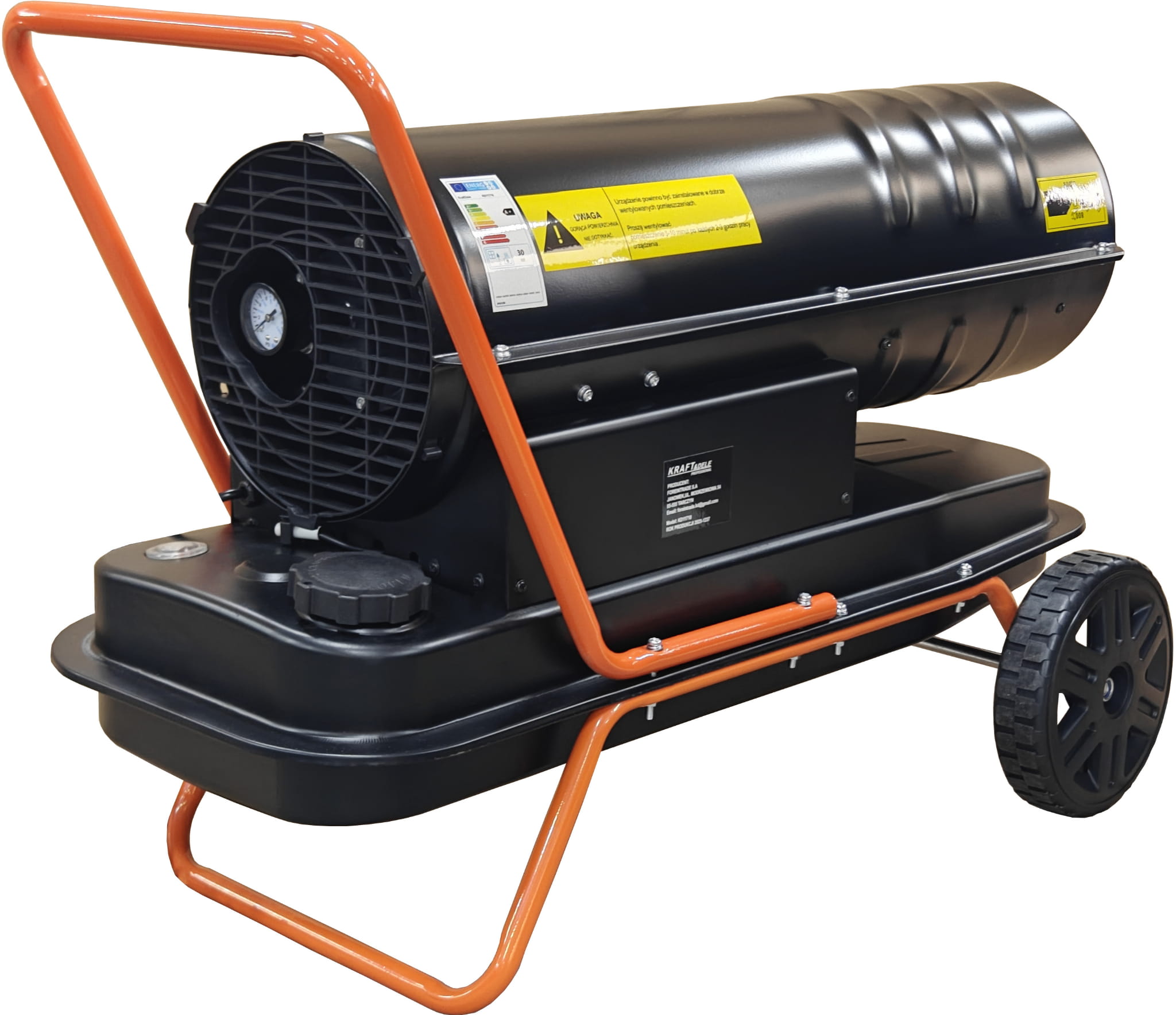 Przed pierwszym uruchomieniem należy zapoznać się z instrukcją obsługi dostarczoną w języku polskim. Zbiornik paliwa o pojemności 19 L należy napełniać wyłącznie olejem napędowym ON — stosowanie innych paliw grozi uszkodzeniem palnika i utratą gwarancji. Urządzenie powinno stać stabilnie na poziomym podłożu, z zachowaniem wymaganych odległości od materiałów palnych.