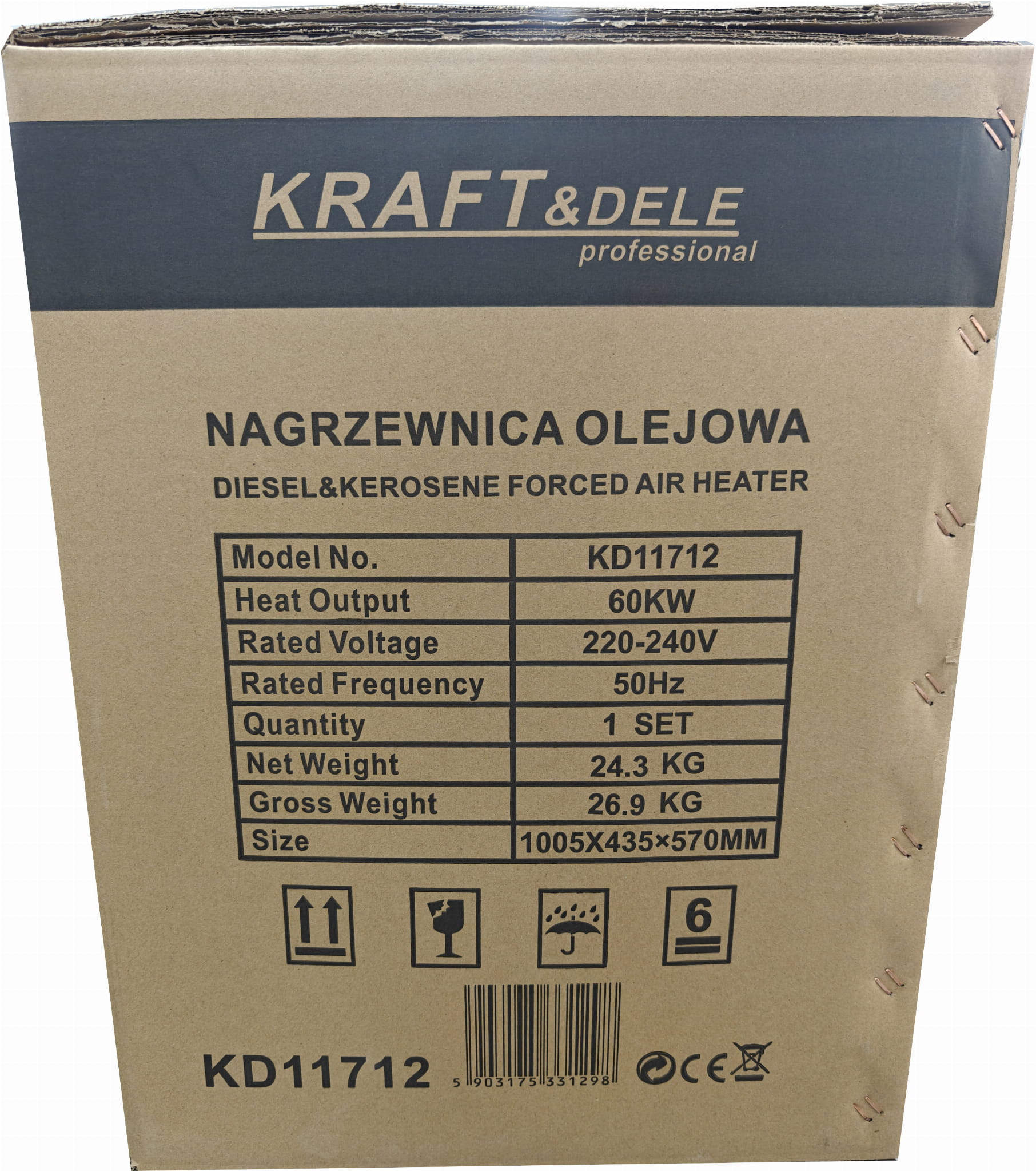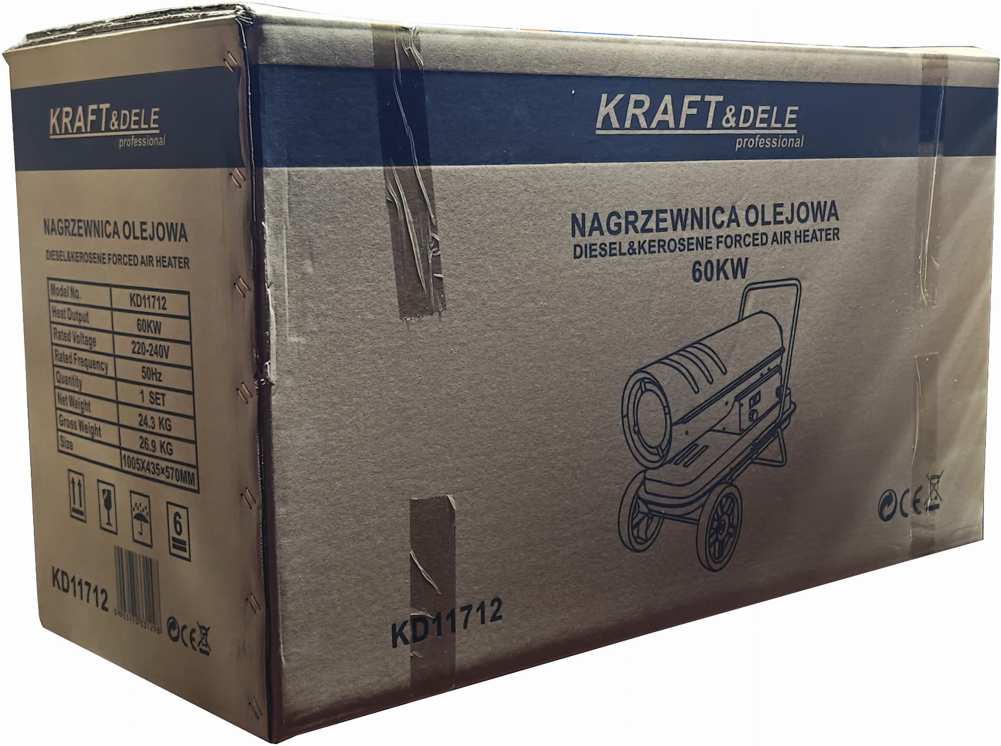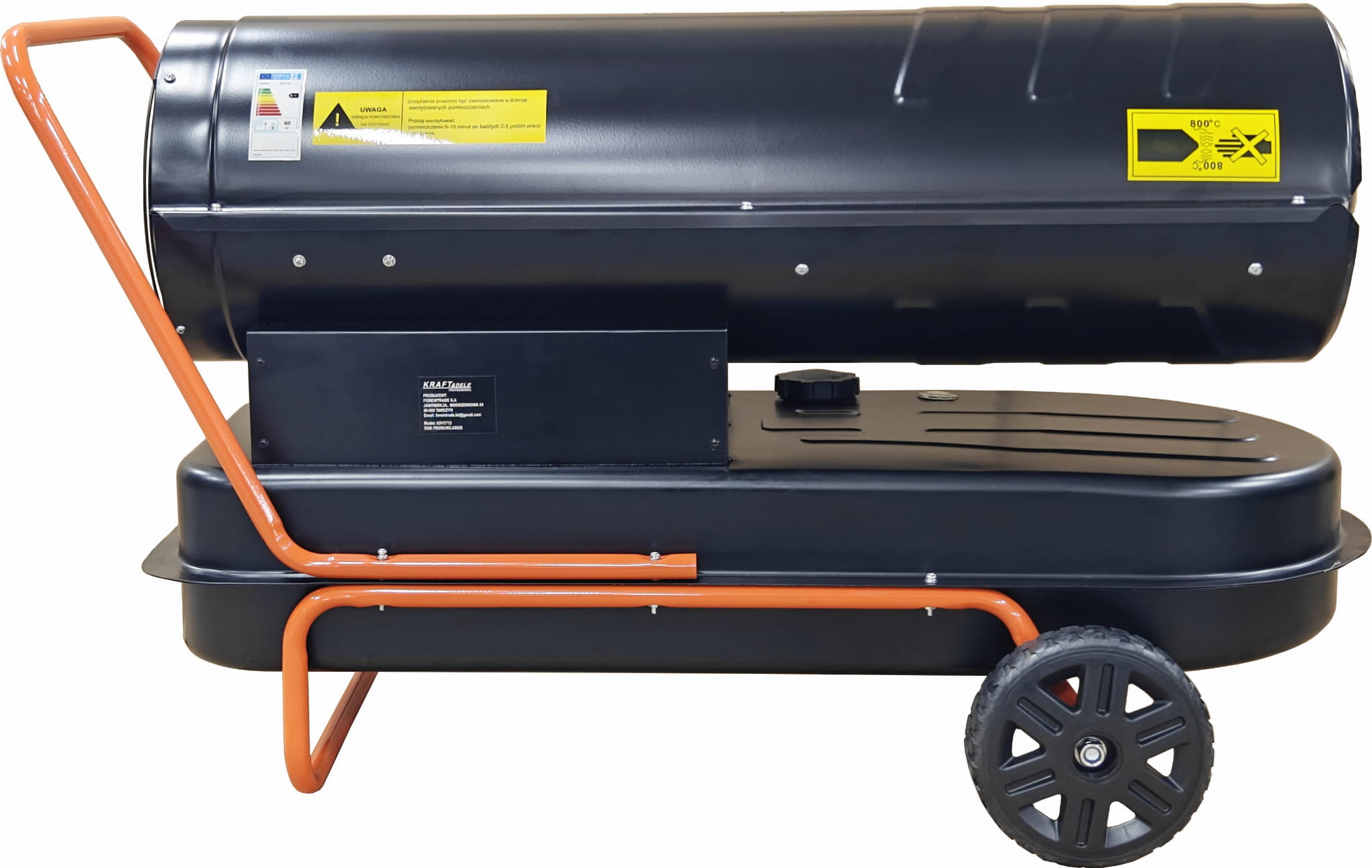 Nagrzewnica olejowa KD11712 jest urządzeniem przeznaczonym wyłącznie do stosowania w pomieszczeniach z zapewnionym odpowiednim dopływem powietrza i wentylacją. Produkty spalania oleju napędowego są odprowadzane bezpośrednio do ogrzewanej przestrzeni (typ bezprzewodowy), dlatego urządzenie nie nadaje się do użytku w szczelnie zamkniętych pomieszczeniach bez wentylacji ani w przestrzeniach przeznaczonych do stałego przebywania ludzi bez zapewnienia wymiany powietrza. Przed pierwszym uruchomieniem należy zapoznać się z instrukcją obsługi dostarczoną w języku polskim.