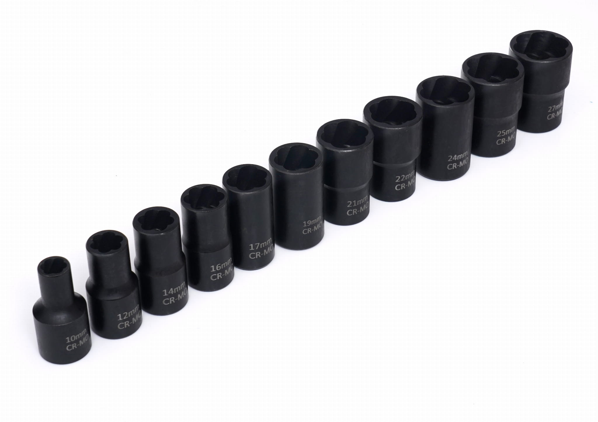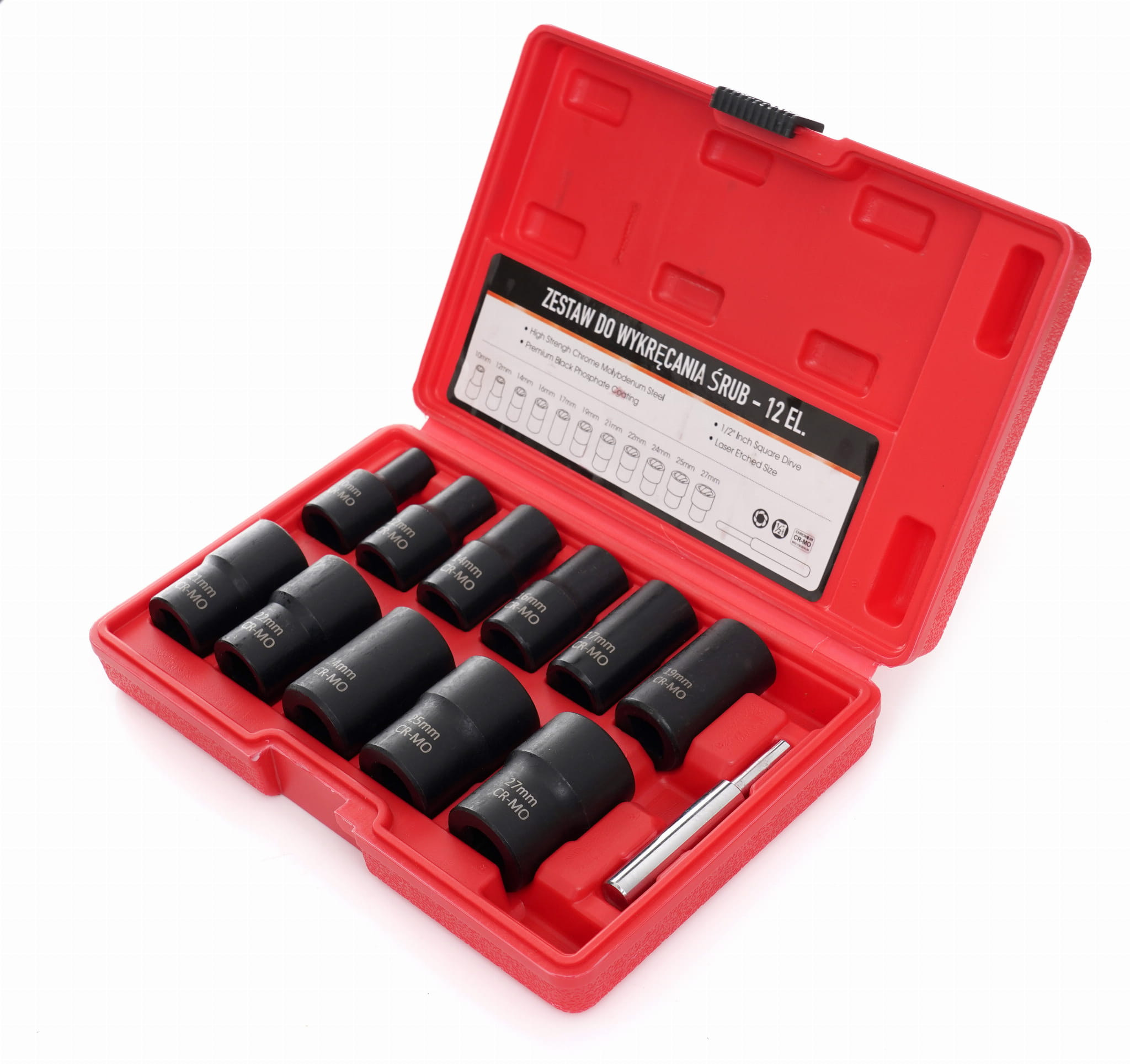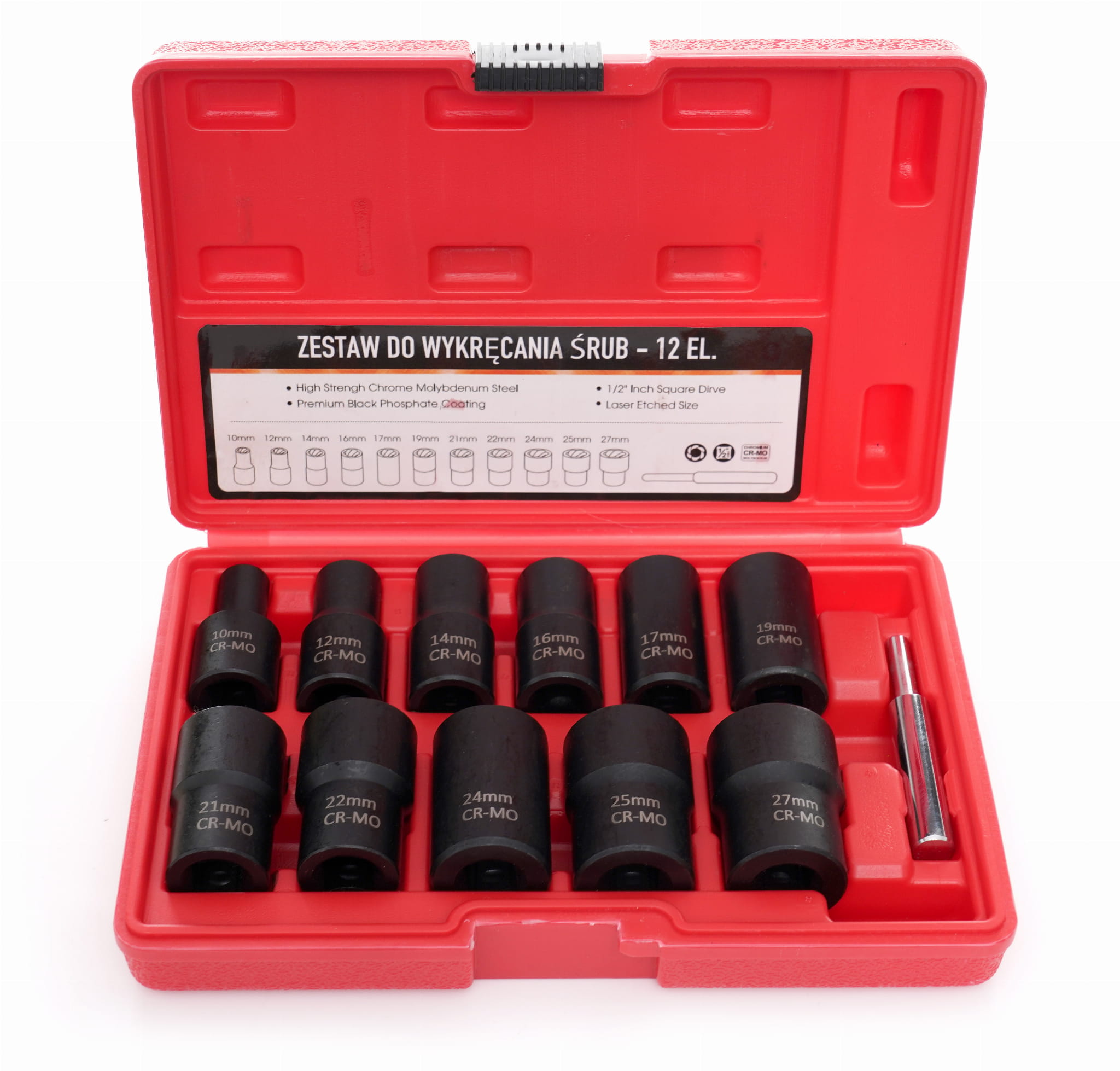 Zestaw 12 elementów przeznaczony do odkręcania uszkodzonych, obrobionych lub zapieczonych śrub, z którymi standardowe narzędzia nie są w stanie uzyskać wystarczającego chwytu. Nasadki wykonano ze stali chromowo-molibdenowej z napędem 1/2" i przystosowano do współpracy z kluczami nasadkowymi, płaskimi oraz oczkowymi.