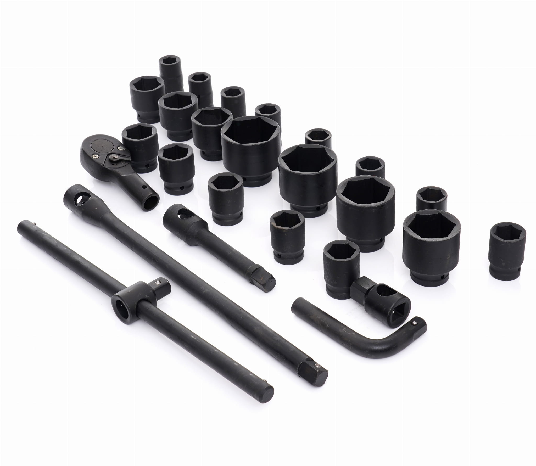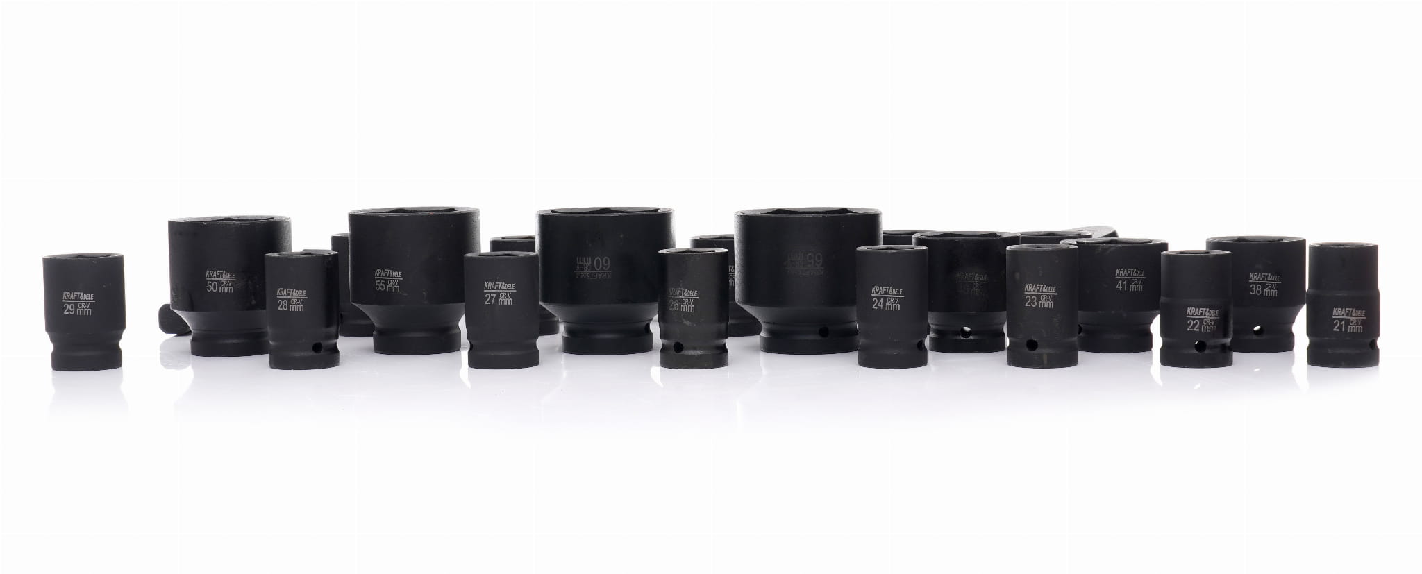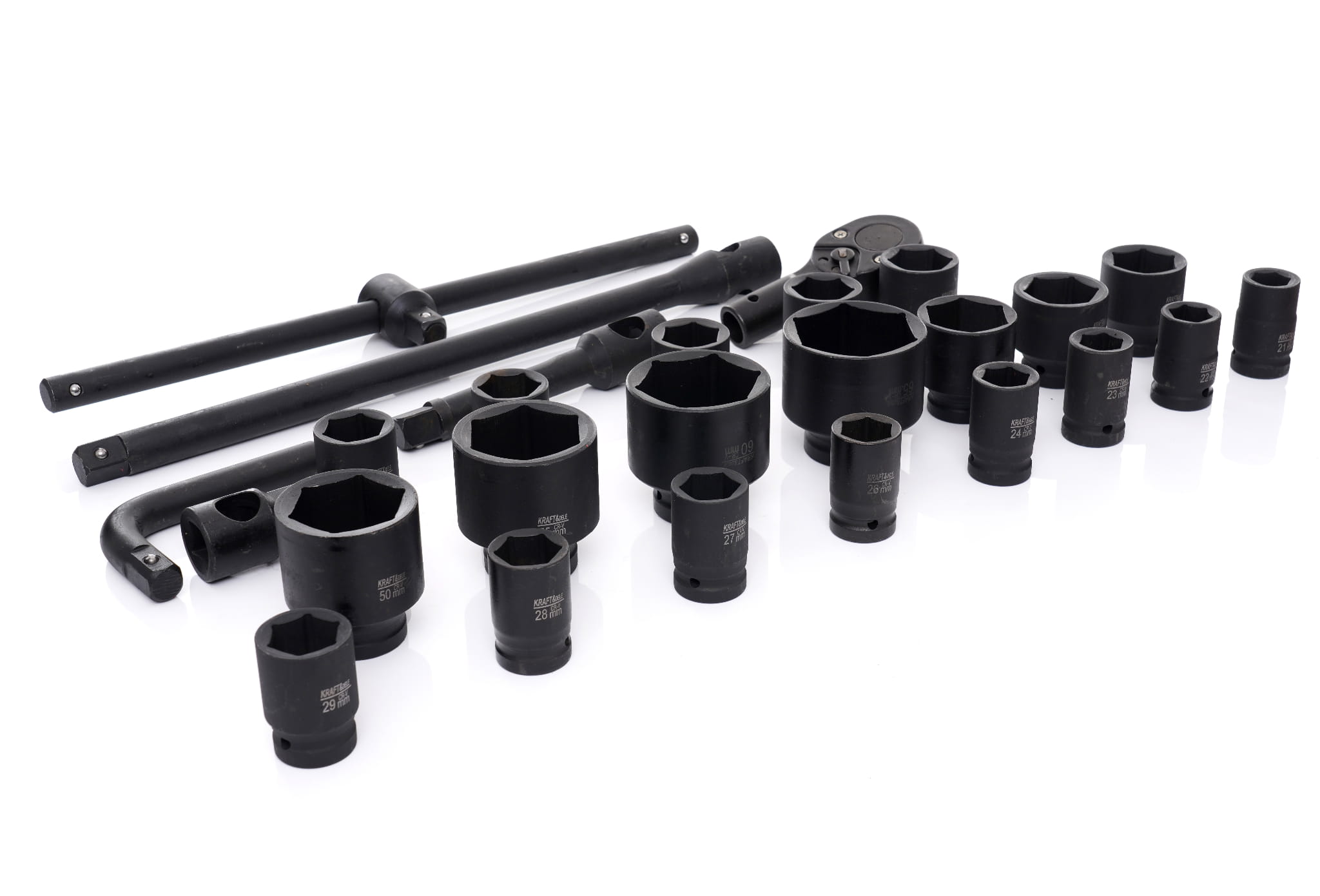 Zestaw nasadek udarowych sześciokątnych z napędem 3/4" i 1" przeznaczonych do współpracy z elektronarzędziami udarowymi, narzędziami pneumatycznymi oraz akumulatorowymi. Wykonane ze stali chromowo-molibdenowej Cr-Mo, dostarczane w walizce z organizacją elementów.
