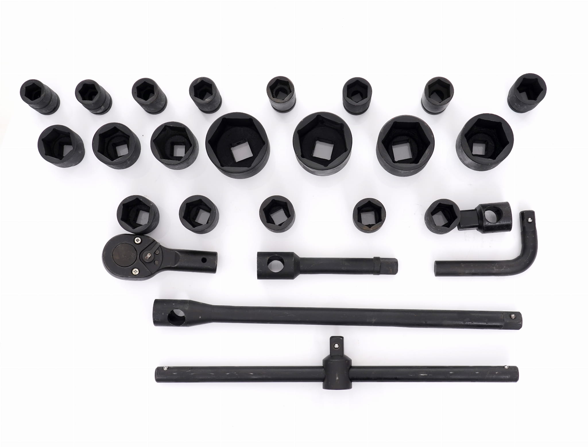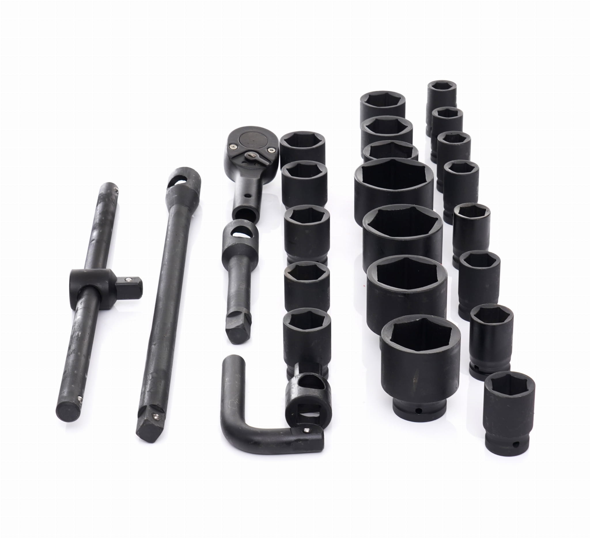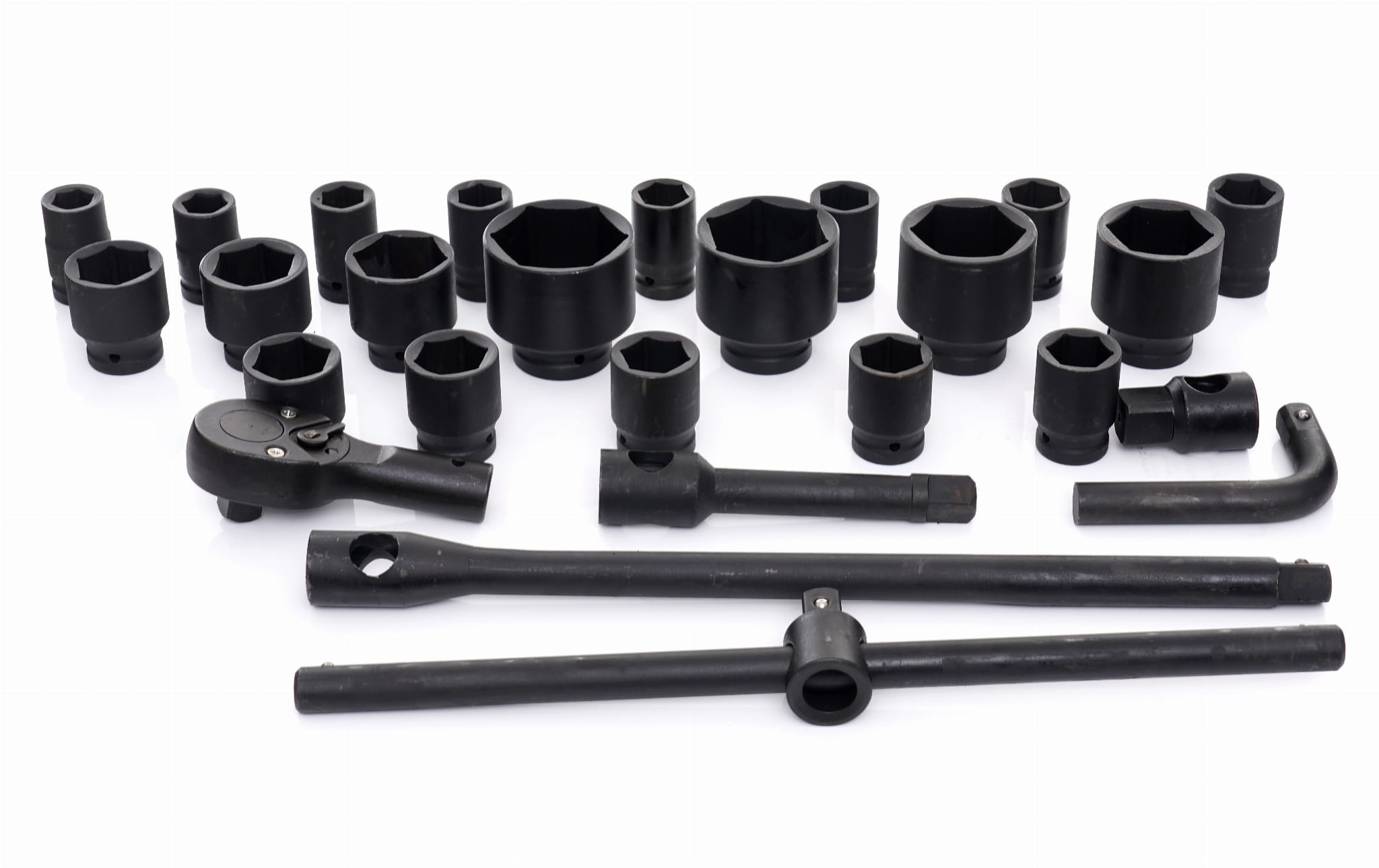 Zestaw nasadek udarowych sześciokątnych z napędem 3/4" i 1" przeznaczonych do współpracy z elektronarzędziami udarowymi, narzędziami pneumatycznymi oraz akumulatorowymi. Wykonane ze stali chromowo-molibdenowej Cr-Mo, dostarczane w walizce z organizacją elementów.