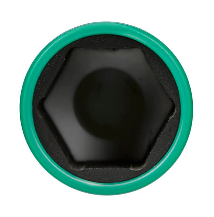 Gniazdo sześciokątne (6-kąt) zapewnia pełne przyleganie do nakrętki na całej długości ścianki, co ogranicza ryzyko ześlizgnięcia się nasadki i uszkodzenia łbów śrub przy pracy udarowej.