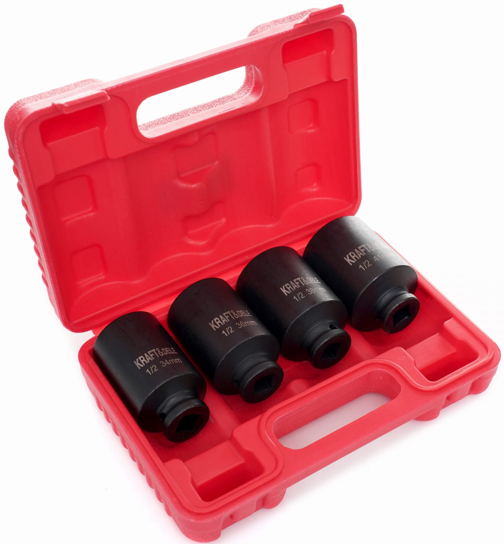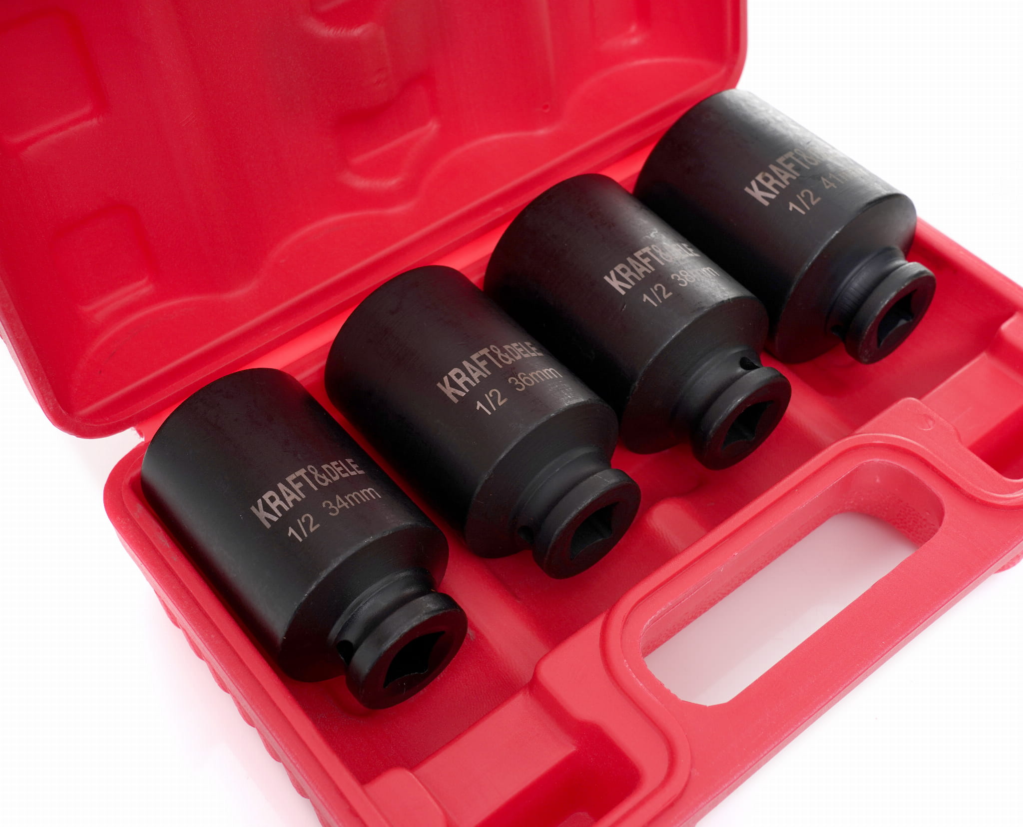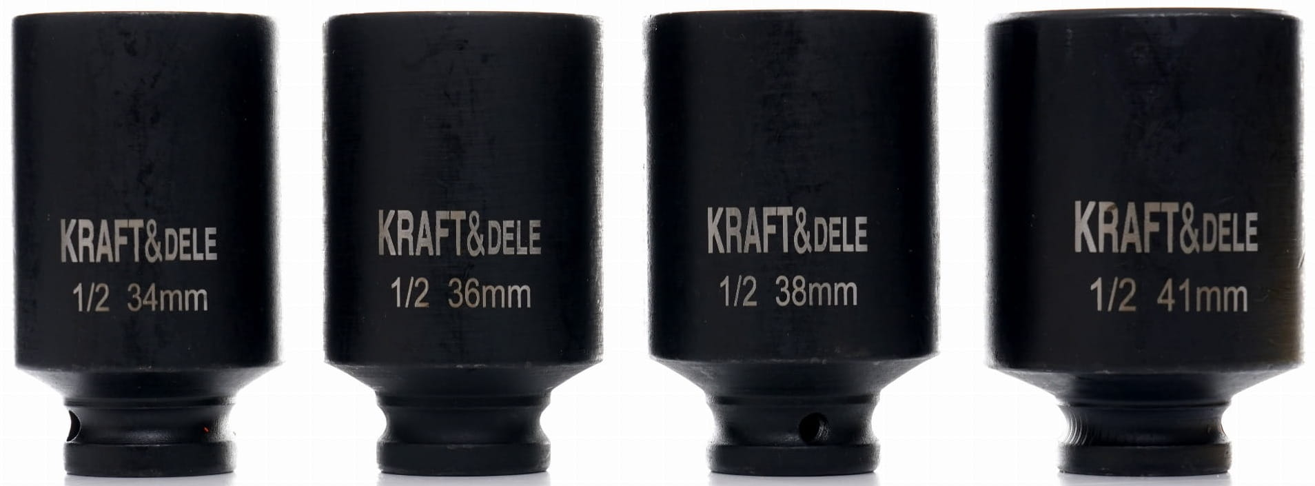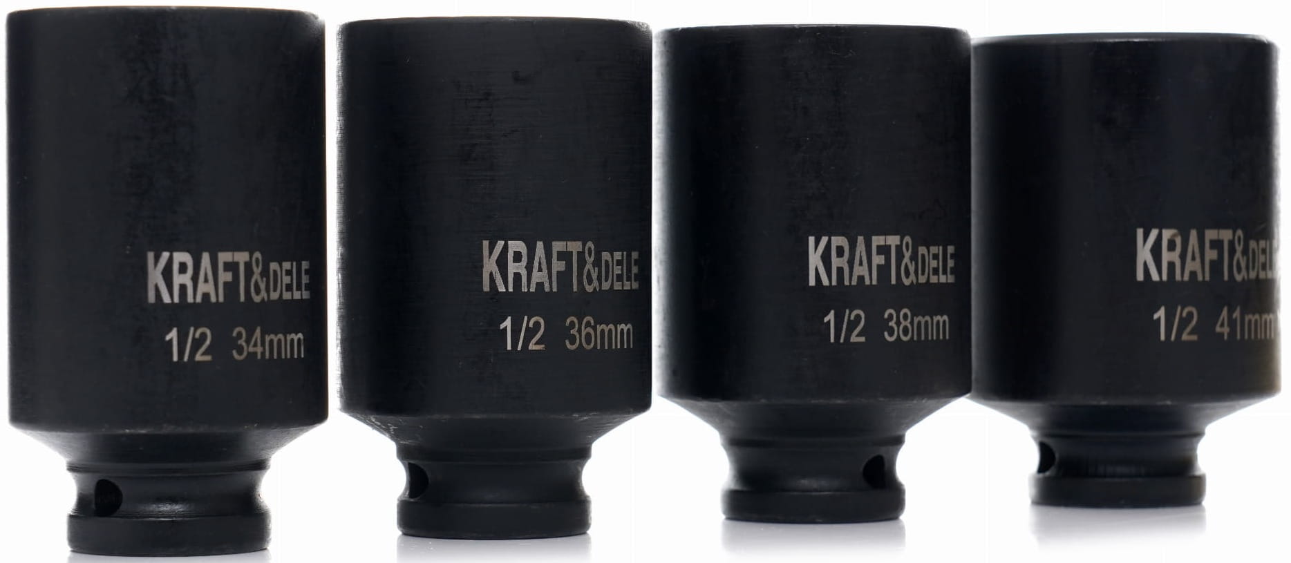 KD11754 to zestaw czterech nasadek udarowych z mocowaniem 1/2" w rozmiarach 34, 36, 38 i 41 mm. Nasadki wykonano ze stali chromowo-molibdenowej (Cr-Mo) i profilowano z 6-kątnym gniazdem, co zapewnia pełne osadzenie na łbie śruby podczas pracy z kluczami udarowymi pneumatycznymi, elektrycznymi oraz ręcznymi grzechotkami.