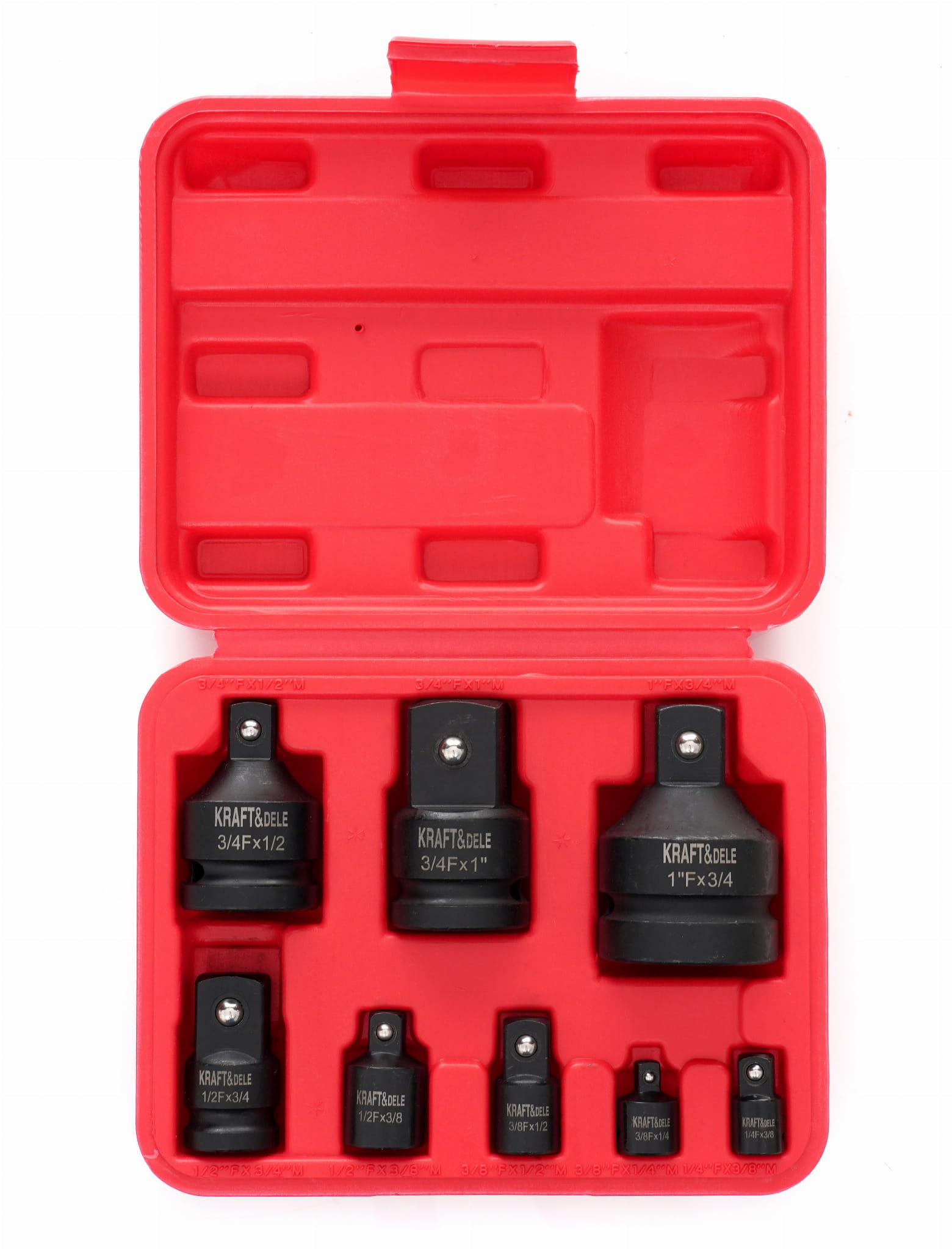 Zestaw zawiera 8 kombinacji redukcji obejmujących napędy 1/4", 3/8", 1/2", 3/4" i 1" — zarówno w kierunku zwiększającym (np. 1/2" na 3/4"), jak i zmniejszającym (np. 3/4" na 1/2"). Eliminuje konieczność posiadania osobnych redukcji do każdego narzędzia.