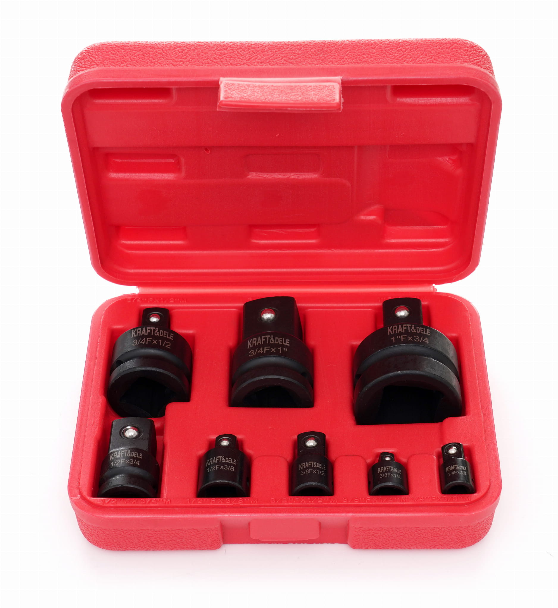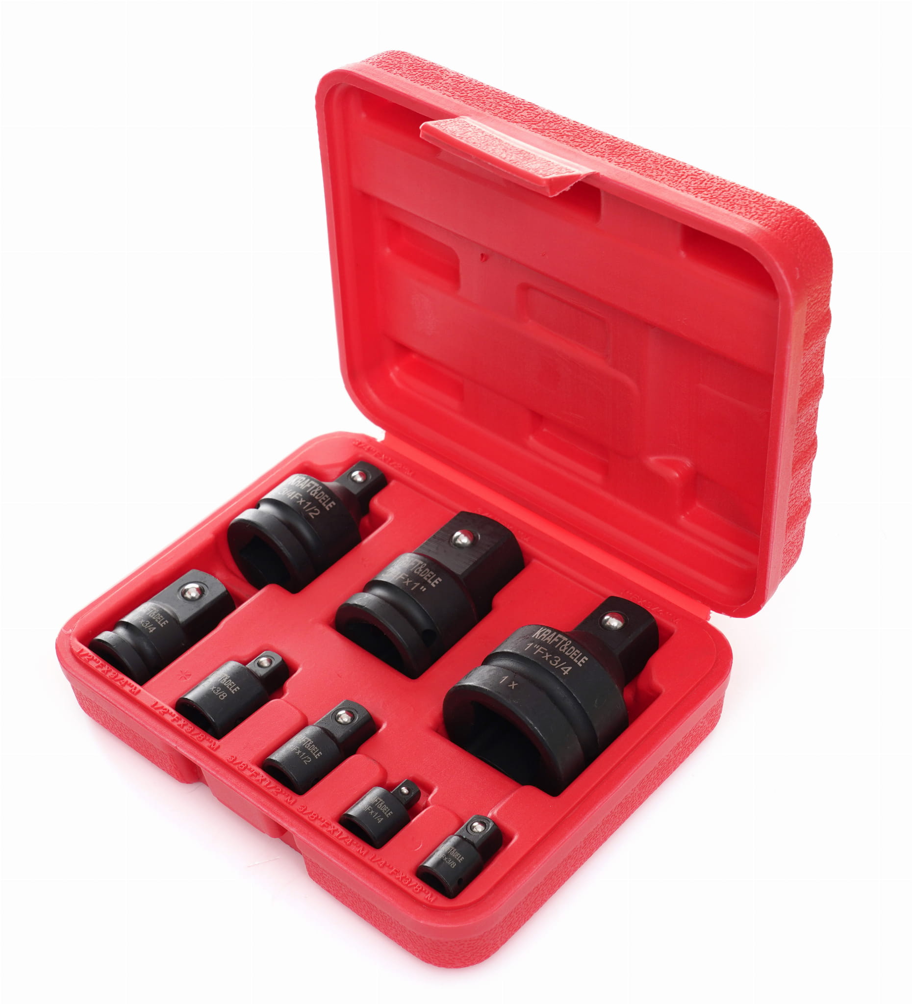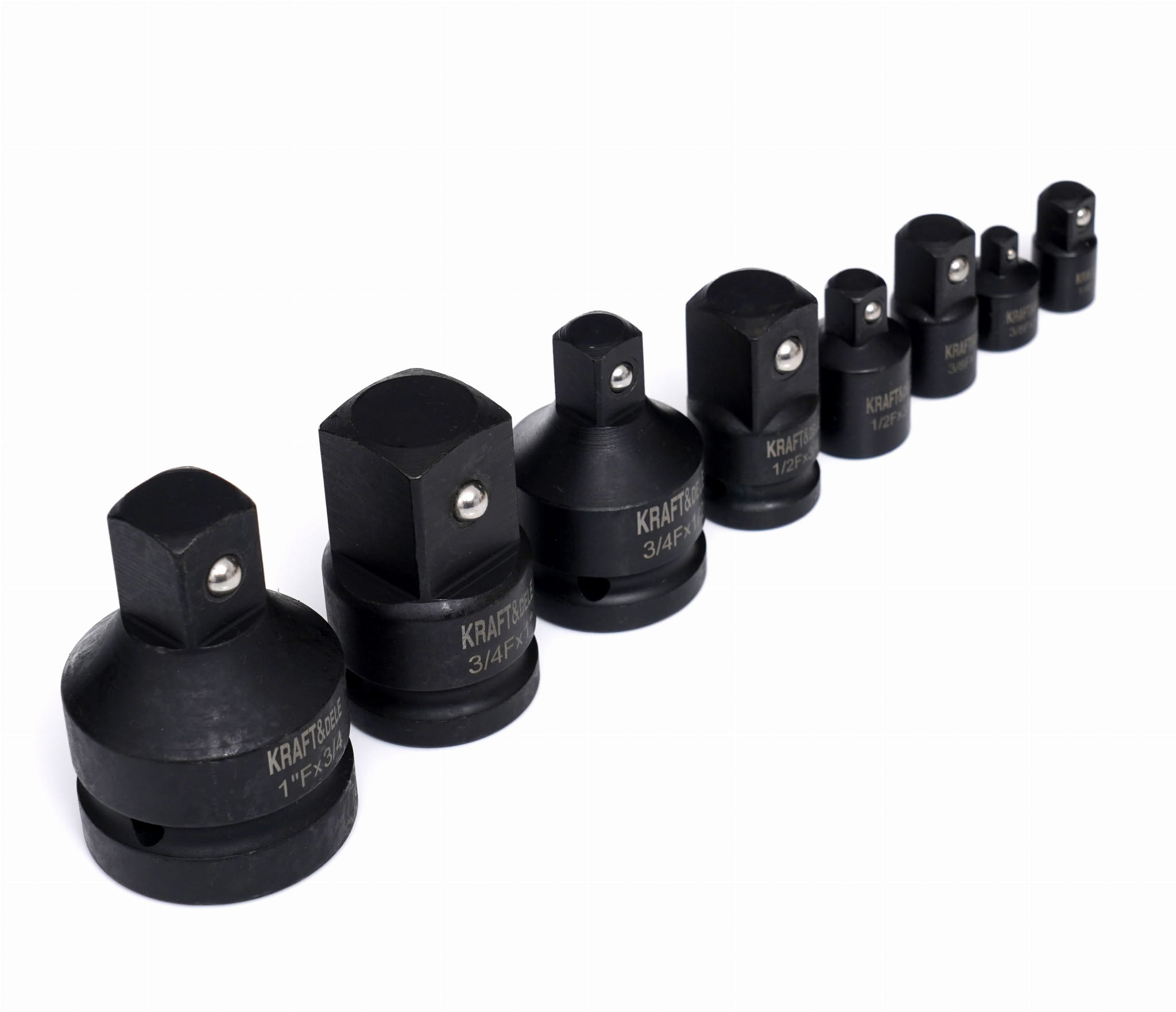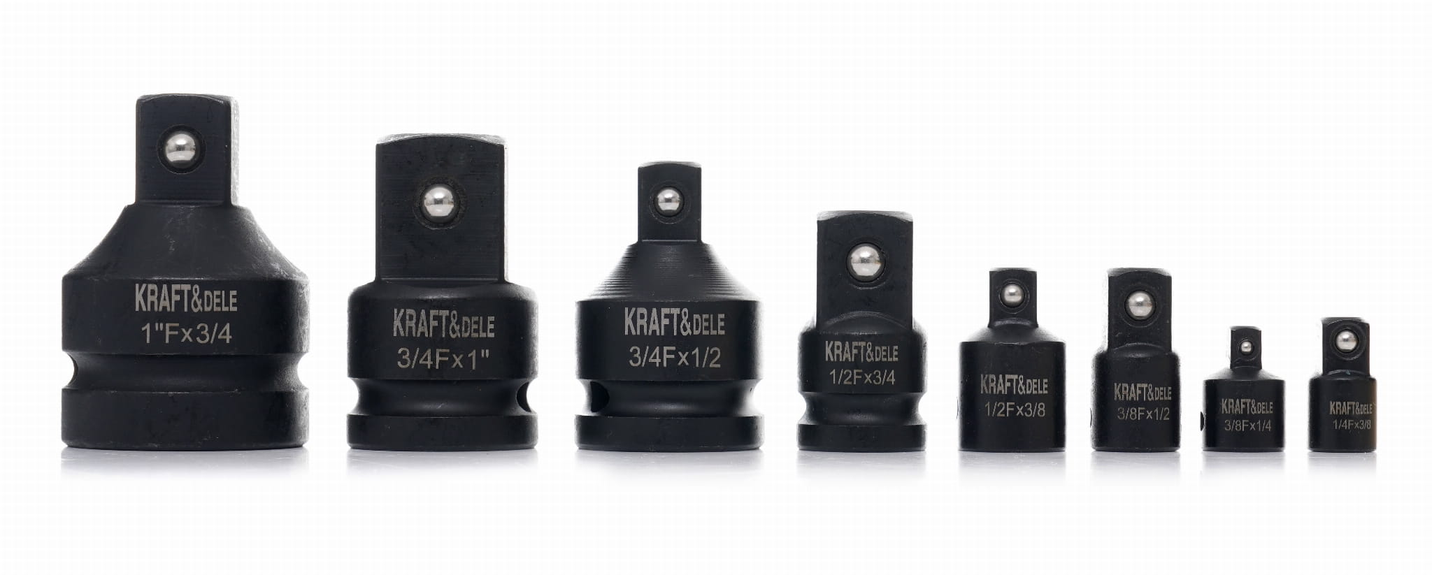 Zestaw ośmiu redukcji udarowych przeznaczonych do pracy z kluczami udarowymi pneumatycznymi i elektrycznymi. Elementy wykonane ze stali chromowo-molibdenowej (Cr-Mo), przystosowane do przenoszenia wysokich momentów obrotowych i udarów generowanych przez narzędzia udarowe. Zestaw pokrywa pełen zakres popularnych rozmiarów napędów — od 1/4" do 1".