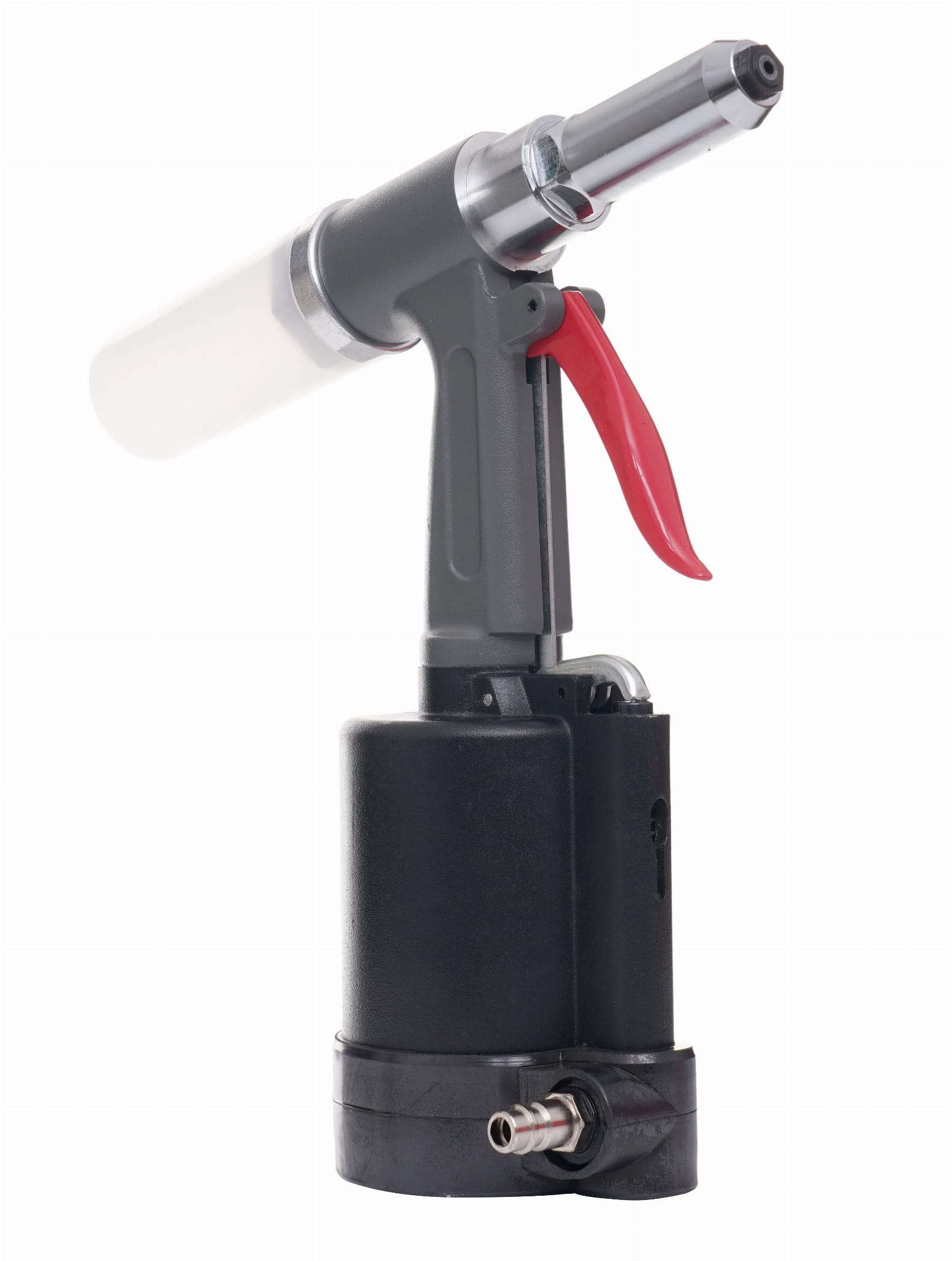 Pneumatyczna nitownica do nitów zrywalnych przeznaczona do trwałego łączenia elementów metalowych, z tworzyw sztucznych i kompozytowych. Urządzenie pracuje w zakresie ciśnienia 6–8 bar i obsługuje nity o trzech popularnych średnicach, co pozwala na stosowanie go w szerokim spektrum prac montażowych i warsztatowych.