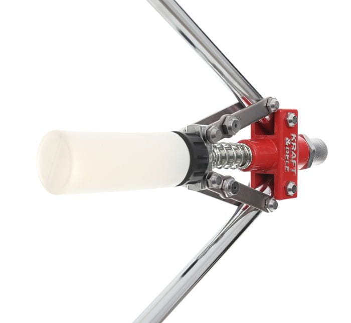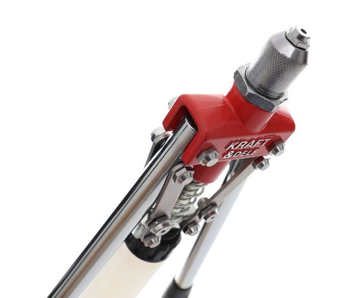Uchwyty z aluminiowych rurek są lżejsze od stalowych odpowiedników, co zmniejsza całkowitą wagę narzędzia. Gumowa, antypoślizgowa nakładka poprawia pewność chwytu podczas pracy, szczególnie przy nitowaniu trudno dostępnych miejsc.
