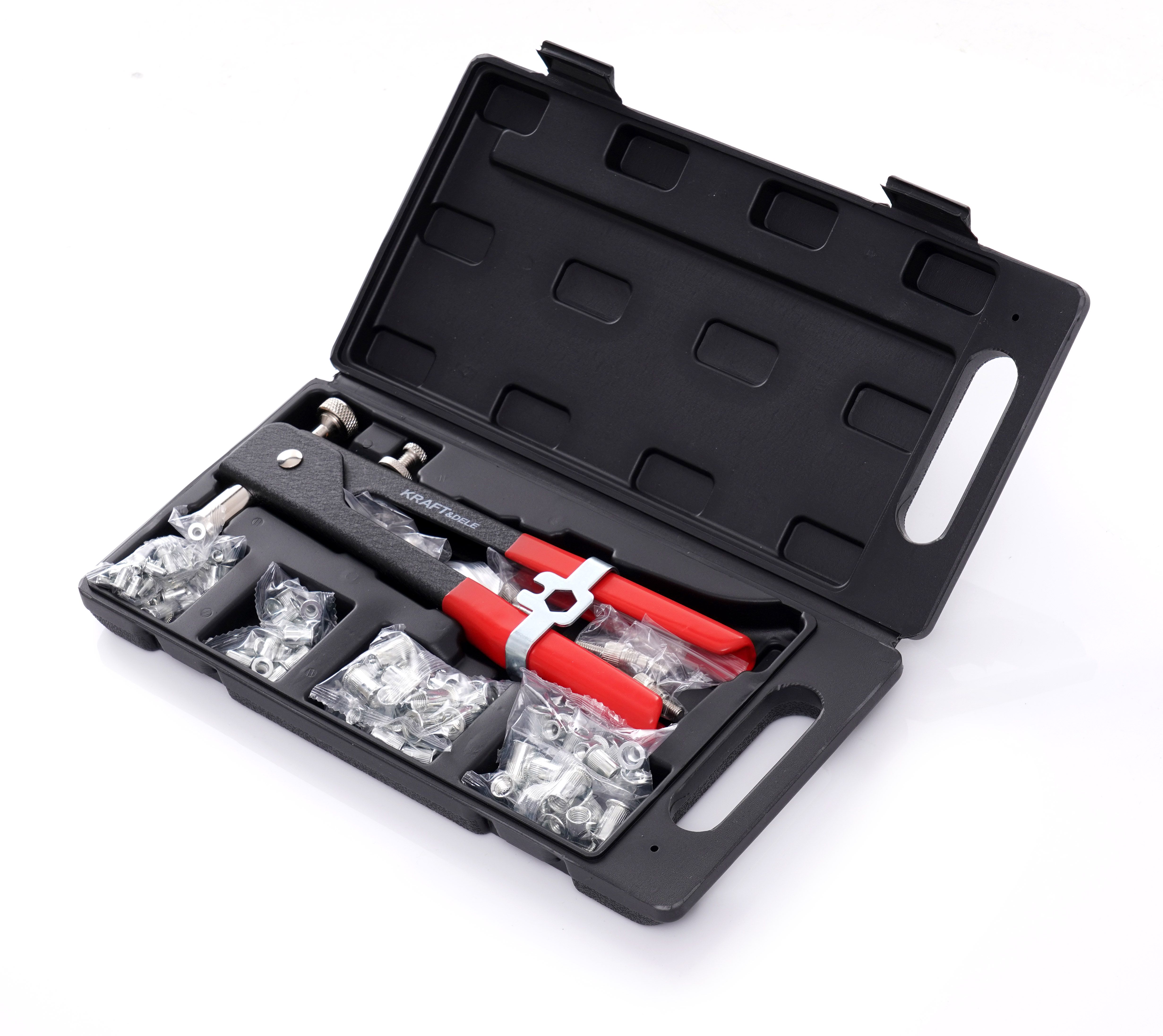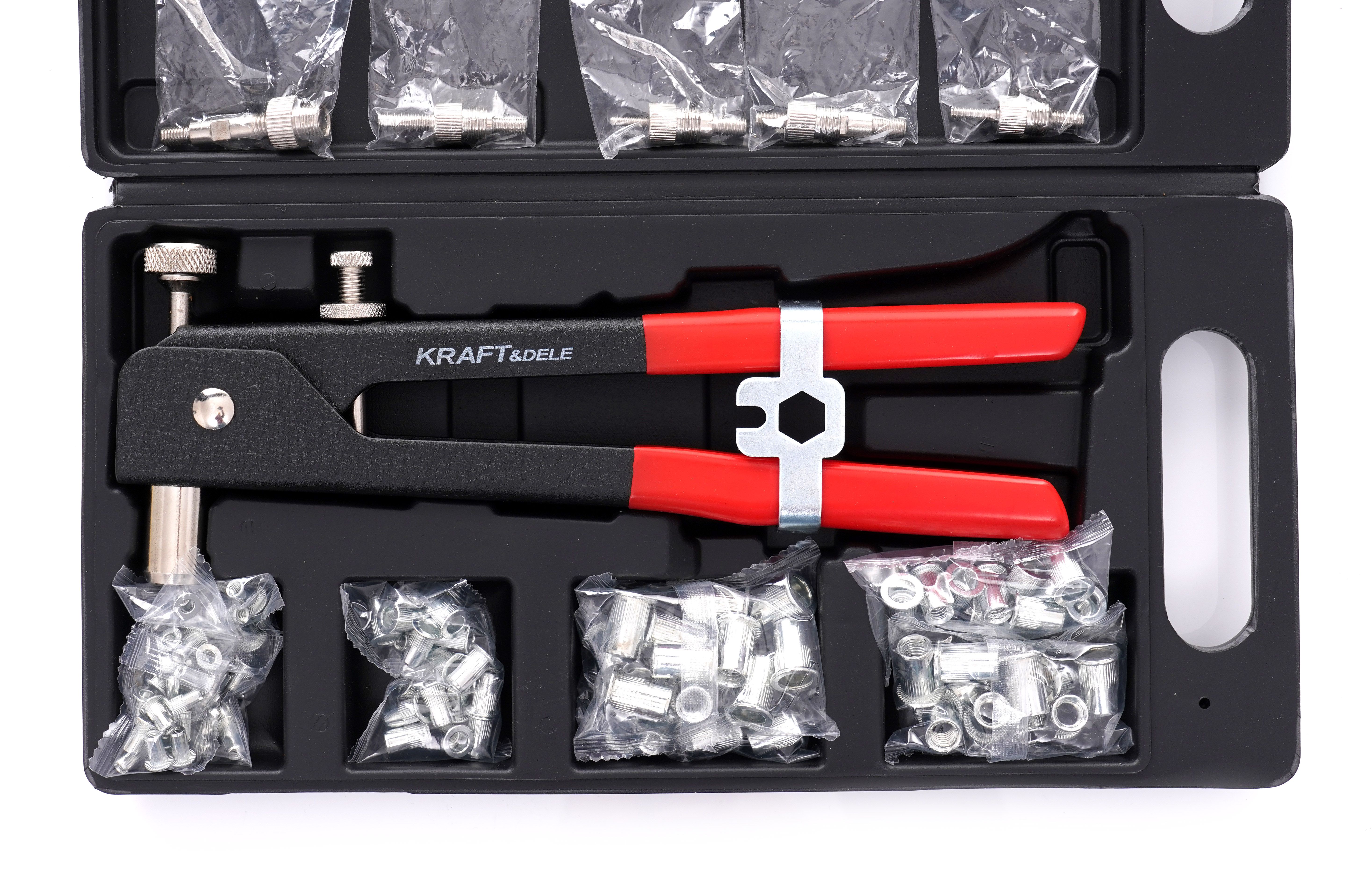 W komplecie otrzymujesz nitownicę ręczną do nitonakrętek KRAFT&DELE wraz z głowicami, trzpieniami oraz nitami, a całość jest zapakowana w poręczną walizkę.