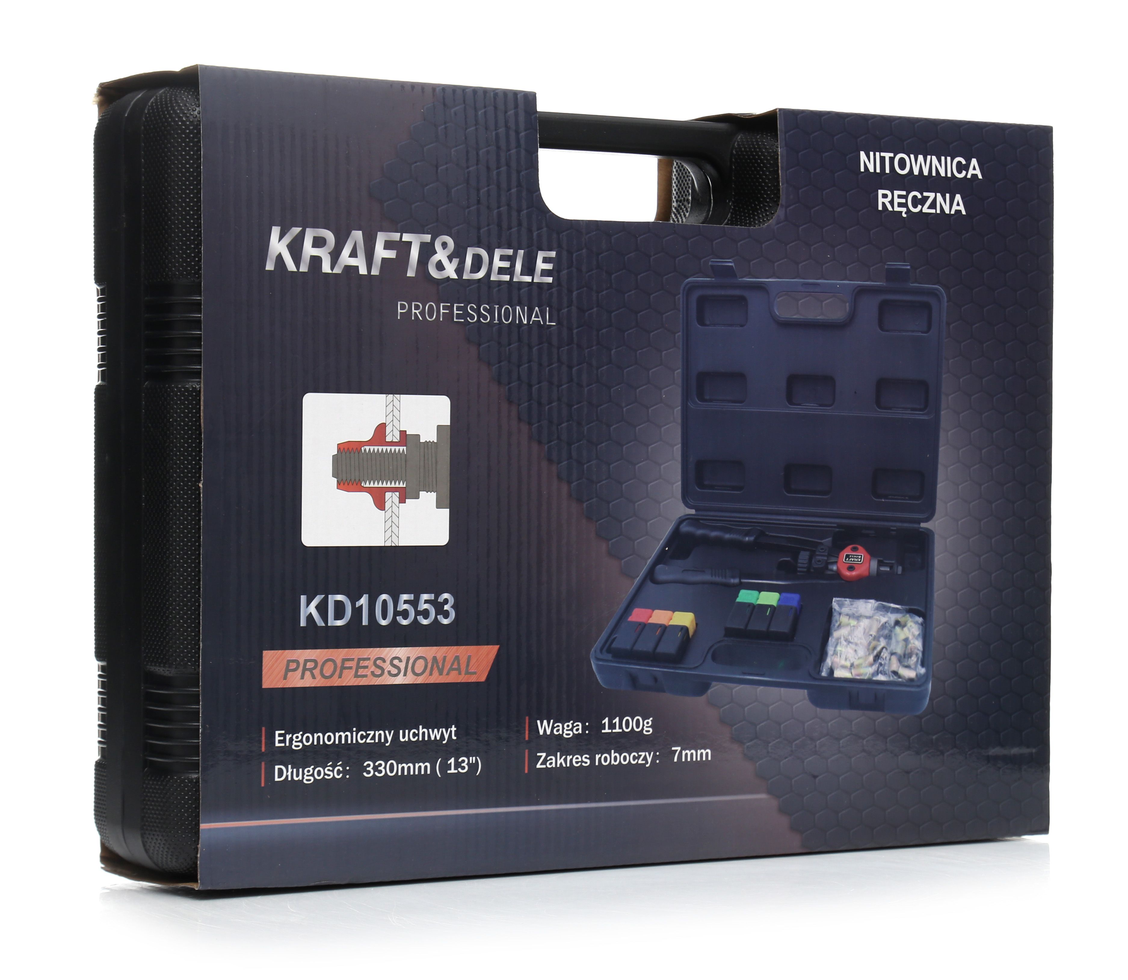 Nitownica ręczna do nitonakrętek KD10553 / KD10553 / KRAFT&DELE to solidna nitownica ręczna zaprojektowana do wykonywania połączeń gwintowanych w nitonakrętkach. Jeśli zależy Ci na wygodnej pracy, uniwersalnym zakresie M3–M10 i komplecie w walizce, model KD10553 będzie praktycznym uzupełnieniem warsztatu.