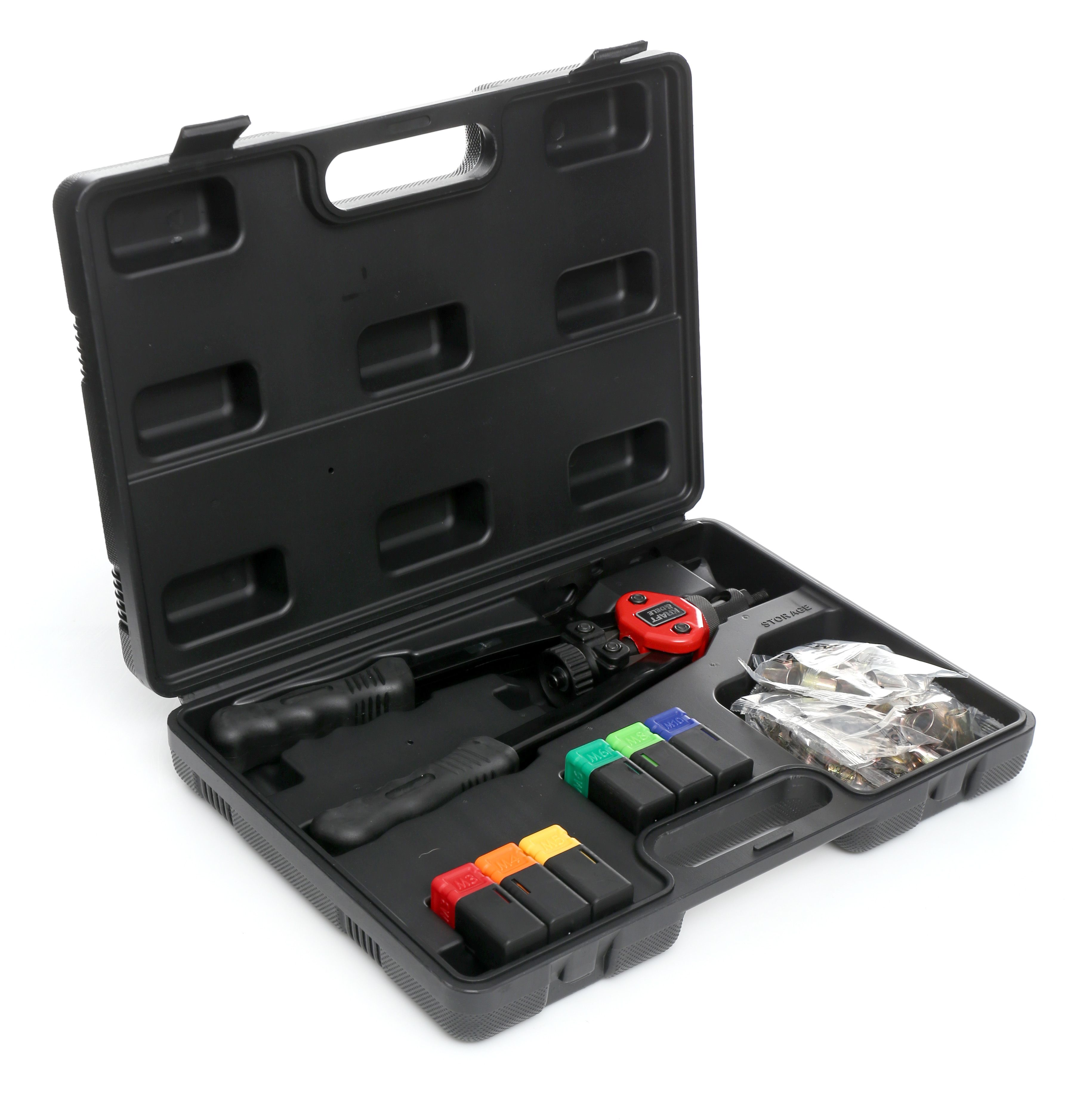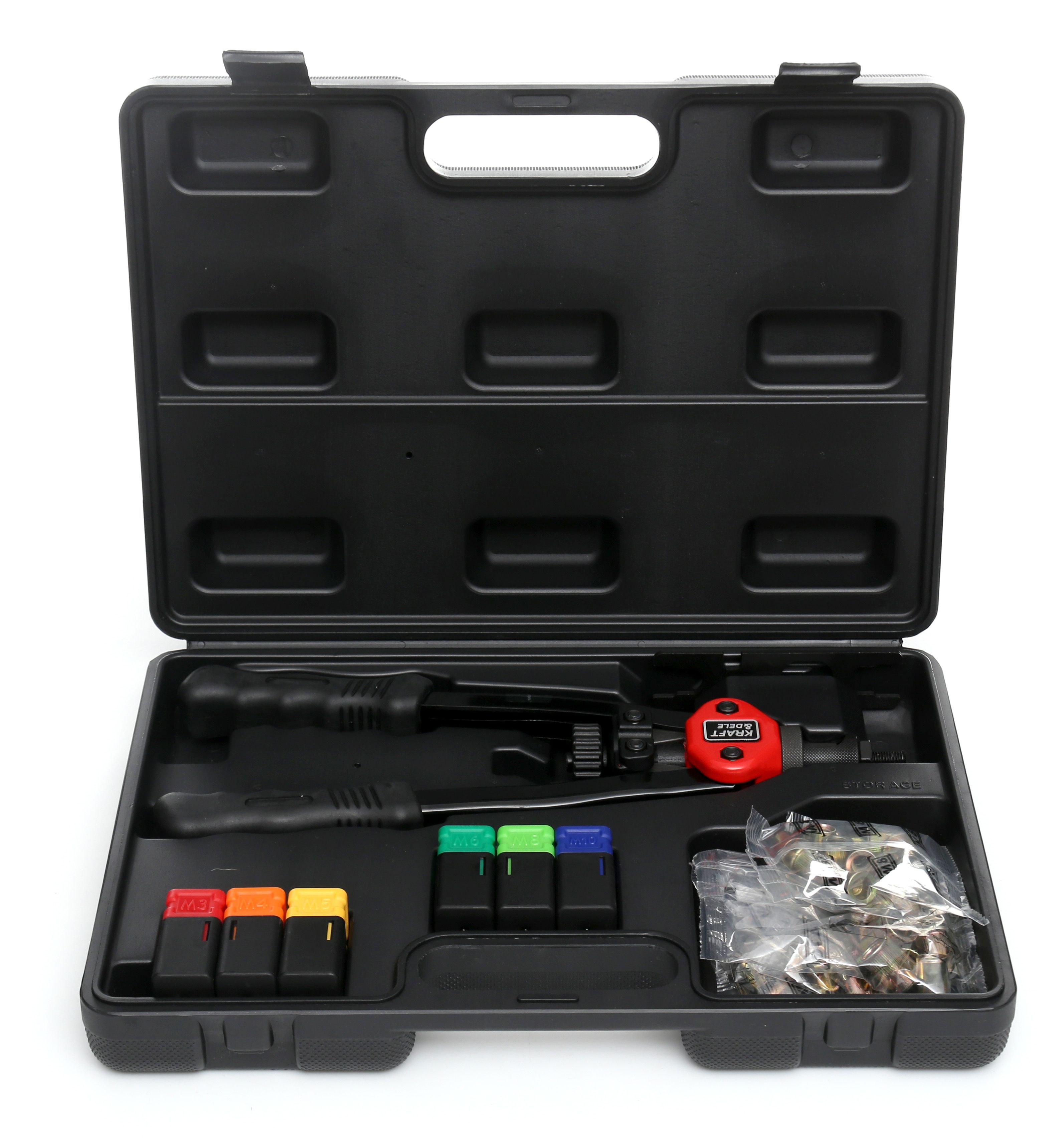 Walizka pozwala wygodnie przechowywać nitownicę ręczną do nitonakrętek i zabrać zestaw na montaż.