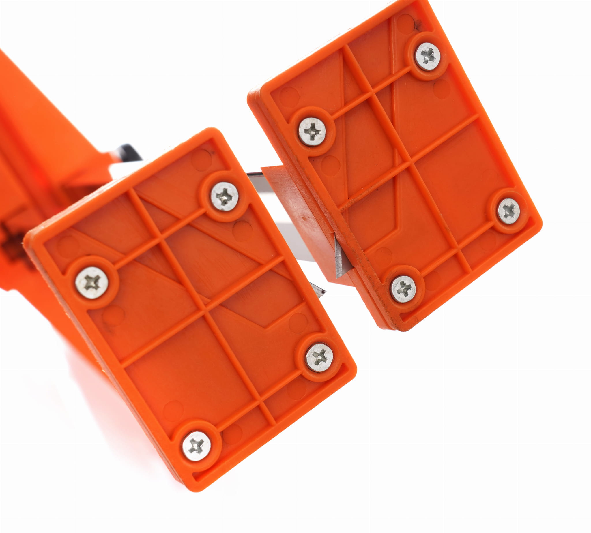 Obcinak wyposażono w dwa ostrza stalowe działające obustronnie — nacinają górną i dolną warstwę kartonu płyty jednocześnie. Eliminuje to konieczność odwracania płyty i wykonywania dwóch osobnych nacięć, co skraca czas cięcia i redukuje ryzyko nierównego przełamania.