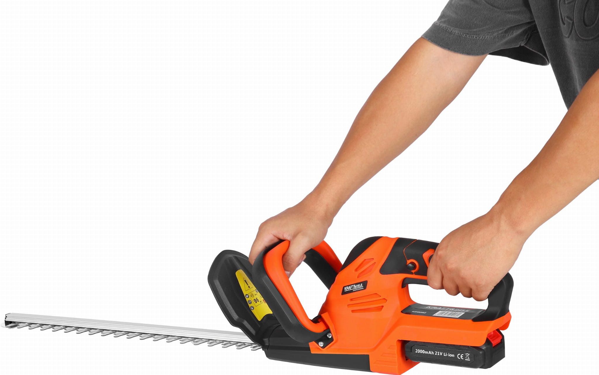 KD5092 to akumulatorowe nożyce ogrodowe z silnikiem bezszczotkowym, przeznaczone do przycinania żywopłotów, krzewów i zieleni ozdobnej. Zestaw zawiera dwa akumulatory 21V/2000mAh, ładowarkę oraz kompletne wyposażenie ochronne, co umożliwia ciągłą pracę bez przerw na ładowanie.