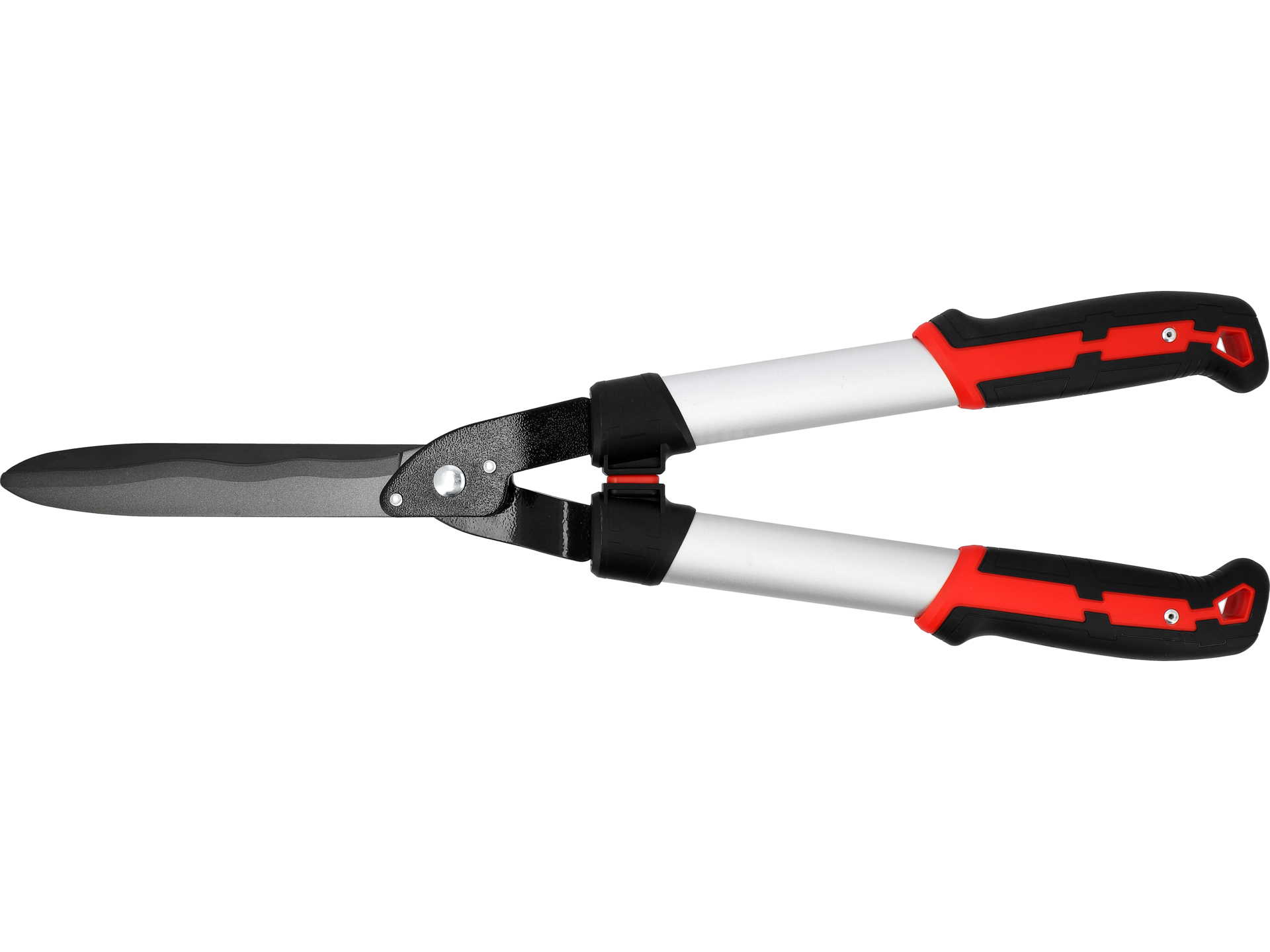 Nożyce ogrodowe z falistym ostrzem ze stali węglowej 65 Mn i powłoką PTFE, przeznaczone do przycinania żywopłotów i krzewów ozdobnych. Aluminiowa konstrukcja rękojeści z ergonomicznymi uchwytami TPR zapewnia niską wagę przy długości roboczej 610 mm.
