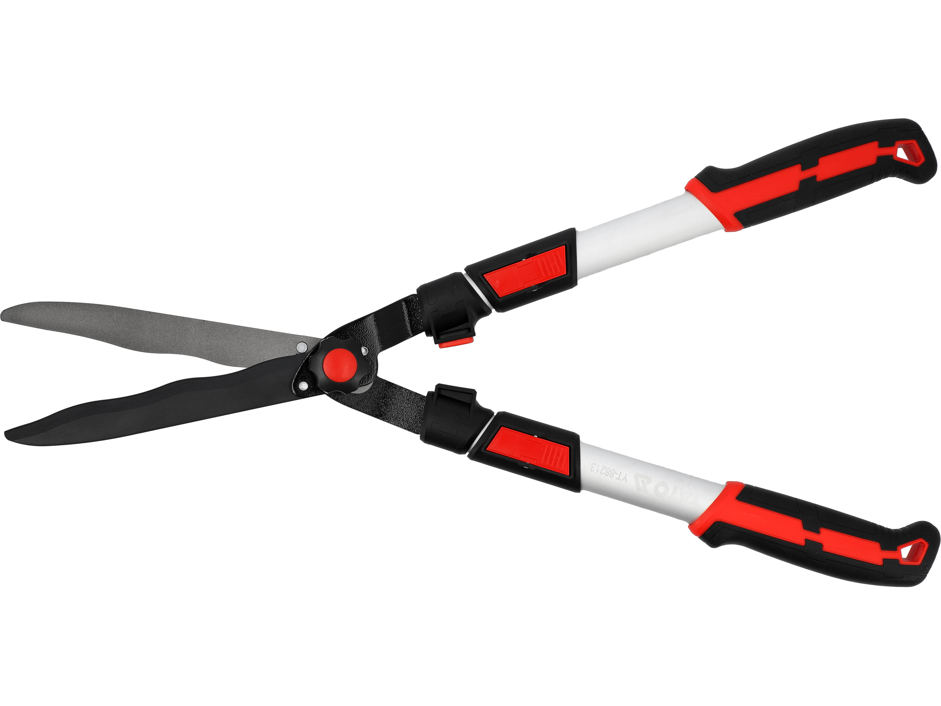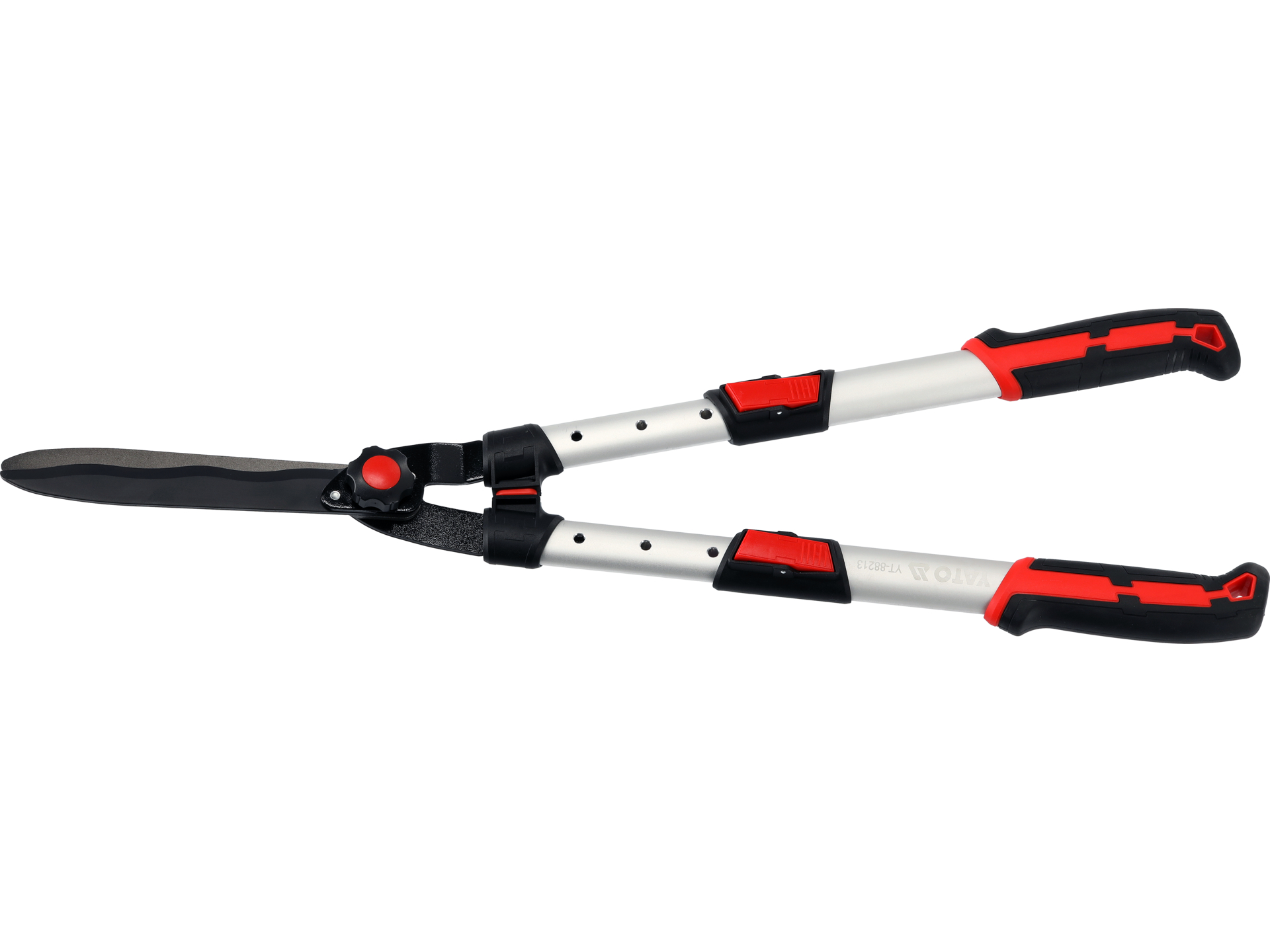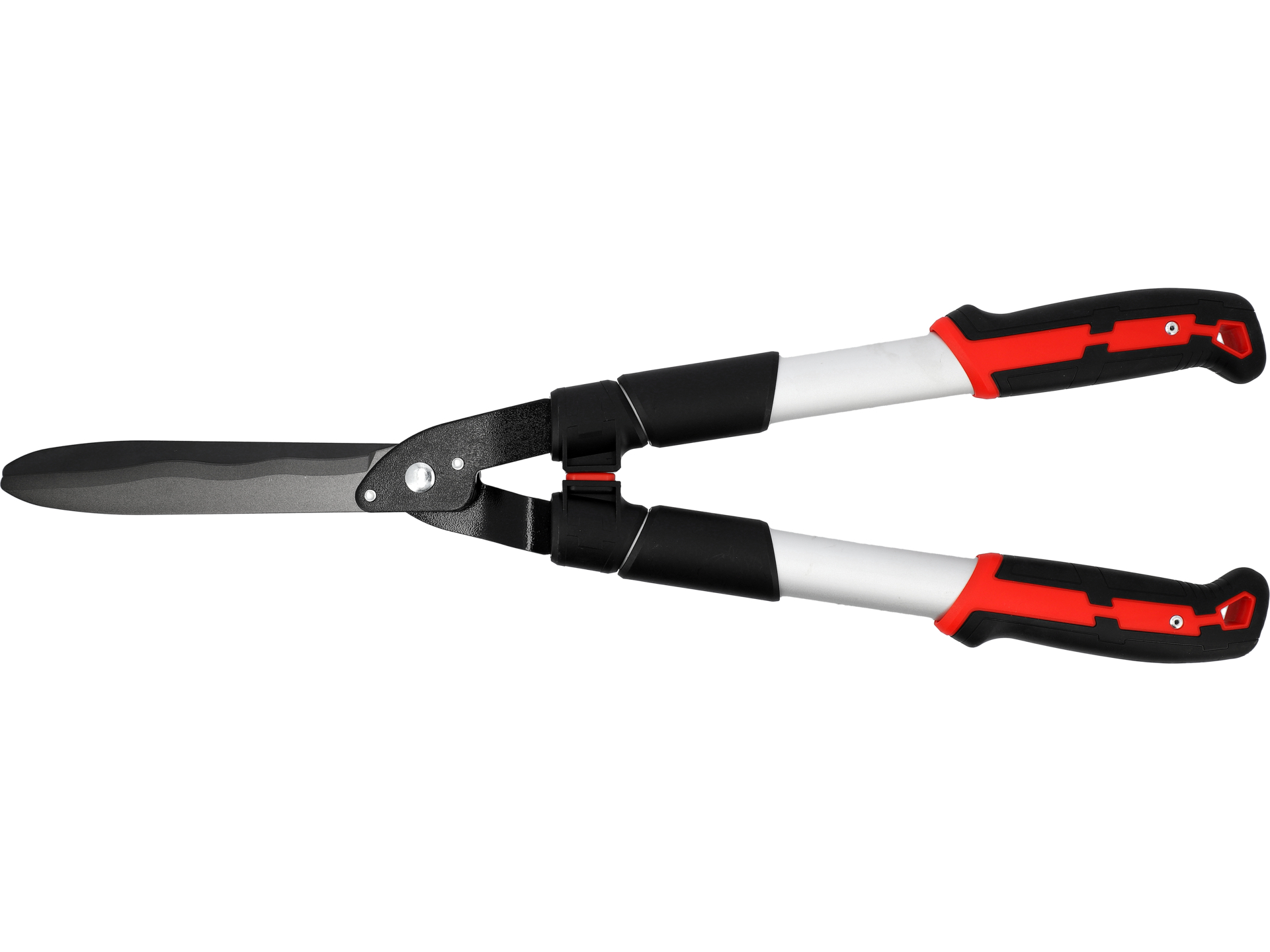 Teleskopowe nożyce ogrodowe z falistymi ostrzami ze stali węglowej 65 Mn, przeznaczone do precyzyjnego przycinania żywopłotów i krzewów. Regulowana długość od 660 do 825 mm umożliwia pracę na różnych wysokościach bez użycia drabiny.