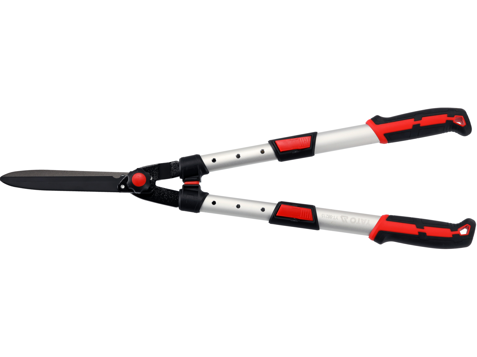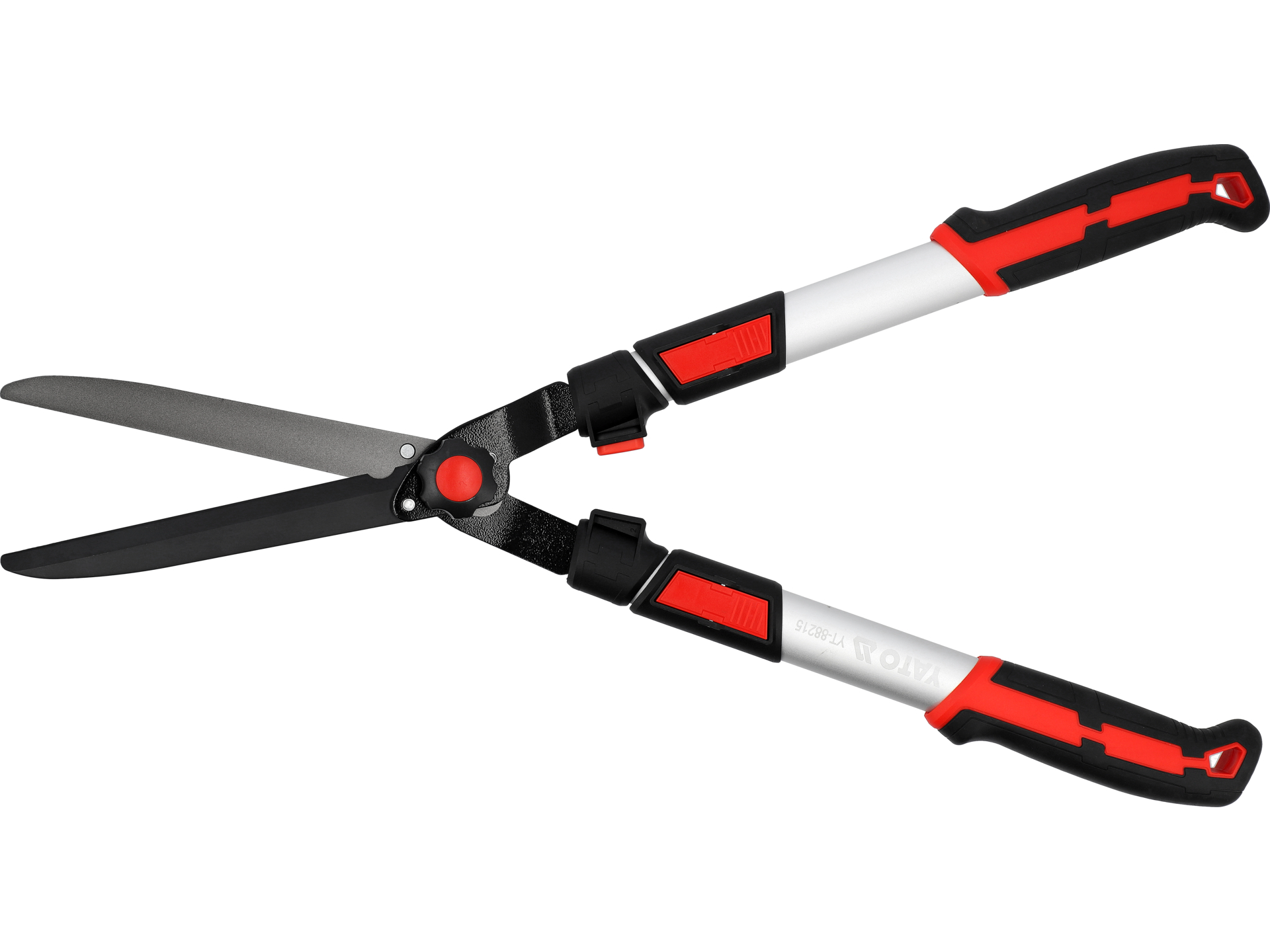 Nożyce do żywopłotu z regulowaną długością rękojeści aluminiowych, przeznaczone do przycinania krzewów i formowania żywopłotów bez konieczności używania drabin. Ostrza proste ze stali węglowej 65 Mn z powłoką PTFE zapewniają trwałość i płynność cięcia gałęzi o średnicy do 6 mm.