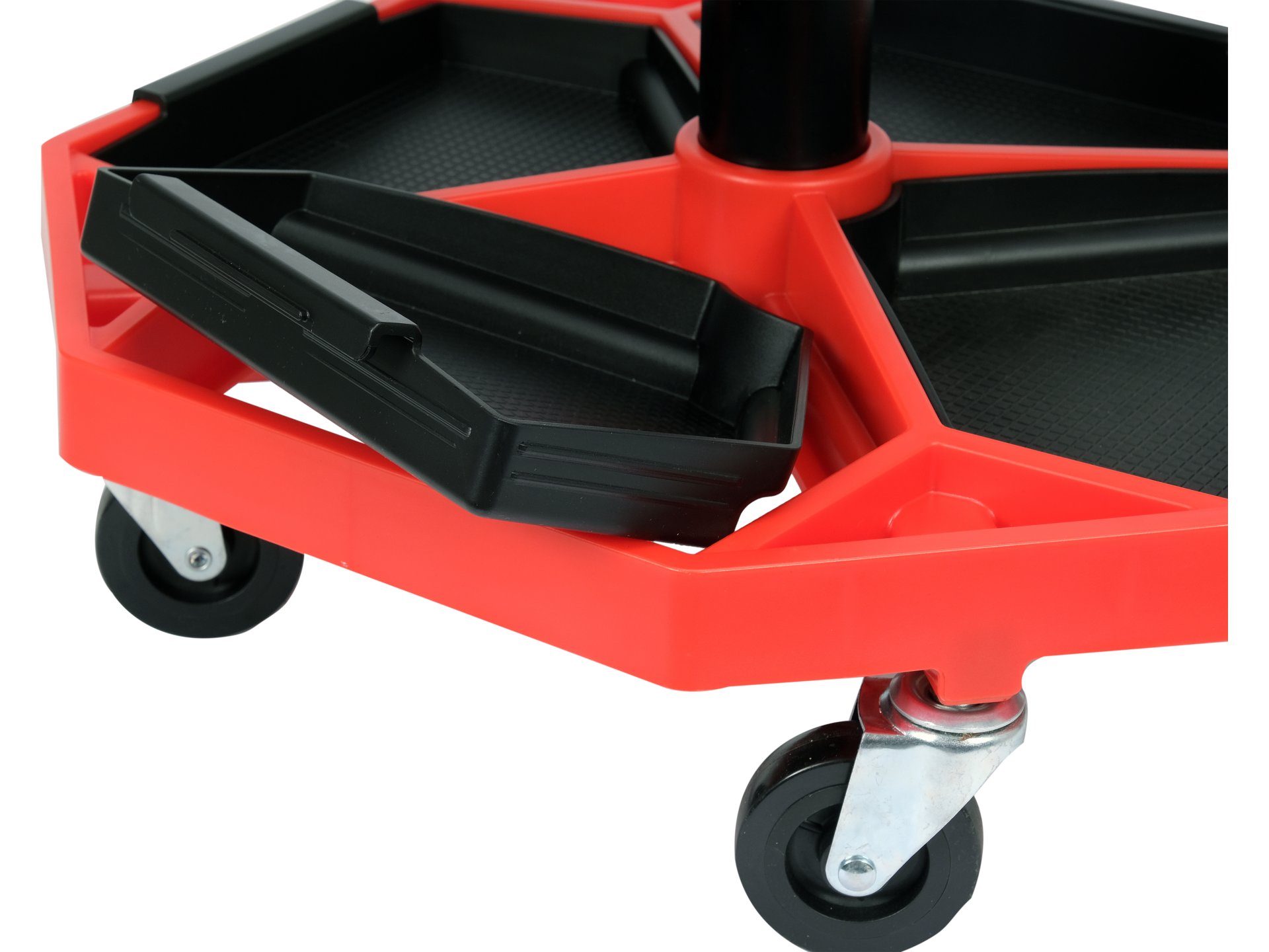 Stołek warsztatowy na kółkach z regulacją wysokości, przeznaczony do pracy w warsztatach samochodowych, mechanicznych oraz pomieszczeniach technicznych. Wyposażony w teleskopowy mechanizm regulacji, stalową konstrukcję oraz 4 obrotowe kółka z łożyskami kulkowymi.
