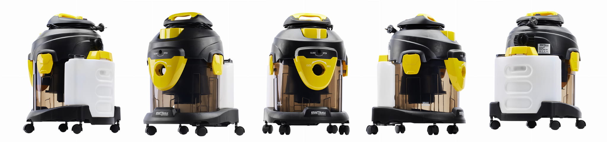 Zbiornik na środek piorący wykonany jest z półprzezroczystego tworzywa, co umożliwia kontrolę poziomu cieczy bez przerywania pracy. Regulacja mocy silnika pozwala dostosować intensywność ssania do rodzaju czyszczonej powierzchni — od delikatnych dywanów po zabrudzenia warsztatowe.