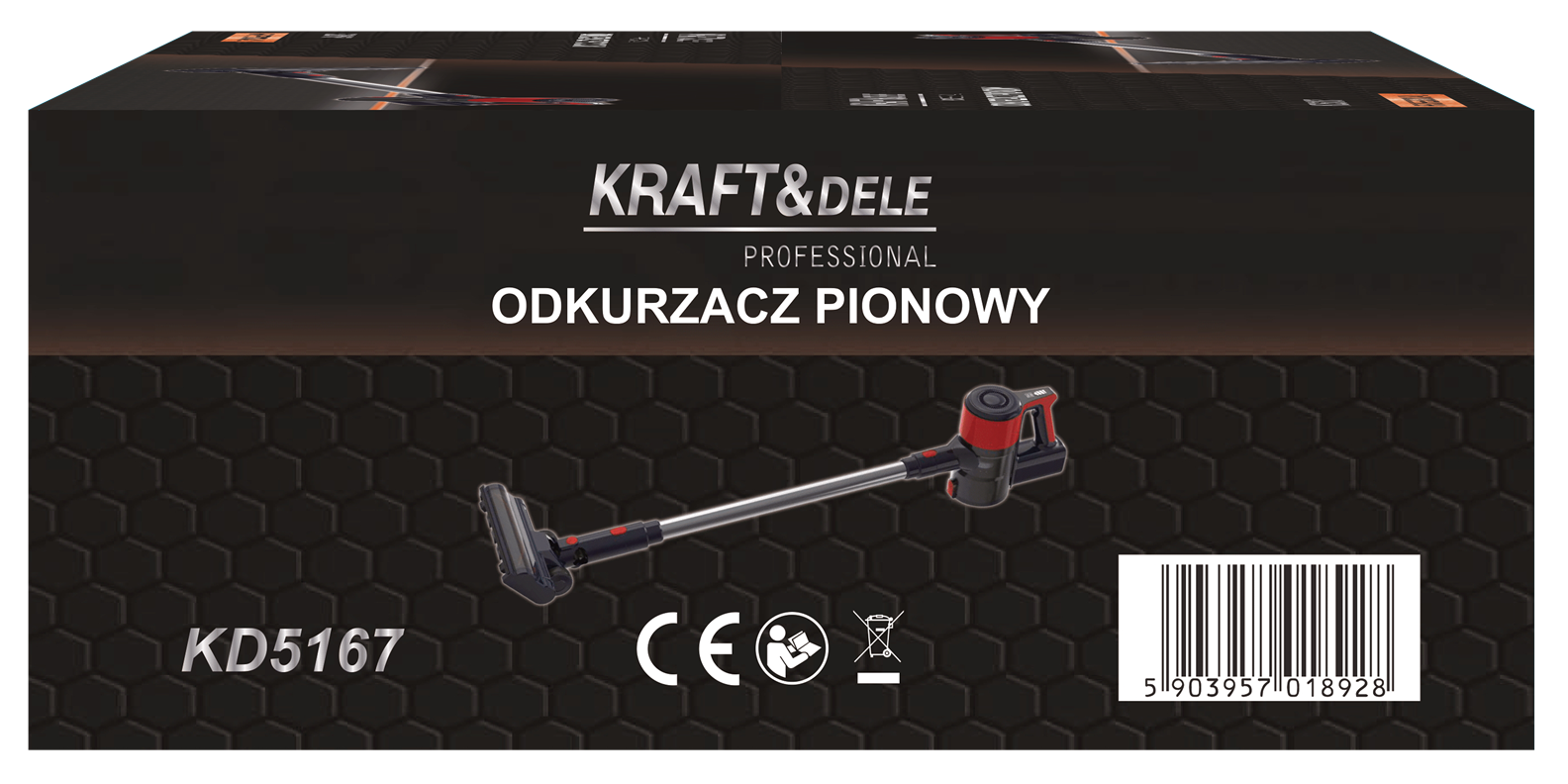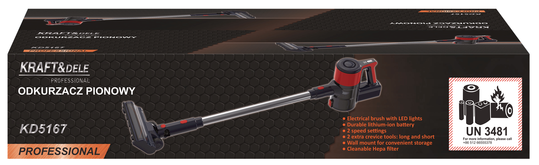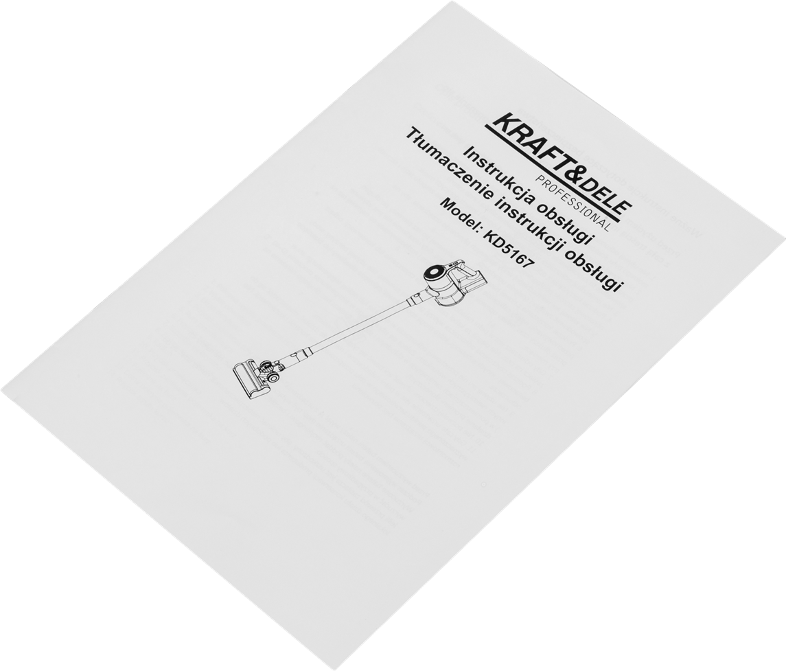 KD5167 to bezprzewodowy odkurzacz pionowy zasilany wbudowanym akumulatorem litowo-jonowym o pojemności 2500mAh. Urządzenie wyposażono w elektryczną szczotkę z podświetleniem LED, filtr HEPA z możliwością wielokrotnego czyszczenia oraz dotykowy panel sterowania z wyświetlaczem LED. W zestawie znajdują się trzy końcówki sprzątające, zasilacz i uchwyt ścienny do przechowywania.